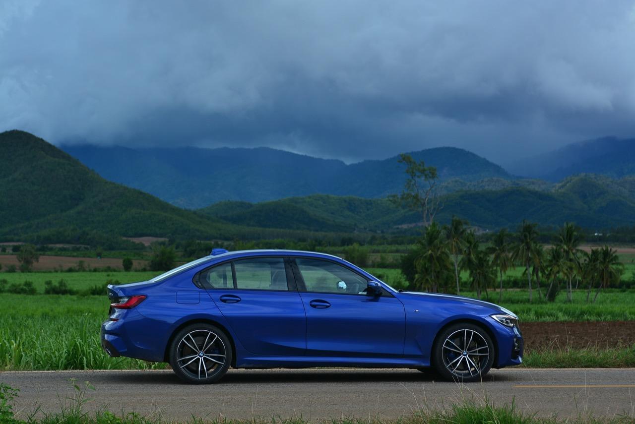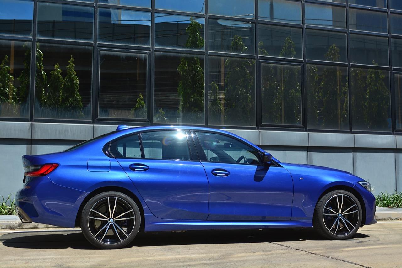 การปรับปรุงงานออกแบบทำให้ G20 ดูเป็นรถของผู้ชายมากกว่า F30 จากเหลี่ยมมุมต่างๆ รอบตัวรถ มุมมองด้านข้างสมส่วนความเป็นรถเยอรมันยุคใหม่ เสาหน้าเอนลาดสอดรับกับผืนหลังคาที่ค่อยๆ ลาดเทลงไปยังส่วนท้าย BMW ออกแบบเสาท้ายของ G20 ให้บางเฉียบ เส้นด้านข้างตัวถังลากจากชายล่างของแก้มข้างไปจนถึงกลางประตูบานหลัง เป็นเส้นนำสายตาที่หมดจดและเฉียบคม มือจับที่เปิดบานประตูสีเดียวกับตัวถัง กรอบกระจกบานประตูหุ้มด้วยวัสดุโลหะสีดำเงา ฝาถังเชื้อเพลิงอยู่ในตำแหน่งด้านขวาซึ่งกลายเป็นของที่คุ้นเคยของนักเลง BMW ไฟท้าย LED ทรงยาวแบบใหม่มีดีไซน์ที่เข้ากับแนวของฝาท้ายได้อย่างกลมกลืน สปอยเลอร์หลังของ M เต็มไปด้วยรายละเอียด รวมไปถึงท่อระบายไอเสียทรงกลมสองท่อแบบแยกฝั่งละท่อ ที่ชอบมากก็คือฝาท้ายออกแบบให้มีสันนูนซึ่งมีส่วนช่วยเหนี่ยวนำกระแสลมมากดลงบริเวณส่วนท้ายเมื่อใช้ความเร็วสูง