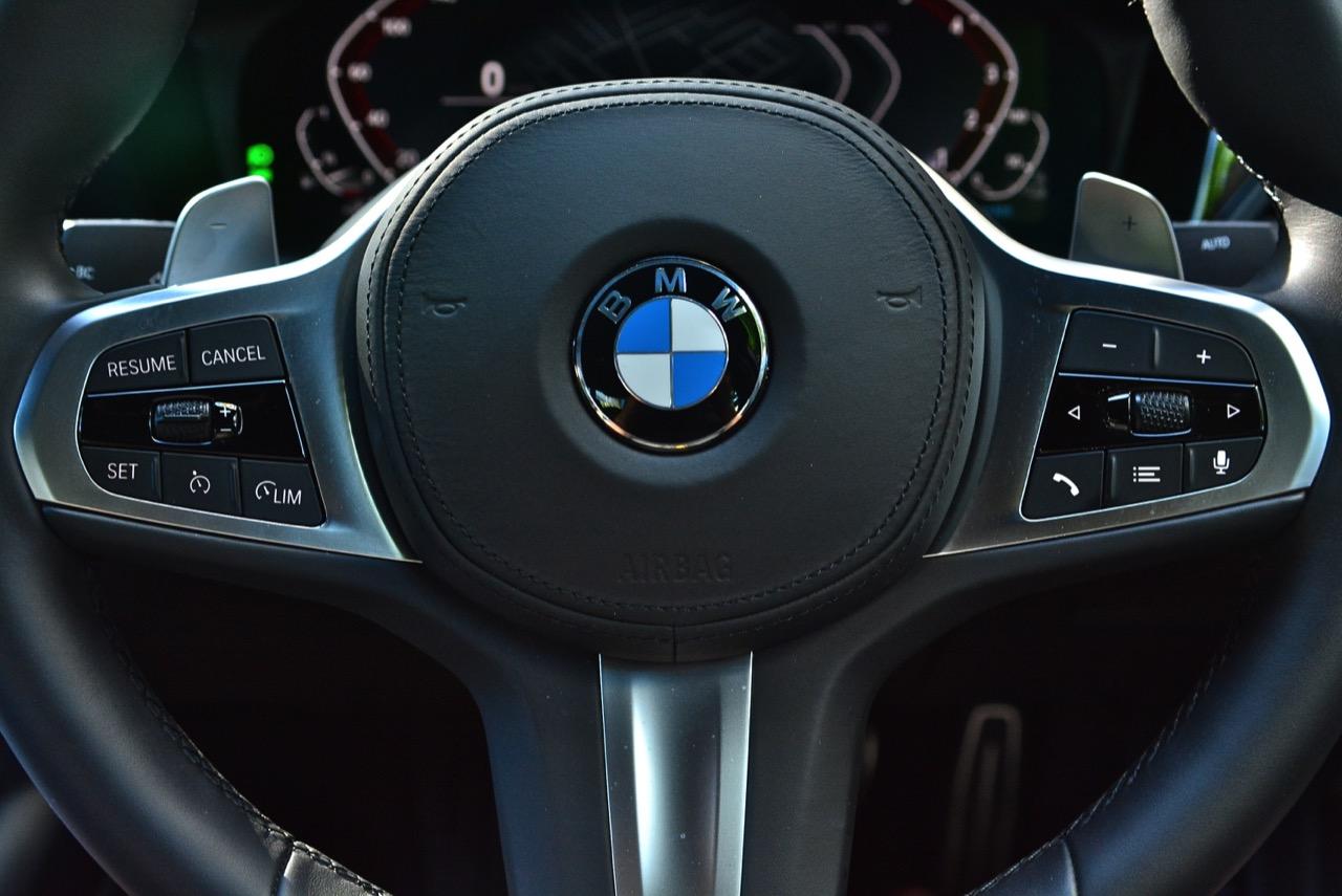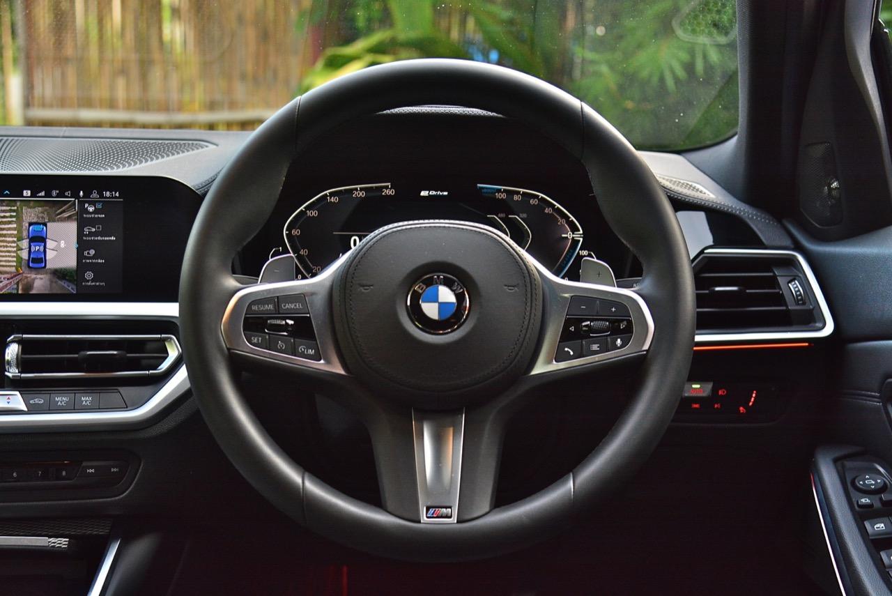 นอกจากหน้าปัดมาตรวัดจอภาพแบบใหม่ สิ่งที่คุณจะต้องจับถือไปตลอดการขับนั่นก็คือพวงมาลัย ถือเป็นอุปกรณ์สำคัญในการบังคับทิศทางและถ้าทำออกมาไม่ได้เรื่องรถทั้งคันก็จะหมดคุณค่าลงอย่างน่าเสียใจ 330e ติดตั้งพวงมาลัยหุ้มหนังแท้ทรงสปอร์ตสามก้านของ M รอบวงอวบอ้วนจับได้กระชับมือจากหนังนุ่มๆ ที่ใช้หุ้มรอบวง ก้านวงทำจากพลาสติกกึ่งเนื้ออะลูมิเนียมสวยงามน่าใช้น่าจับ รูปแบบของพวงมาลัยใน 330e M-Sport ยังเหมือนกับรถ BMW เวอร์ชัน M-Sport ไม่ว่าจะเป็น 330i/ X4 20d / 530i / 530e / X3 20d / X530d และ 45e / 630d รวมถึงเรือธงอย่าง Series-7 รุ่น 730d / 745Le และ M760i ที่ใส่ชุดแต่ง M-Sport แป้นเปลี่ยนเกียร์ Paddle Shift ในพวงมาลัย M รุ่นใหม่ มีขนาดใหญ่ขึ้น สวิตช์มัลติฟังก์ชันที่ด้านขวาของก้านวงให้ปรับตั้งเครื่องเสียง ปุ่มสั่งงานด้วยเสียงและปุ่มเลือกดูข้อมูลการขับขี่ในจอ MID ส่วนสวิตช์ด้านซ้ายมือเป็นปุ่มควบคุมระบบปรับตั้งความเร็วอัตโนมัติ Adadptive Cruise Control