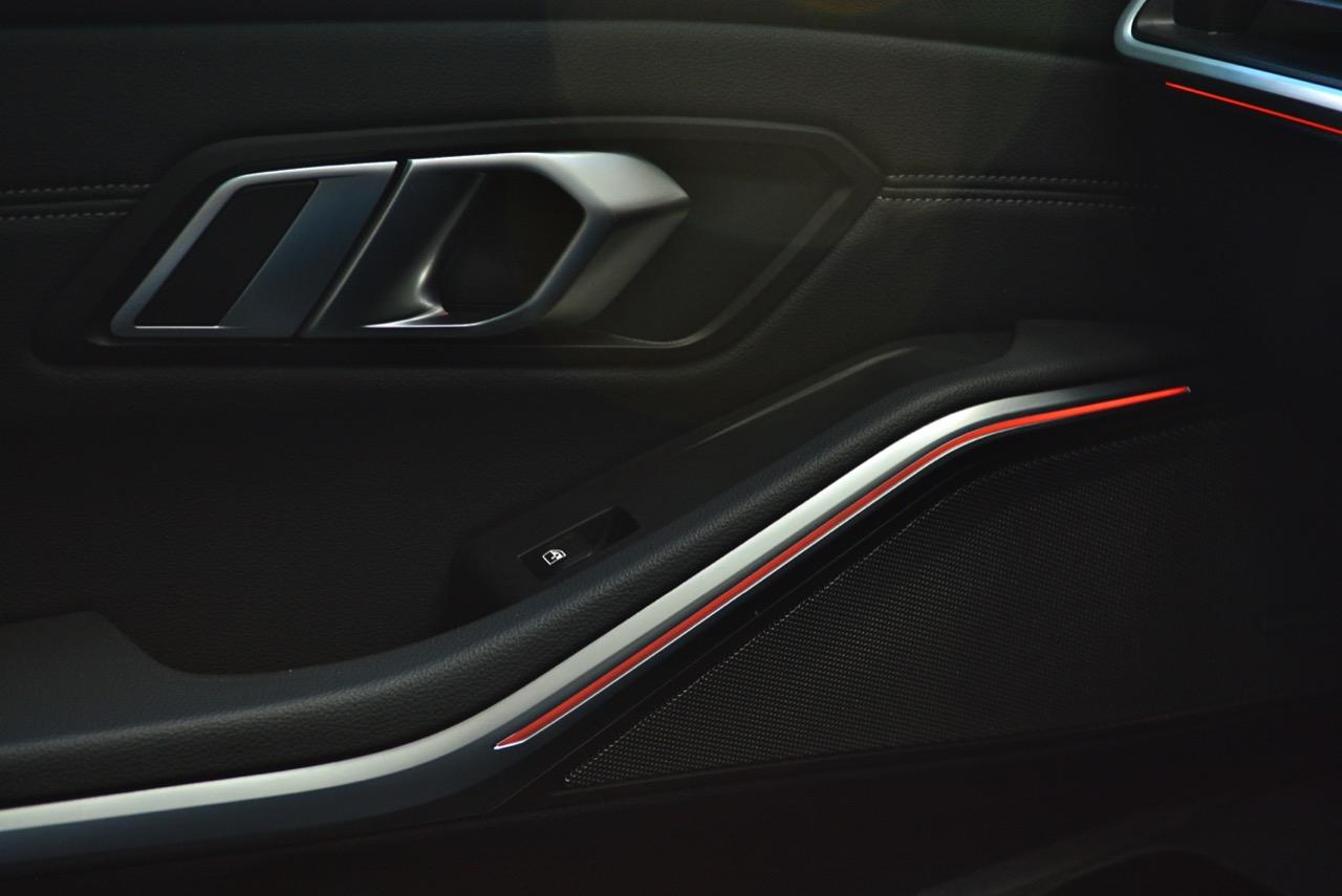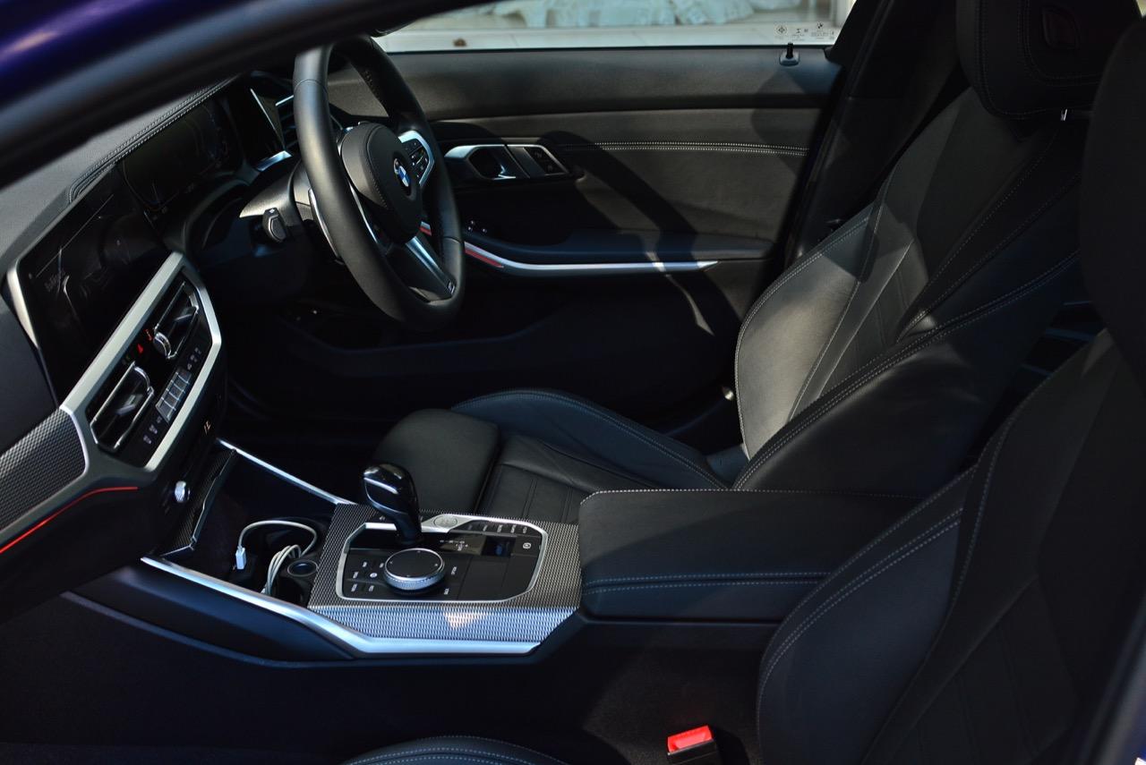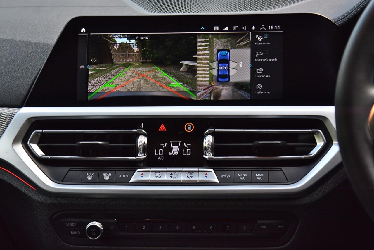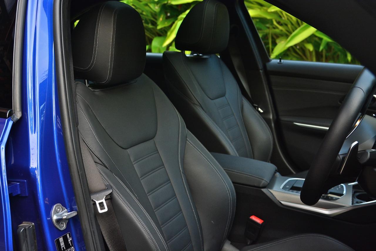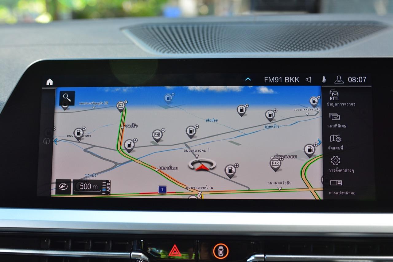 ห้องโดยสารของ BMW 330e M Sport ตกแต่งประดับประดาด้วยวัสดุที่มีคุณภาพ แดชบอร์ดยังคงใช้โฟมขึ้นรูปหุ้มด้วยหนังสังเคราะห์ ช่วยป้องกันเสียงได้ดีพอสมควร คอนโซลแดชบอร์ดแบบใหม่มีขนาดใหญ่กว่าเดิม รหัส G20 สร้างความแตกต่างด้วยอุปกรณ์ไฮเทคที่ใช้งานได้จริงและใส่มาให้เยอะจนใช้งานไม่หมด เบาะแบบสปอร์ตปรับไฟฟ้า มีส่วนของเบาะหนุนต้นขาที่ยืดหดได้เหมือนเดิมสำหรับคนขายาว เบาะนั่งหนังแท้ Vernasca เบาะคนขับวางตำแหน่งมาดีและเป็นจุดศูนย์กลางของการเชื่อมโยงกับอุปกรณ์ต่างๆ แดชบอร์ดที่ขึ้นรูปด้วยโฟมหุ้มด้วยหนังสังเคราะห์สีเทาดำ เดินเส้นตัดขอบกึ่งกลางด้วยงานอะลูมิเนียมลาย Tetragon เข้ากับไฟตกแต่งภายใน LED เป็นห้องโดยสารยุคใหม่ของ BMW ที่น่าใช้งานแต่บอกตามตรงว่าจอภาพมาตรวัดแบบใหม่นั้นอ่านค่าวัดรอบได้ยากกว่าเดิมจากความไม่คุ้นชิน คนของ BMW แจ้งว่า ใช้งานบ่อยครั้งเข้า คุณจะชินกับมันไปเอง