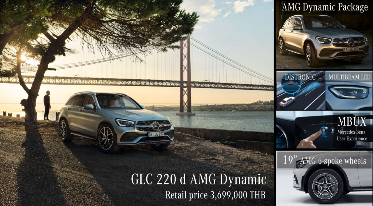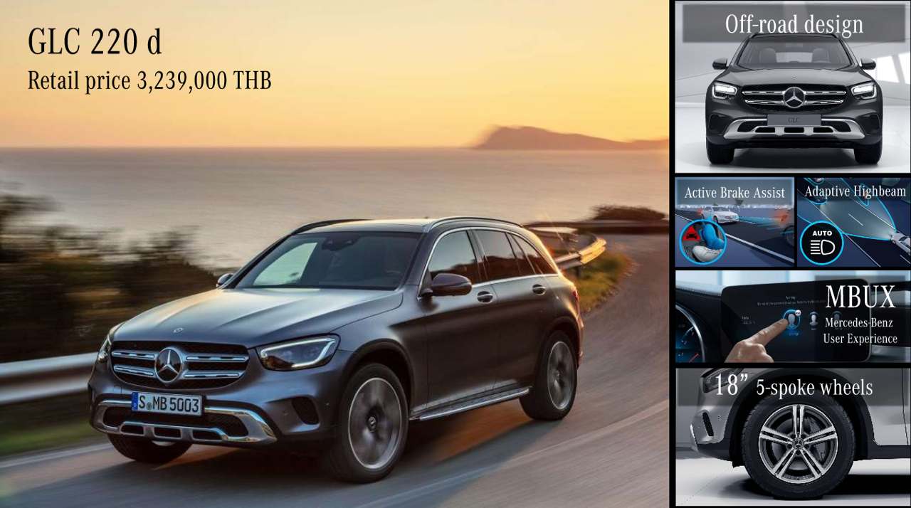 ก้าวข้ามครอสโอเวอร์และเอสยูวีจิ๋วขึ้นไป คุณจะพบกับรถอเนกประสงค์ขนาดกลางรุ่นทำเงินของ Mercedes-Benz นั่นก็คือ เจ้า GLC Class มันมาพร้อมพื้นที่ใช้สอยขนาด 5 ที่นั่ง รุ่นปรับโฉมเพิ่มเติมอุปกรณ์หรูหราและความสามารถในการขับเคลื่อนบนเส้นทางวิบากจากขนาดความสูงที่มากกว่ารถเก๋งซีดานแต่ยังใช้ระบบขับเคลื่อน 2 ล้อหลังโดยไม่มีระบบขับเคลื่อน 4 ล้อ 4Matic เริ่มด้วยรุ่นดีเซล GLC220d ราคา 3,239,000 บาท ประจำการด้วยขุมกำลังดีเซลรุ่นใหม่ล่าสุดขนาด 2.0 ลิตร เทอร์โบ กับ GLC220d AMG Dynamic หรูหราหล่อระเบิดด้วยชุดแต่ง AMG ทั้งคันไล่เรียงจากภายนอกไปจนถึงงานดีไซน์ภายในก็ยังใช้ของ AMG ระบบมัลติมีเดียแบบใหม่ MBUX เครื่องดีเซลรุ่นใหม่ล่าสุดขนาด 2.0 ลิตร เทอร์โบ กำลัง 194 แรงม้า แรงบิด 400 นิวตันเมตร ระบบส่งกำลังใช้เกียร์อัตโนมัติ 9-G Tronic ไม่มีระบบขับเคลื่อน 4 ล้อ 4Matic อีกเช่นกัน