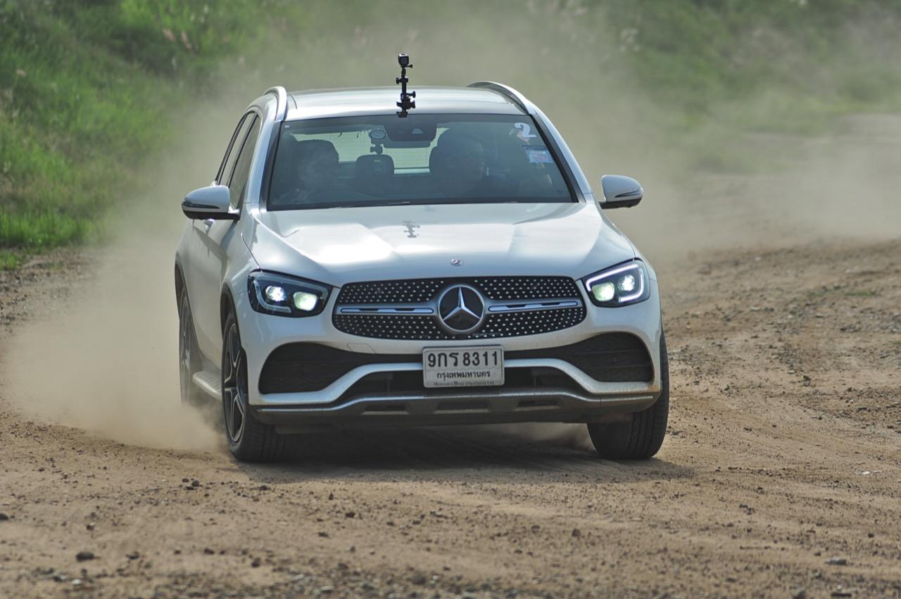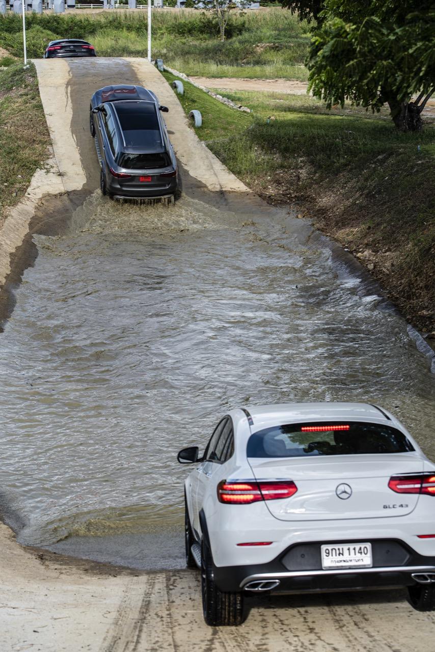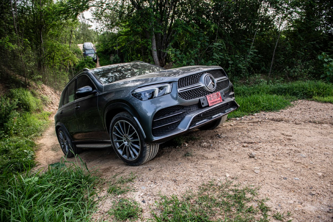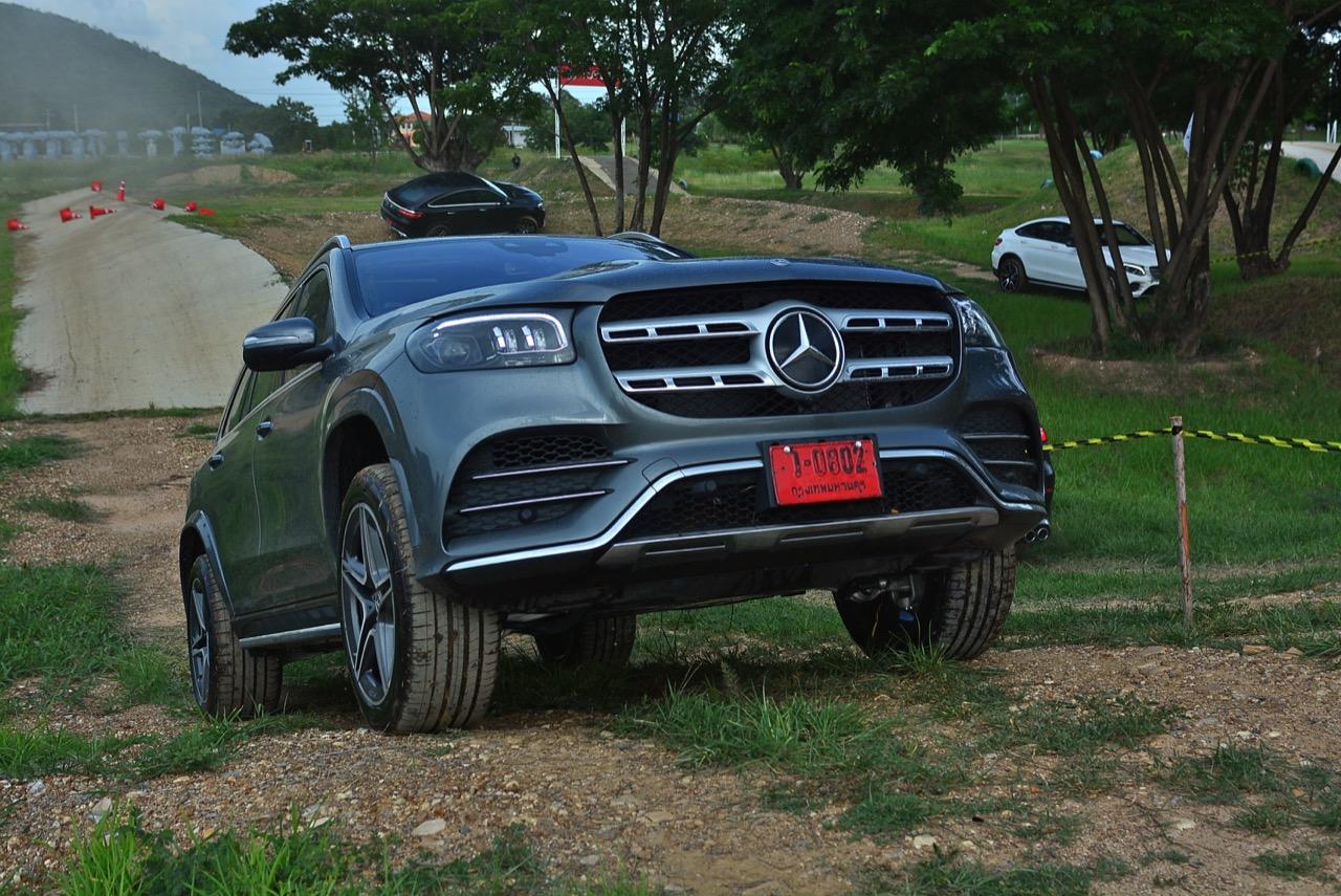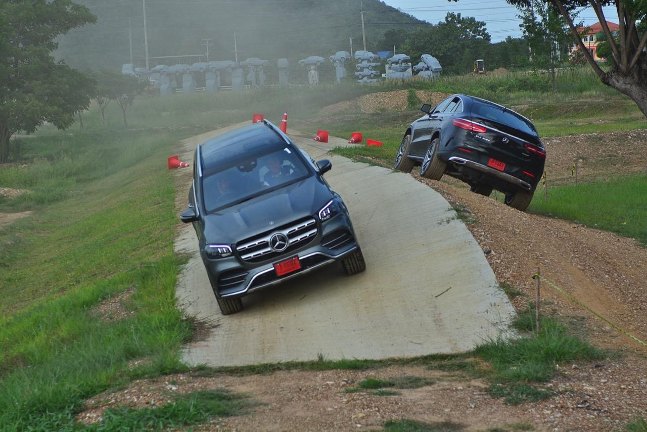 งาน Mercedes-Benz SUV Driving Experience ที่สนามทดสอบการขับขี่แบบออฟโรดของกรังด์ปรีซ์ในอำเภอบ่อพลอย กาญจนบุรี มีความโหดหินเอาเรื่อง สถานีต่างๆ ที่จำลองพื้นที่โหดบนเส้นทางออฟโรด ถูกออกแบบให้ผังและรูปแบบของสนามเหมาะกับรถกระบะขับเคลื่อน 4 ล้อ มากกว่าจะเอาเอสยูวีหรูราคาแพงลงไปลุยแบบจัดหนัก สถานีแรกกับการขับ Mercedes-Benz New GLE300d 4Matic นั่นก็คือ การขับแบบ 4x4 Adventure ความยาวรวม 4.5 กิโลเมตร จำลองสถานการณ์โหดของการขับลุยทุ่งลุยป่า ฝ่าเนินดินที่มีความสูงชัน พื้นที่รอบๆ สนามทดสอบที่เป็นเนินดินสลับป่าละเมาะถูกสร้างขึ้นเพื่อการลุยโดยเฉพาะ เมื่ออยู่บนเส้นทางออฟโรด GLE รุ่นเครื่องยนต์เล็กสุดทำหน้าที่ได้ดี ฮาร์ดแวร์ของระบบขับเคลื่อน 4 ล้อ 4Matic ที่ปรับปรุงใหม่ทำให้ระบบขับเคลื่อนตอบสนองได้เร็วขึ้น ระบบไต่ลงจากเนินสูงชันทำงานไวช่วยประคับประคองไม่ให้ส่วนหน้าของ GLE ทิ่มลงไปบนดินแข็งๆ ซึ่งอาจทำให้เกิดความเสียหาย การปิดระบบควบคุมการทรงตัว ทำให้แรงบิดขณะเร่งขึ้นเนินสูงไหลออกมาเต็มๆ การตะกายไต่ขึ้นเนินเขาสูงชันทำได้ดี ส่วนการถ่ายทอดกำลังและการวางตำแหน่งรถให้ถูกต้อง เป็นหน้าที่ของสื่อมวลชนที่ต้องทำให้ดีเพื่อเอาตัวรอดและหลีกเลี่ยงอุบัติเหตุที่อาจเกิดขึ้นได้หากวางตำแหน่งรถผิดพลาด GLE มีจุดอ่อนที่ใต้ท้องรถ เมื่อเจอทางวิบากหนักข้อก็อาจทำให้ท้องรถติด ระบบขับเคลื่อนทำหน้าที่ได้ดีมากเมื่อลุยฝ่าทางที่เต็มไปด้วยดินและหิน ในชีวิตจริง การขับลุยน้ำท่วมหรือขับฝ่าทางขรุขระมีบ่อโคลนเล็กๆ ไม่ใช่ปัญหาของมัน แต่อย่าหวังว่ามันจะลุยได้หนักกว่านี้ เป็นรถที่ดีและมีบุคลิกตามแบบฉบับของรถอเนกประสงค์ ความใหญ่โตของห้องโดยสาร ให้ความรู้สึกสะดวกสบาย แถมยังควบคุมได้ง่ายจากระบบต่างๆ ที่คอยประคับประคองทั้งบนทางเรียบและทางวิบาก