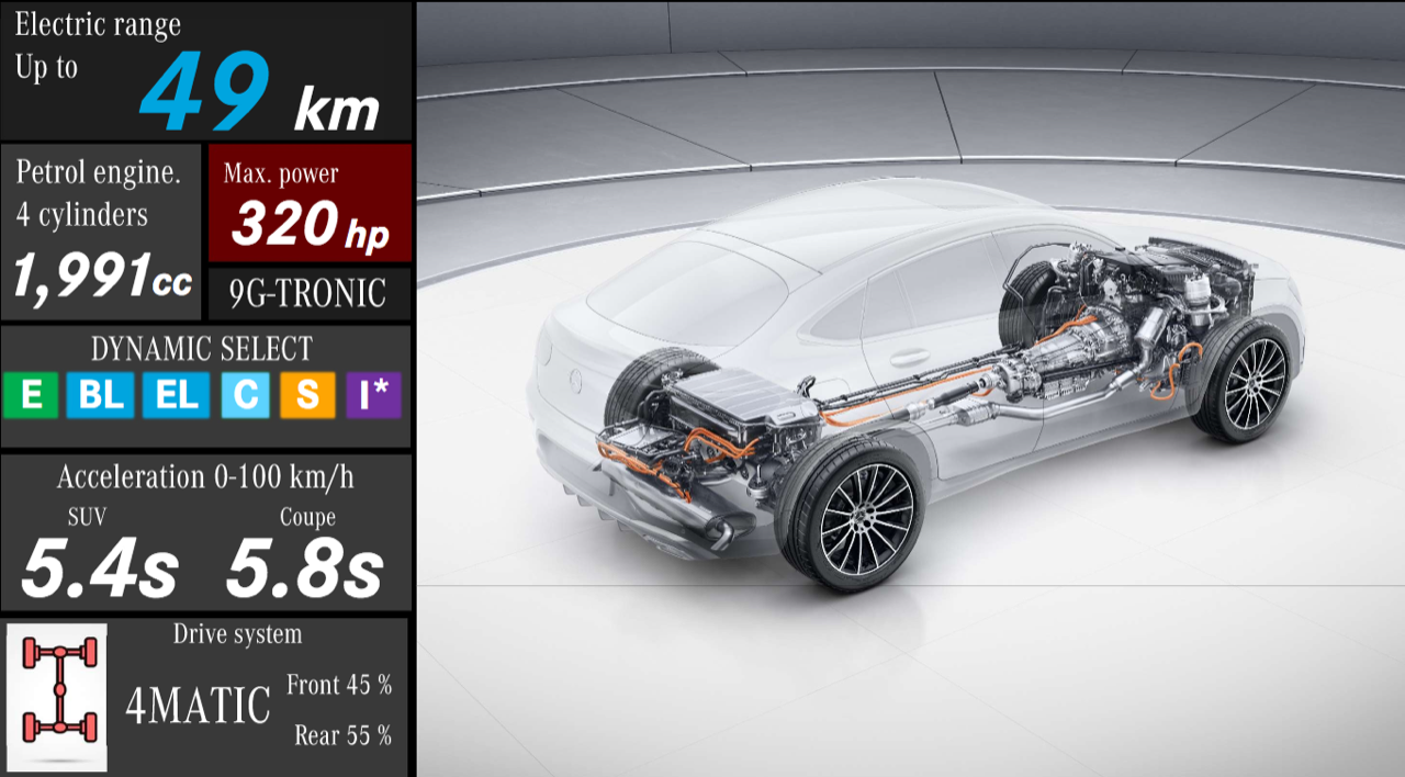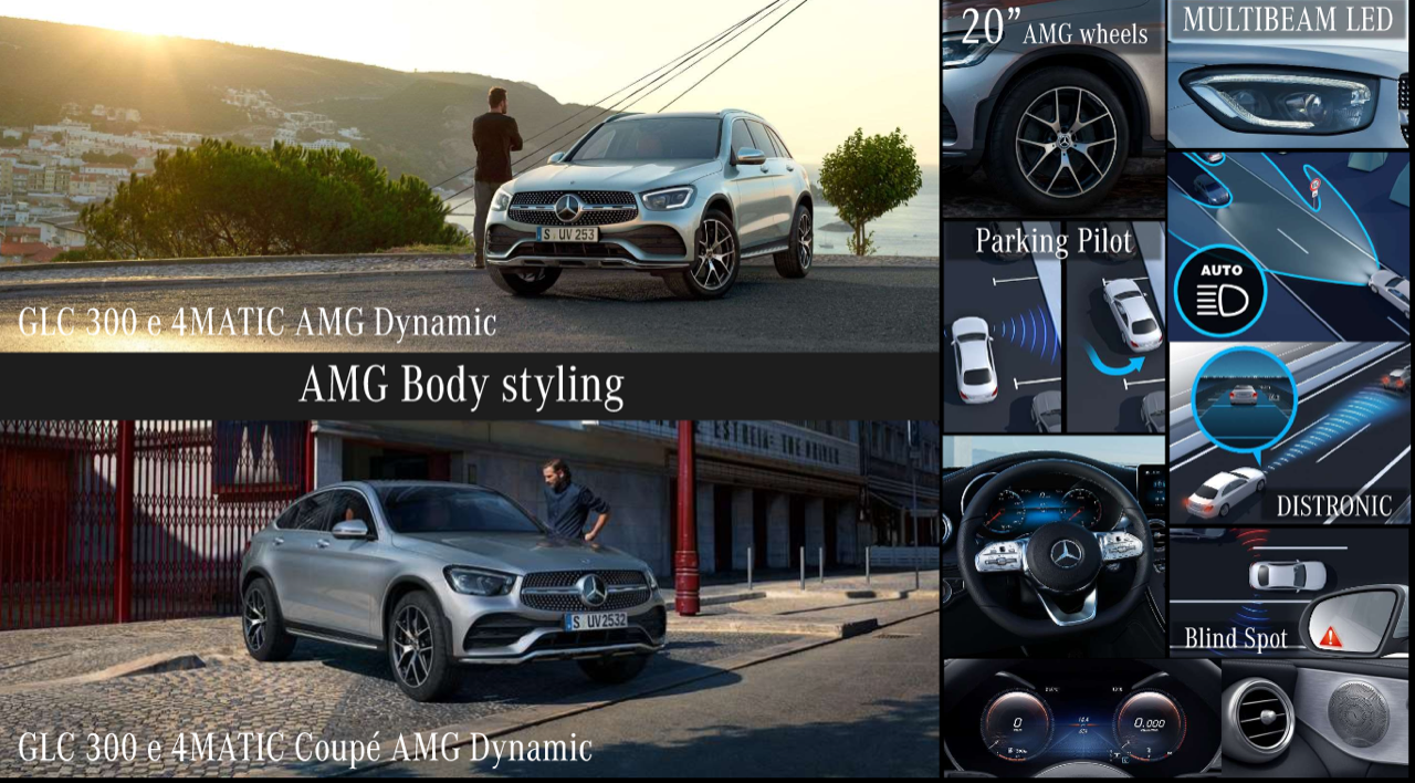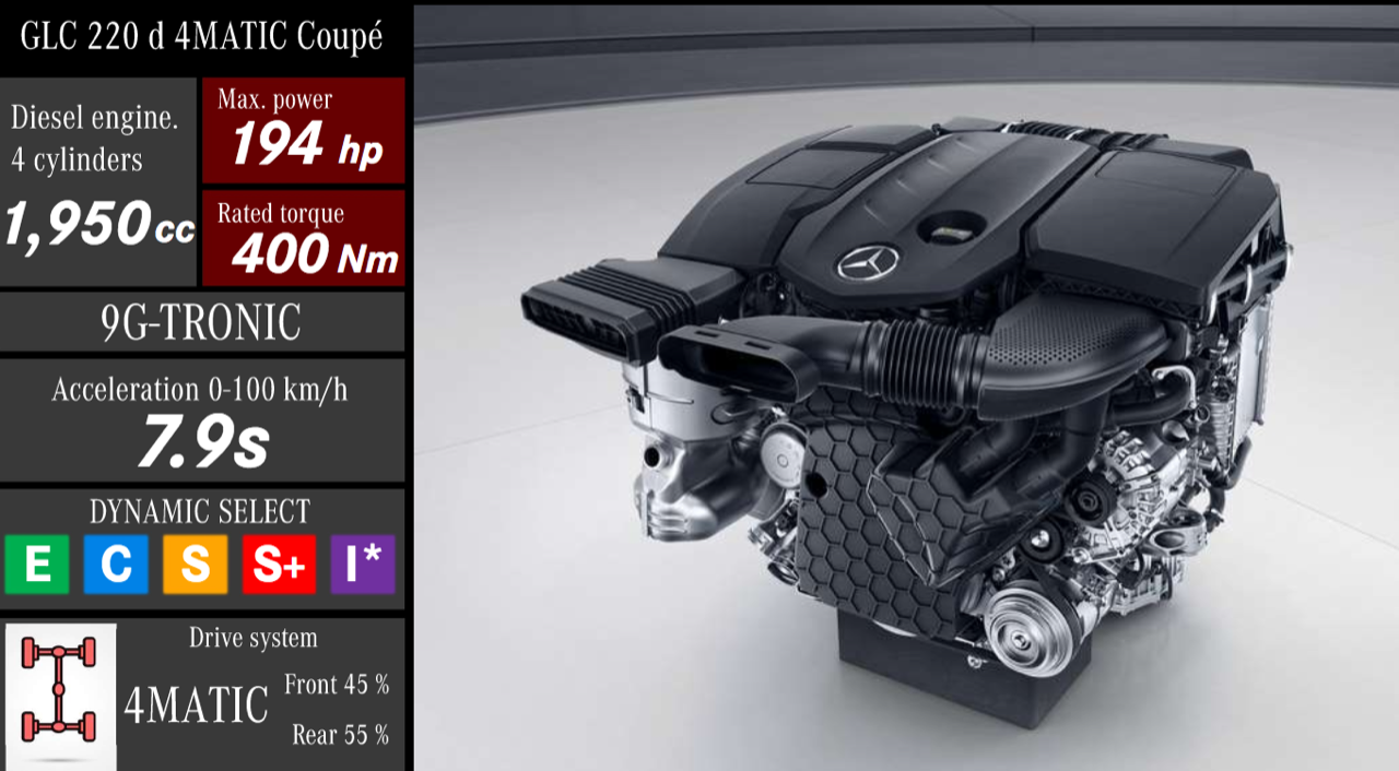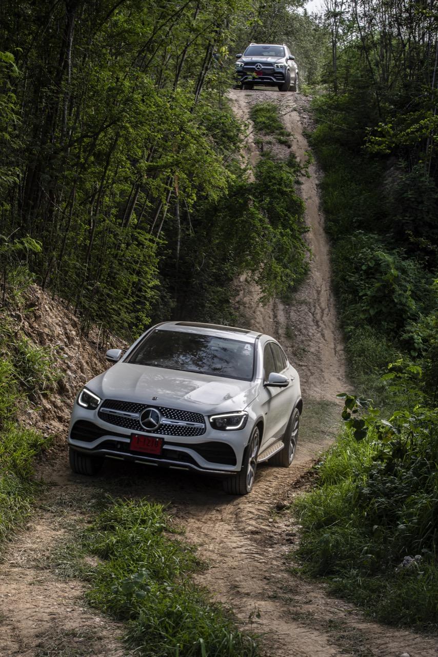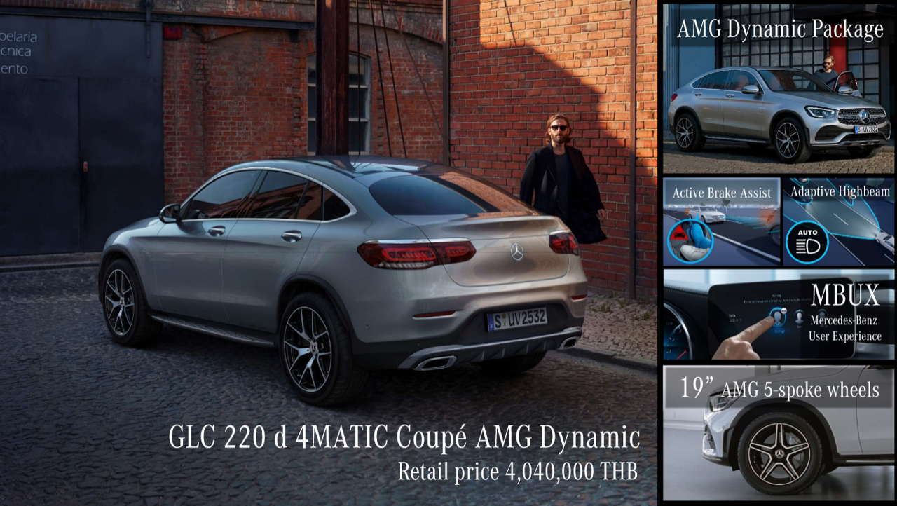 เมื่อตัวถังปกติของ GLC มันไม่เท่เท่าที่ควรก็ยังมี GLC Coupe รถสปอร์ตเอสยูวีที่ทำตลาดได้ดี (มาก) ในไทย GLC หลังคาลาดแบบ Coupe มีความหล่อเหลาเอาเรื่อง เป็นรถที่ออกแบบมาสำหรับการขับใช้งานกึ่งอเนกประสงค์และกึ่งรถสปอร์ต พร้อมความสามารถในการลุยเส้นทางวิบากด้วยสัดส่วนความสูงจากพื้นถึงใต้ท้องกับระบบขับเคลื่อน 4 ล้อ 4Matic เจ้า GLC Coupe มีให้เลือกทั้งรุ่นปลั๊กอินไฮบริด 300e AMG Dynamic ราคา 4,090,000 บาท เครื่องยนต์เบนซิน 4 สูบ ความจุ 1,991 ซีซี กำลัง 155 กิโลวัตต์ หรือ 211 แรงม้า แรงบิดจากเครื่องยนต์ทำได้ที่ 350 นิวตันเมตร ในย่าน 1,200-4,000 รอบต่อนาที มอเตอร์ไฟฟ้าที่ติดตั้งในเกียร์ 9-G Tronic ปรับแต่งใหม่เพื่อเพิ่มประสิทธิภาพให้สูงกว่า E350e จากที่เคยมีแรงม้าแค่ 88 ตัว การปรับแต่งเพิ่มเติมประสิทธิภาพของมอเตอร์ไฟฟ้าใหม่หมด ทำให้กำลังจากมอเตอร์เพิ่มเป็น 122 แรงม้า มากเกินพอสำหรับถนนทุกสายบนโลกใบนี้ โดยเฉพาะอัตราเร่ง 0-100 กิโลเมตรต่อชั่วโมงนั้นเหลือรับประทาน แรงบิดของเครื่องยนต์และมอเตอร์ไฟฟ้า ระบบประสานพลังงานในรูปแบบ parallel hybrid ของ Mercedes ทำให้เจ้า GLC300e วิ่งในโหมด ECO โดยมีอัตราสิ้นเปลืองที่ 14.4 กิโลเมตรต่อลิตร (แล้วแต่โหมดและลักษณะของการขับขี่) ส่วนแรงบิดล้นๆ ในโหมด Sport+ เมื่อพลังงานถูกปล่อยลงพื้นเต็มที่ มันจะกลายร่างเป็นสปอร์ตเอสยูวีที่สร้างแรงดึงสำหรับการพุ่งทะยานพร้อมอัตราเร่งเร็วจี๋ราวกับรถสปอร์ต จากตัวเลข 0-100 แค่ 5.8 วินาที เร็วจี๋พอๆ กับ Porsche Macan เลยทีเดียว ส่วน GLC220d ราคา 4,040,000 บาท วางเครื่องยนต์ดีเซลแถวเรียง 4 สูบ เทอร์โบ กำลัง 194 แรงม้า แรงบิด 400 นิวตันเมตร ระบบส่งกำลังใช้เกียร์อัตโนมัติ 9-G Tronic พ่วงการทำงานกับระบบ 4Matic และโหมดการขับเคลื่อน Dynamic Select มีให้เลือก เช่น ECO / COMFORT / SPORT / SPORT+ / INDIVIDUAL อัตราเร่งจาก 0-100 ใน 7.9 วินาที