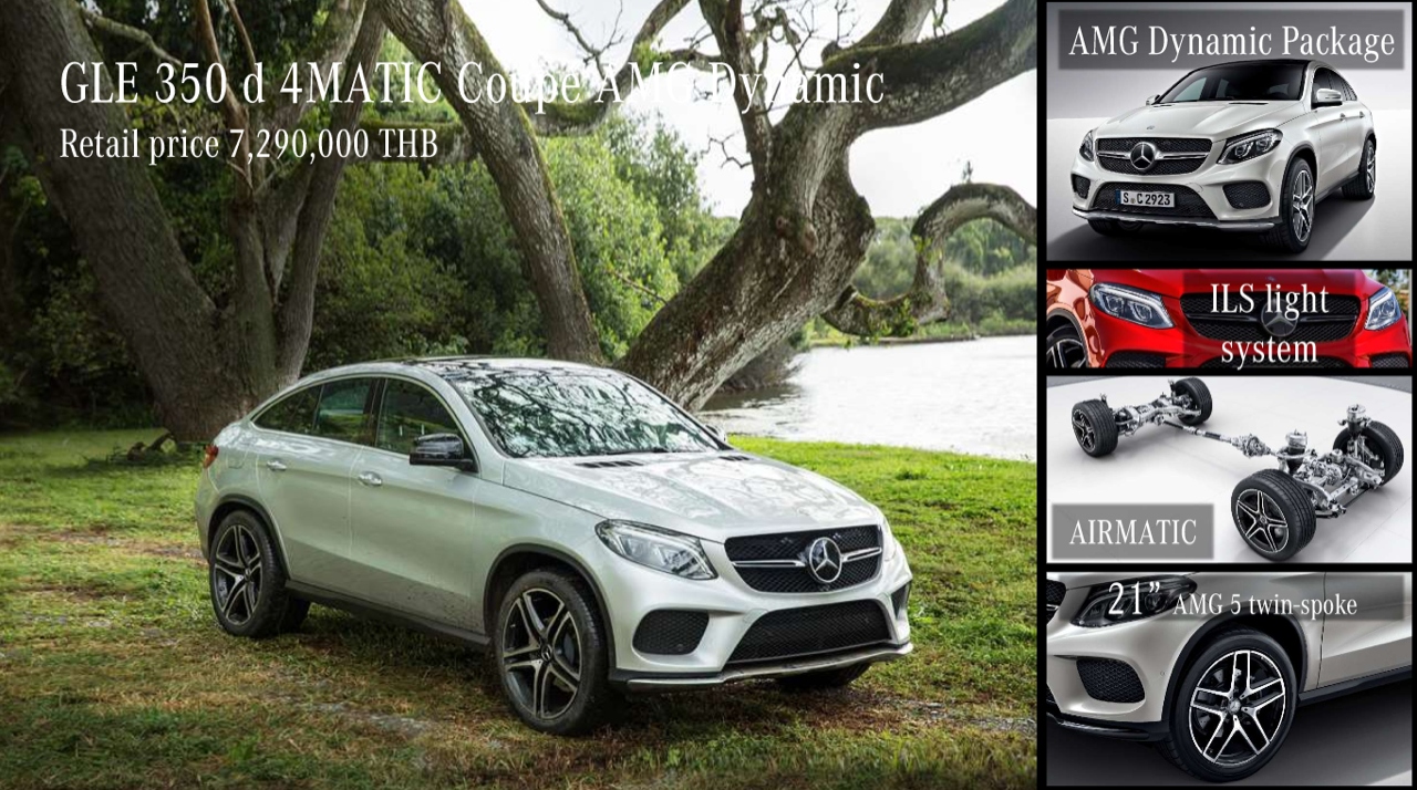 มาที่รถโฉมเก่าแต่ Mercedes-Benz Thailand ยังคงมีขายอยู่เนื่องจากขายไม่ค่อยดีเท่าที่ควรนั่นก็คือ จูราสสิค พาร์ค Mercedes-Benz GLE350d 4Matic Coupe AMG Dynamic ไฟหน้าทรงแปลกตากับกระจังหน้า AMG ทำให้มันพอที่จะเอาตัวรอดไปได้ในด้านของดีไซน์ เป็นรถที่เพื่อนผมคนนึงต้องควักเงินถึง 7 ล้านเพื่อเปลี่ยนจาก S-Class ไปเป็น SUV ทรง Coupe และมันก็ไม่ทำให้ผิดหวังเมื่อเกิดอุบัติเหตุจากระบบความปลอดภัยที่คอยปกป้องคุ้มครองคนขับและผู้โดยสาร GLE350d 4Matic Coupe AMG วางเครื่องยนต์ดีเซล V6 ทวินเทอร์โบ ช่วงล่างถุงลม Air matic ระบบส่องสว่าง ILS Light System ล้อ AMG 5 ก้านอย่างงามขอบ 21 นิ้ว เครื่องยนต์ดีเซล V6 ความจุ 3.0 ลิตร กำลัง 258 แรงม้า แรงบิด 620 นิวตันเมตร ส่งกำลังด้วยเกียร์อัตโนมัติ 9-G Tronic พ่วงระบบขับเคลื่อน 4 ล้อ 4Matic เป็นเครื่องยนต์รุ่นกลางเก่ากลางใหม่ที่เบ่งกล้ามได้มากกว่าเดิม มีความสามารถในการฉุดลากน้ำหนัก 2 ตัน ในรูปแบบของการขับออฟโรดบนทางวิบากแสนสาหัสได้เป็นอย่างดีแต่ไม่ยักกะมีเศรษฐีไทยคนไหนที่กล้าเอาไปลุยแหลกเนื่องจากกลัวค่าซ่อมนั่นเอง ตัวเลขอัตราเร่ง 0-100 ของ GLE350d ทำได้ 7.0 วินาที เร็วจี๋เลยทีเดียว