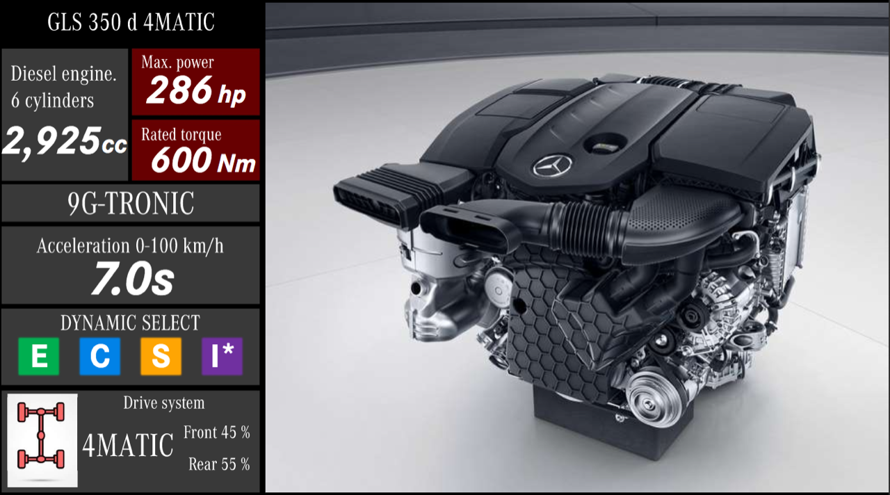 GLS เอาชนะคู่แข่งบนเส้นทางที่ยากลำบากด้วยความหรูหราสะดวกสบาย ขับง่ายและมีความใหญ่โตแบบรถ 7 ที่นั่ง ทุกสิ่งทุกอย่างของมัน ไม่ทำงานด้วยระบบไฟฟ้า ก็จะถูกควบคุมด้วยระบบอิเล็กทรอนิกส์แทบทั้งหมด GLS เป็นรถที่มีอุปกรณ์อำนวยความสะดวกมากมายบรรยายกันไม่หมด มันใช้เครื่องยนต์ดีเซลแถวเรียง 6 สูบ เทอร์โบ รุ่นใหม่ล่าสุด ระบบขับเคลื่อน 4 ล้อ Full time แบบ 4 MATIC ทำงานอย่างสอดคล้องโดยการกระจายแรงบิดระหว่างล้อคู่หน้าและล้อคู่หลัง ช่วยเพิ่มประสิทธิภาพในการควบคุมรถและการทรงตัวบนถนนที่เปียกลื่น รวมถึงการขับขี่บนทางแบบ OFF-ROAD ช่วงล่าง AIRMATIC เป็นครั้งแรกที่จะได้พบกับฟังก์ชันเตรียมรถเข้าสู่เครื่องล้างรถอัตโนมัติ โดยจะทำงานอย่างสอดคล้องร่วมกับระบบ AIRMATIC เมื่อสั่งงานผ่านหน้าจอ Media Display แรงบิดมหาศาลเกิดจากเครื่องยนต์ดีเซลแบบสูบเรียง 6 กระบอกสูบ Two Stage Turbo (เทอร์โบสองตัวประกบอยู่ใกล้ๆ กัน) ช่วยทำให้น้ำหนักลดลงถึง 10 กิโลกรัม