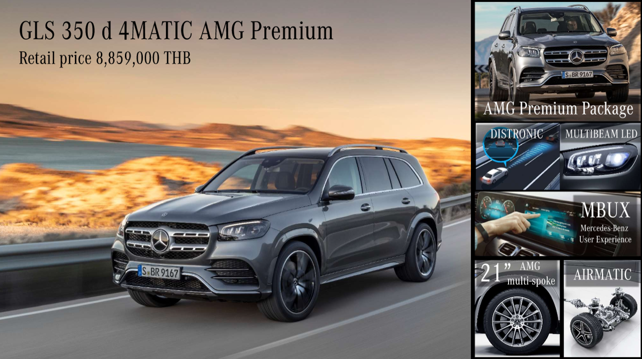 ถ้า GLE ยังใหญ่ไม่พอก็ขอให้ไปที่ GLS เพราะนี่คือเรือธงเอสยูวีที่มีดีทั้งขนาดและความสามารถในการขับเคลื่อน GLS350d 4Matic AMG Premium ครบเครื่องในเรื่องของทางเรียบและทางฝุ่นรวมถึงราคาค่าตัวที่สูงยันเพดานถึง 8,859,000 บาท ความใหญ่โตของมันออกมาชนกับ BMW X7 และ Audi Q7 โดยมีขนาดความกว้าง 2 เมตร ยาว 5.2 เมตร สูง 1.8 เมตร หนัก 2.4 ตัน AMG Premium มาพร้อมไฟหน้าราคาแพง Multibeam LED ระบบปฏิบัติการณ์ MBUX มัลติมีเดียแบบล่าสุด ล้อ AMG ขอบ 21 นิ้ว กับระบบรองรับแบบถุงลมปรับระดับความสูงได้หรือ Air Matic เครื่องยนต์ของยักษ์เยอรมันคันนี้ วางเครื่องดีเซลแถวเรียง 6 สูบเทอร์โบ รุ่นล่าสุดจากแบรนด์ตราดาว ความจุ 3.0 ลิตร อัดอากาศด้วยเทอร์โบ เครื่องยนต์ให้กำลังสูงสุด 286 แรงม้า แรงบิดสูงสุด 600 นิวตันเมตร ระบบส่งกำลังใช้เกียร์อัตโนมัติ 9-G Tronic พ่วงการทำงานกับชุดขับเคลื่อน 4 ล้อ 4Matic ตัวเลขสมรรถนะ เร่งจาก 0-100 กิโลเมตรต่อชั่วโมงใน 7.0 วินาที ห้องโดยสารแบบ 3 แถว 7 ที่นั่ง การปรับพับเบาะใช้ระบบไฟฟ้าทั้งหมด เป็นรถเอสยูวีที่ขายดีในอเมริกาเหนือ พอเข้ามาไทยก็เจอภาษีนำเข้าสูงปรี๊ดทำให้ค่าตัวของมันถึงกับยันเพดาน แว่วๆว่าอีกไม่นานอาจมีการนำชิ้นส่วนของเจ้ายักษ์ GLS มาประกอบในไทยซึ่งจะทำให้ราคาของมันเหลือแค่ 6 ล้านปลายๆ เท่านั้นเอง!