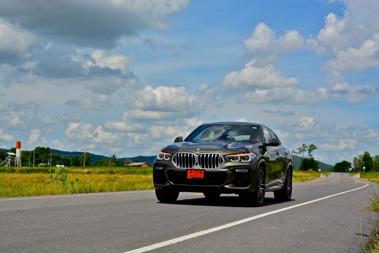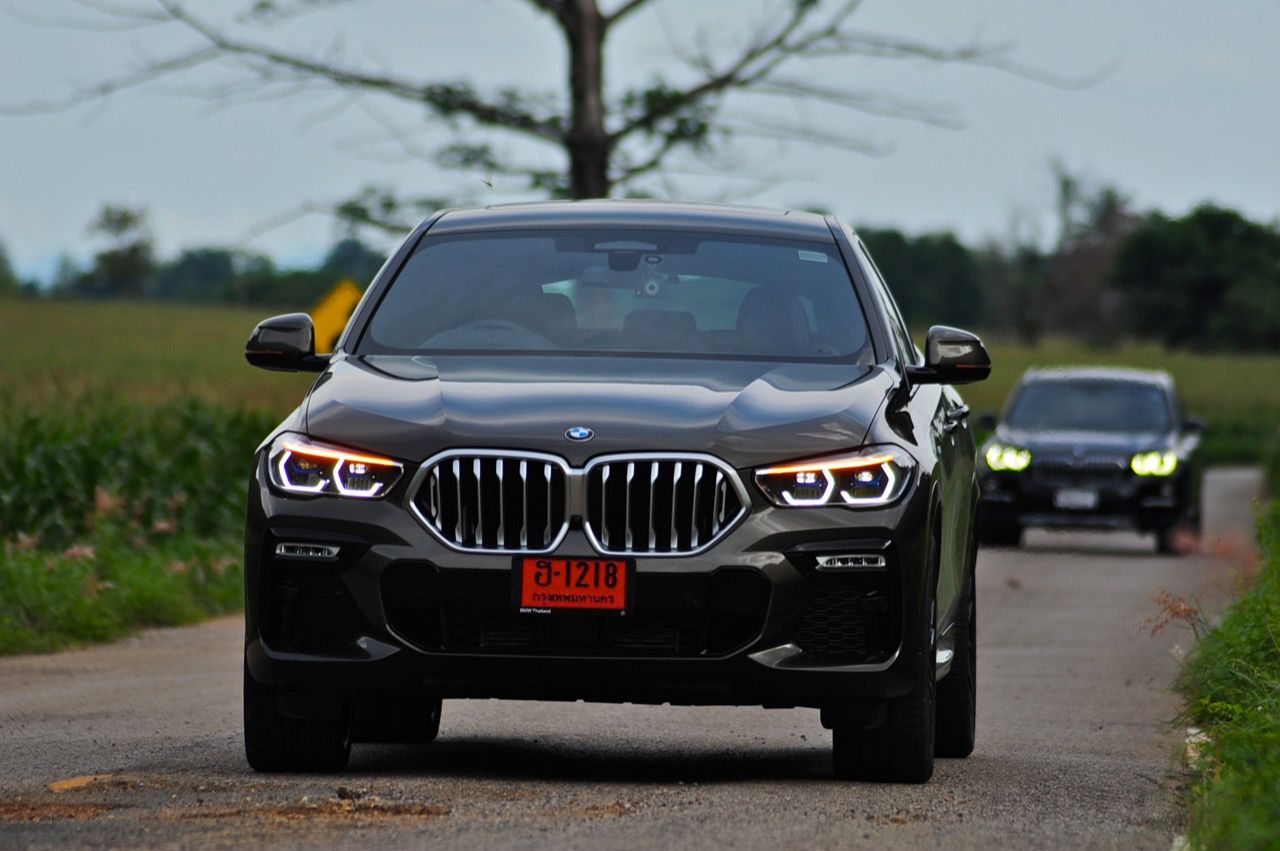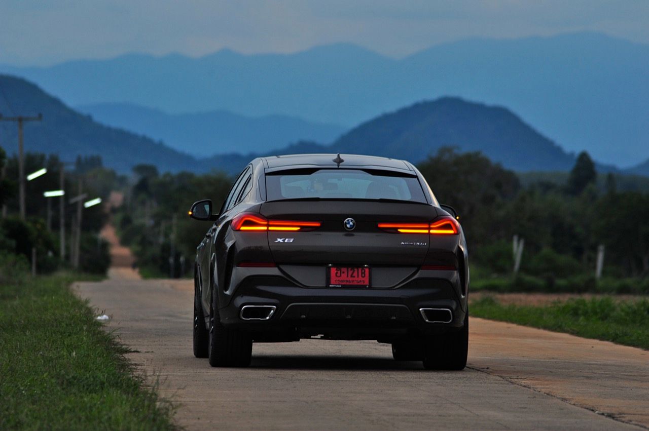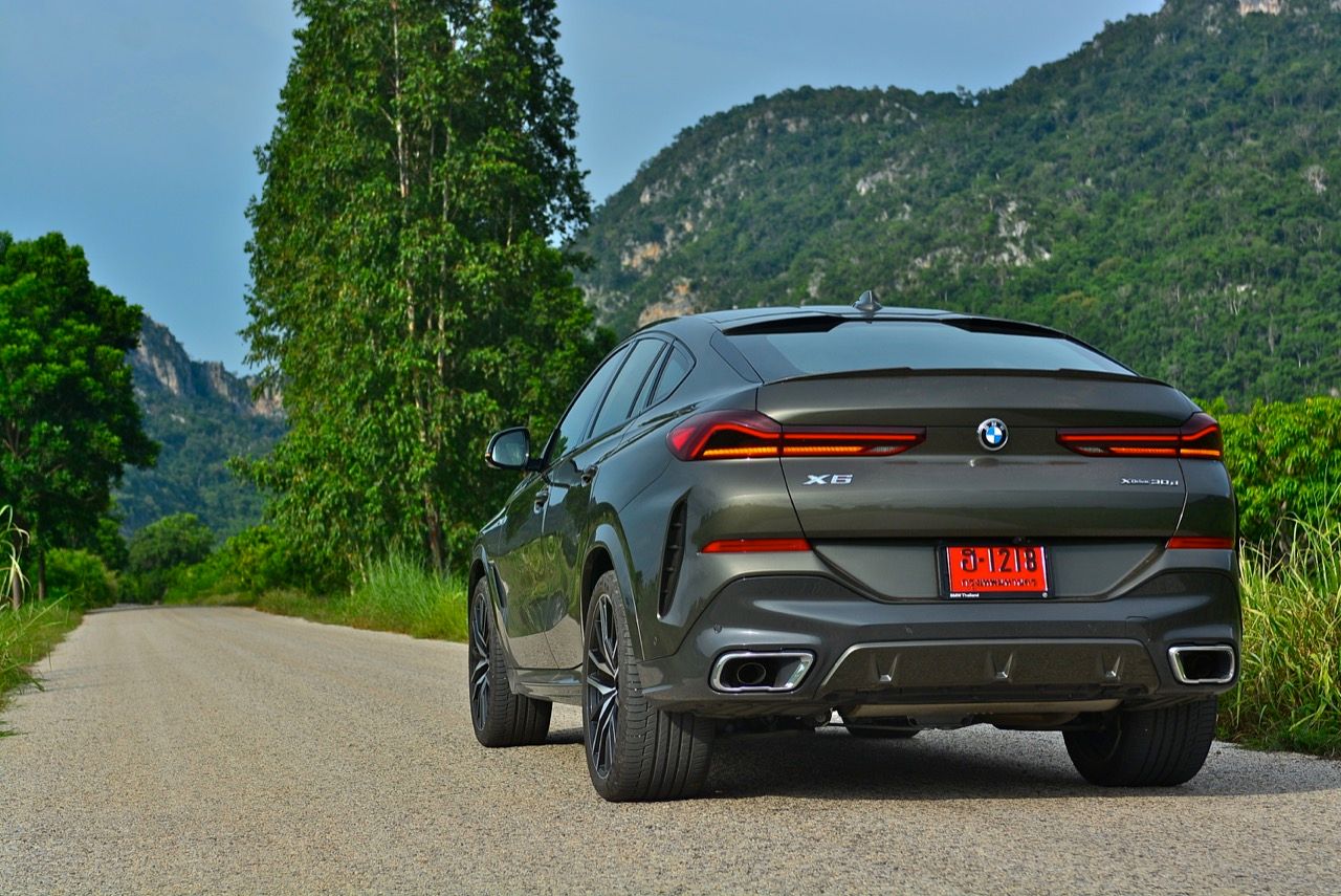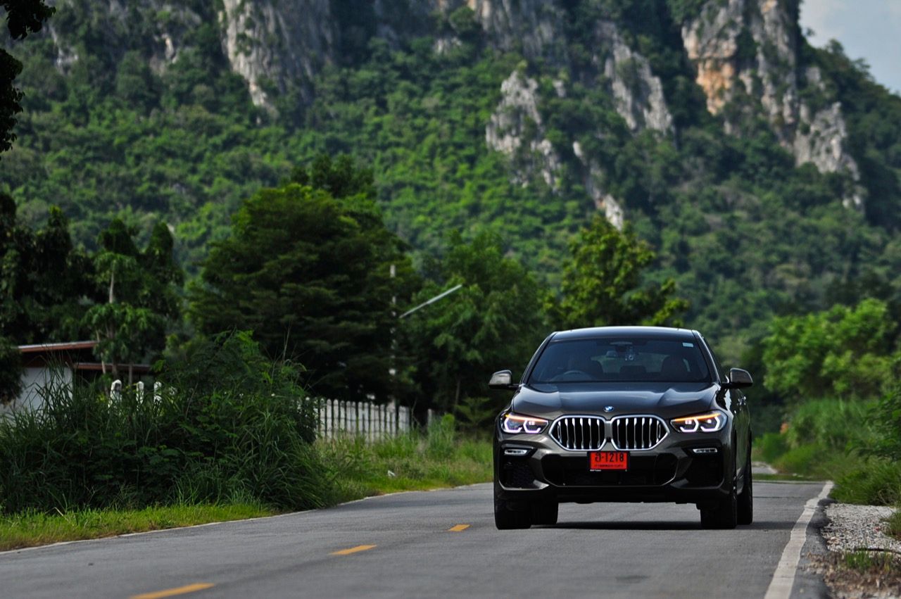 ชุดแต่ง M Sport ทำให้ X6 ที่ใหญ่ขึ้นในทุกมิติยกเว้นความสูง หน้าตาที่ดูดุดันเกินความเป็นรถ SAV ออกแบบคล้ายกับเครื่องจักรขนาดใหญ่ที่พร้อมจะกระโจนไปข้างหน้า กระจังหน้าที่มีไฟอยู่ข้างในทำให้มันคล้ายหุ่น transformers และทำให้รถที่วิ่งอยู่ข้างหน้าในช่องทางด้านขวาหลบเข้าซ้ายกันอย่างจ้าละหวั่น ล้อ 22 นิ้วใหญ่โตสมกับขนาดความกว้างของซุ้มล้อ บั้นท้ายมีชิ้นส่วนของระบบ Aero Dynamic อยู่เต็มไปหมดแต่ไม่ยักกะรกรุงรัง คุณสามารถมองเห็นช่องระบายอากาศที่แก้มข้าง ซึ่งทำหน้าที่ให้อากาศไหลผ่าน (อย่างราบรื่น) ราวกับซุปเปอร์คาร์ กระจังหน้าที่ปิดได้เอง ทำหน้าที่ลดแรงต้านของอากาศให้เหลือน้อยที่สุด เช่นเดียวกับห้องโดยสารที่อุดมไปด้วยของเล่นไฮเทค เครื่องยนต์ดีเซล 3.0 ลิตร ตัวเดียวกับ X5 30d มีแรงบิดเหลือเฟือสำหรับการใช้งาน ทั้งขับปกติและขับเร็วจี๋ การที่มันเป็นรถนำเข้า ทำให้ค่าตัวเมื่อบวกกับอัตราภาษีที่ร้อนแรงทะยานไปถึง 7,299,000 บาท น้ำหนัก 2.2 ตัน ส่งผลให้มันมีความอวบเกือบจะเท่ากับ Mercedes-G Wagon แชสซีอะลูมิเนียม กับกันโคลง Active Roll Stabilization พิสูจน์แล้วว่าเกาะถนนเป็นเยี่ยม ซึ่งเดี๋ยวได้รู้กันตอนขับทางไกล