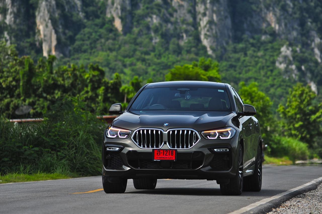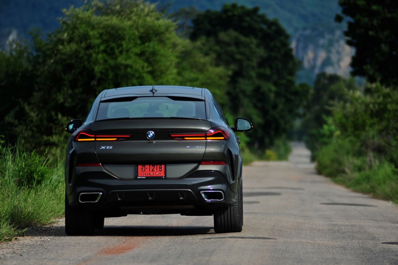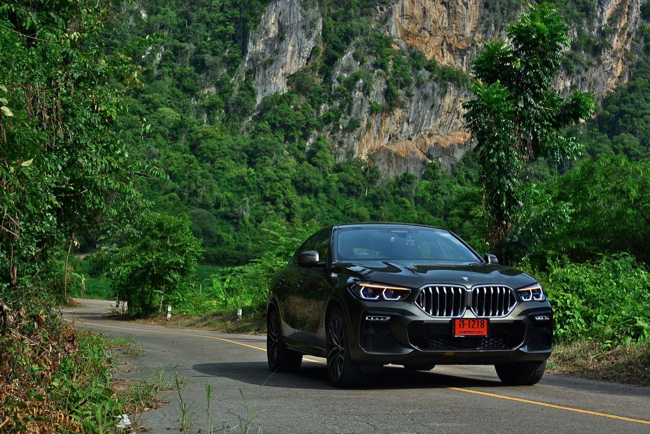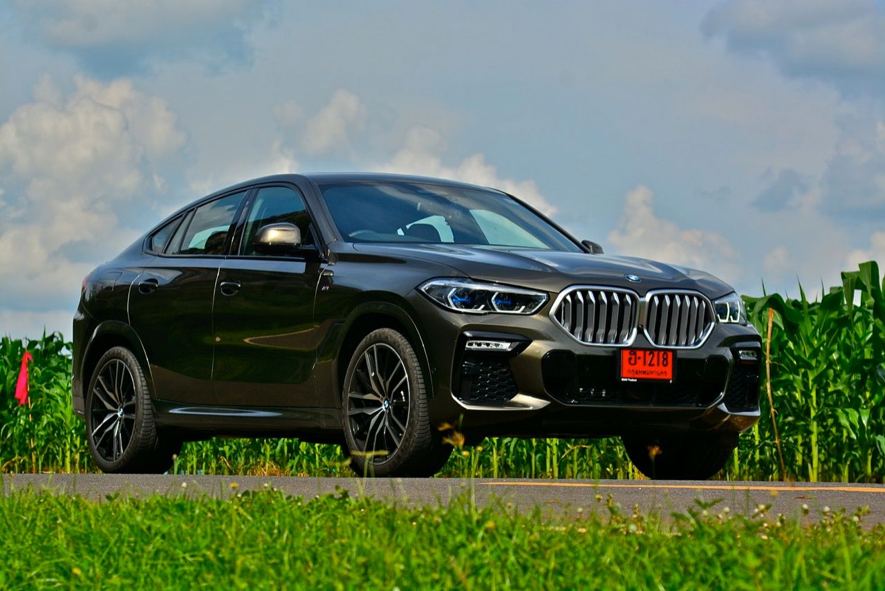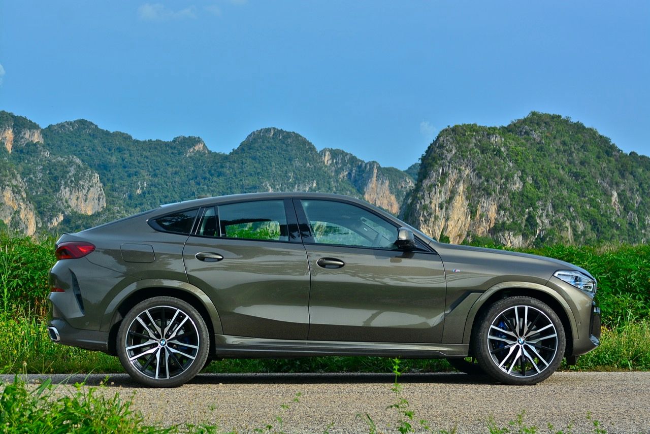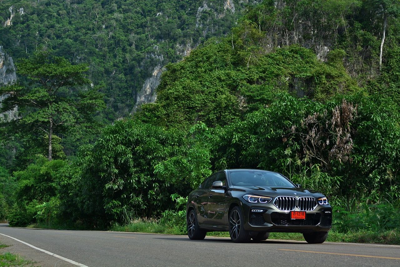 ชุดแต่ง M Sport ทำให้ X6 ที่ใหญ่ขึ้นในทุกมิติยกเว้นความสูง หน้าตาที่ดูดุดันเกินความเป็นรถ SAV ออกแบบคล้ายกับเครื่องจักรขนาดใหญ่ที่พร้อมจะกระโจนไปข้างหน้า กระจังหน้าที่มีไฟอยู่ข้างในทำให้มันคล้ายหุ่น transformers และทำให้รถที่วิ่งอยู่ข้างหน้าในช่องทางด้านขวาหลบเข้าซ้ายกันอย่างจ้าละหวั่น ล้อ 22 นิ้วใหญ่โตสมกับขนาดความกว้างของซุ้มล้อ บั้นท้ายมีชิ้นส่วนของระบบ Aero Dynamic อยู่เต็มไปหมดแต่ไม่ยักกะรกรุงรัง คุณสามารถมองเห็นช่องระบายอากาศที่แก้มข้าง ซึ่งทำหน้าที่ให้อากาศไหลผ่าน (อย่างราบรื่น) ราวกับซุปเปอร์คาร์ กระจังหน้าที่ปิดได้เอง ทำหน้าที่ลดแรงต้านของอากาศให้เหลือน้อยที่สุด เช่นเดียวกับห้องโดยสารที่อุดมไปด้วยของเล่นไฮเทค เครื่องยนต์ดีเซล 3.0 ลิตร ตัวเดียวกับ X5 30d มีแรงบิดเหลือเฟือสำหรับการใช้งาน ทั้งขับปกติและขับเร็วจี๋ การที่มันเป็นรถนำเข้า ทำให้ค่าตัวเมื่อบวกกับอัตราภาษีที่ร้อนแรงทะยานไปถึง 7,299,000 บาท น้ำหนัก 2.2 ตัน ส่งผลให้มันมีความอวบเกือบจะเท่ากับ Mercedes-G Wagon แชสซีอะลูมิเนียม กับกันโคลง Active Roll Stabilization พิสูจน์แล้วว่าเกาะถนนเป็นเยี่ยม ซึ่งเดี๋ยวได้รู้กันตอนขับทางไกล