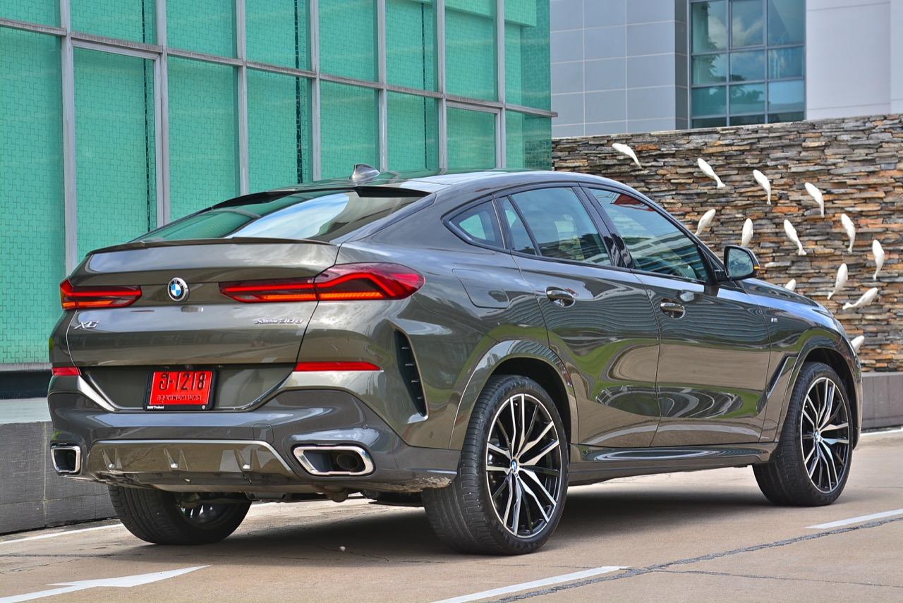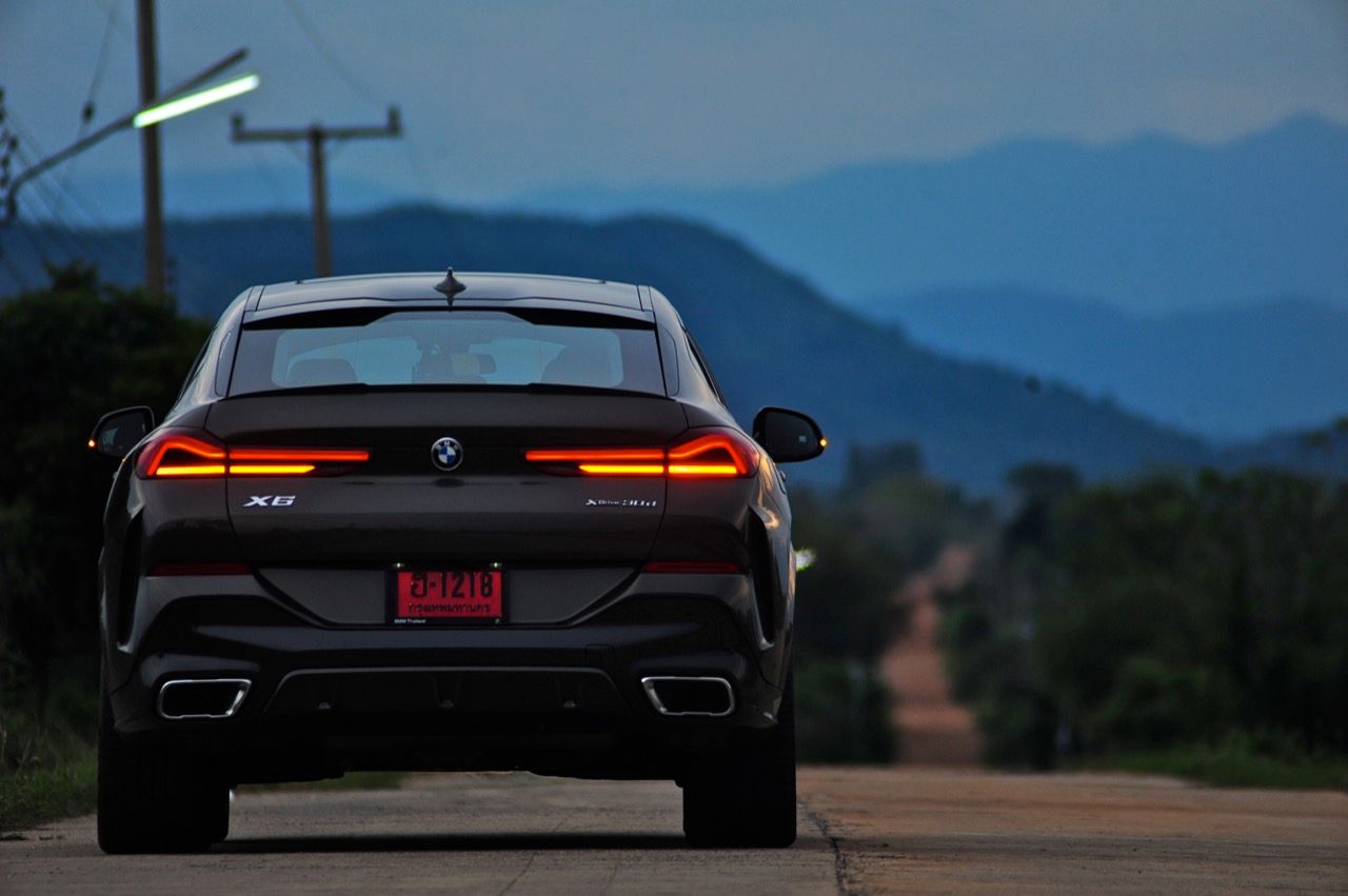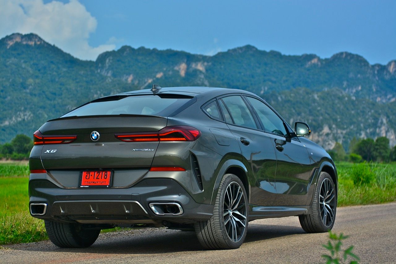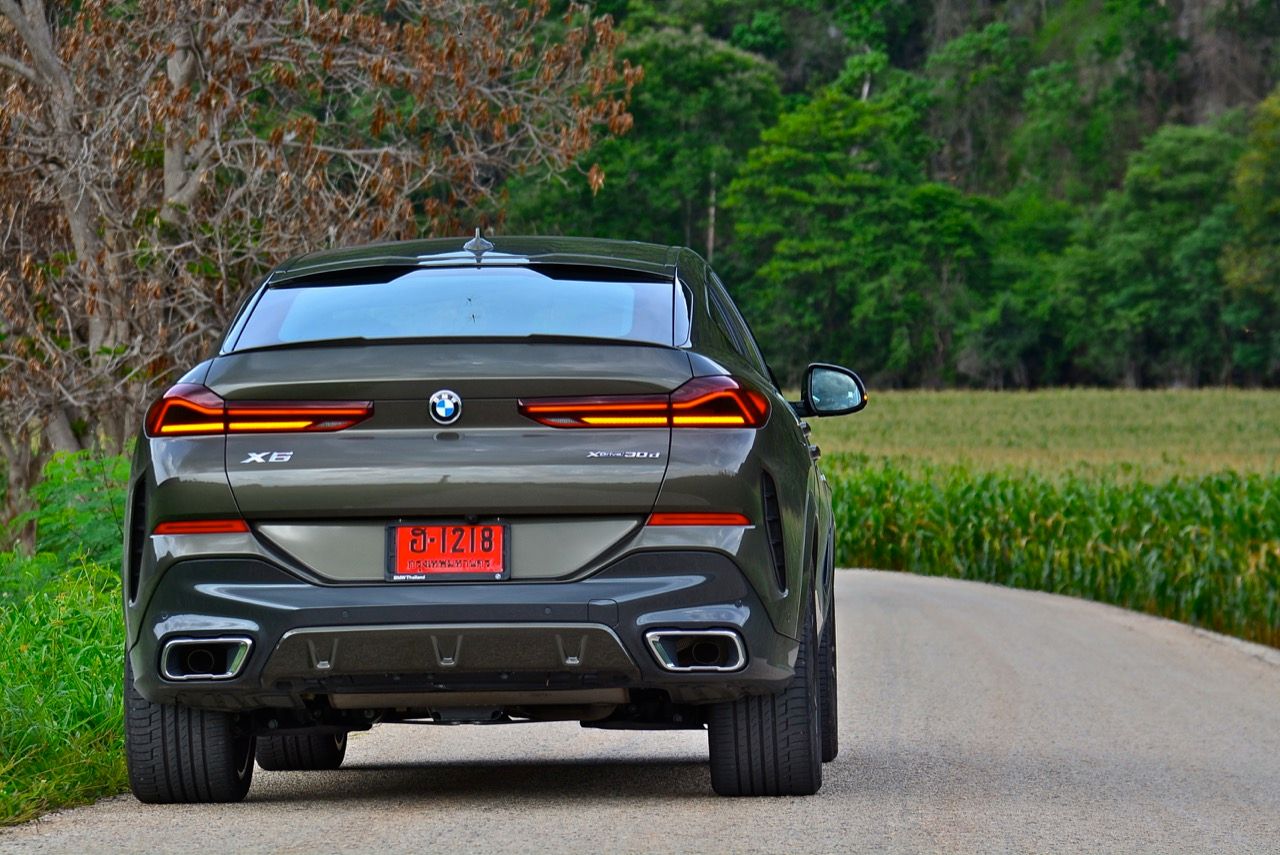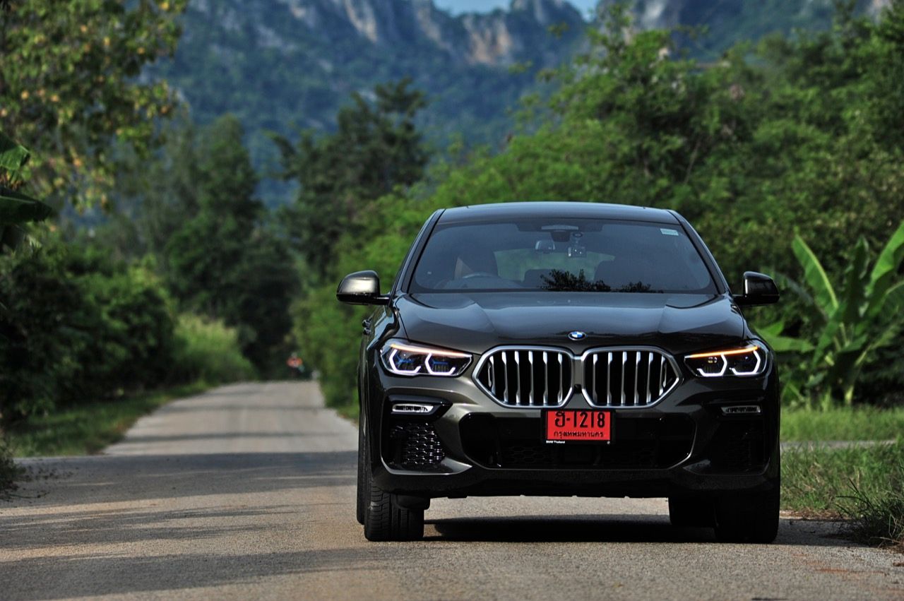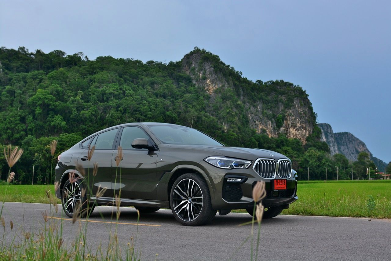 ชุดแต่ง M Sport ทำให้ X6 ที่ใหญ่ขึ้นในทุกมิติยกเว้นความสูง หน้าตาที่ดูดุดันเกินความเป็นรถ SAV ออกแบบคล้ายกับเครื่องจักรขนาดใหญ่ที่พร้อมจะกระโจนไปข้างหน้า กระจังหน้าที่มีไฟอยู่ข้างในทำให้มันคล้ายหุ่น transformers และทำให้รถที่วิ่งอยู่ข้างหน้าในช่องทางด้านขวาหลบเข้าซ้ายกันอย่างจ้าละหวั่น ล้อ 22 นิ้วใหญ่โตสมกับขนาดความกว้างของซุ้มล้อ บั้นท้ายมีชิ้นส่วนของระบบ Aero Dynamic อยู่เต็มไปหมดแต่ไม่ยักกะรกรุงรัง คุณสามารถมองเห็นช่องระบายอากาศที่แก้มข้าง ซึ่งทำหน้าที่ให้อากาศไหลผ่าน (อย่างราบรื่น) ราวกับซุปเปอร์คาร์ กระจังหน้าที่ปิดได้เอง ทำหน้าที่ลดแรงต้านของอากาศให้เหลือน้อยที่สุด เช่นเดียวกับห้องโดยสารที่อุดมไปด้วยของเล่นไฮเทค เครื่องยนต์ดีเซล 3.0 ลิตร ตัวเดียวกับ X5 30d มีแรงบิดเหลือเฟือสำหรับการใช้งาน ทั้งขับปกติและขับเร็วจี๋ การที่มันเป็นรถนำเข้า ทำให้ค่าตัวเมื่อบวกกับอัตราภาษีที่ร้อนแรงทะยานไปถึง 7,299,000 บาท น้ำหนัก 2.2 ตัน ส่งผลให้มันมีความอวบเกือบจะเท่ากับ Mercedes-G Wagon แชสซีอะลูมิเนียม กับกันโคลง Active Roll Stabilization พิสูจน์แล้วว่าเกาะถนนเป็นเยี่ยม ซึ่งเดี๋ยวได้รู้กันตอนขับทางไกล