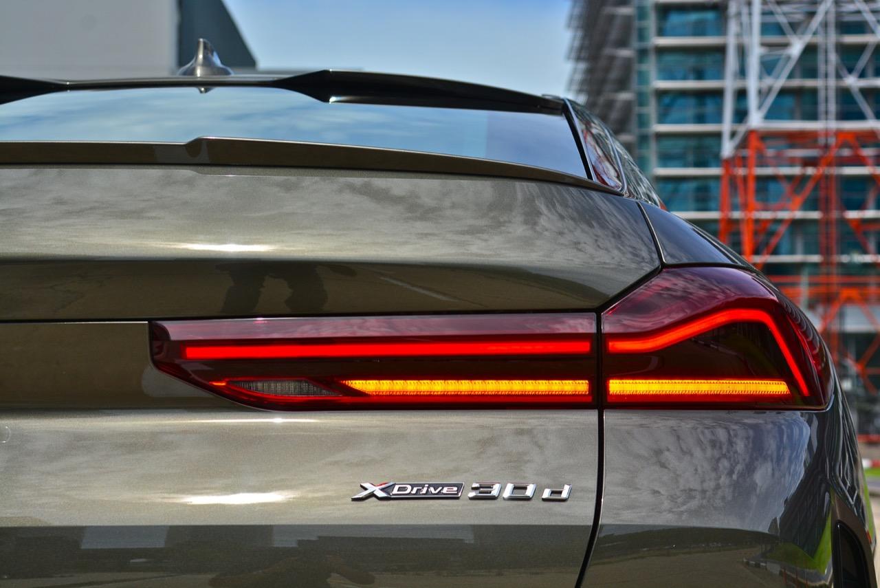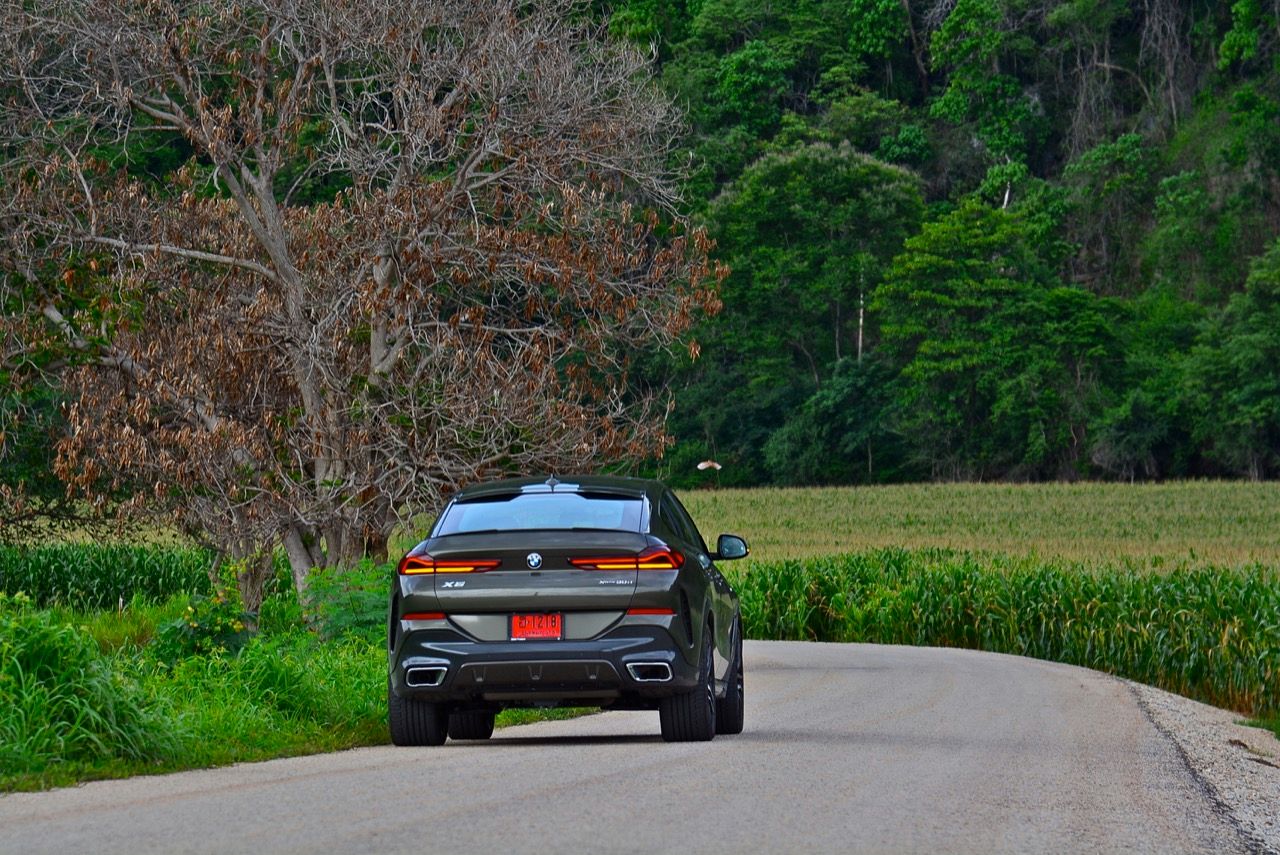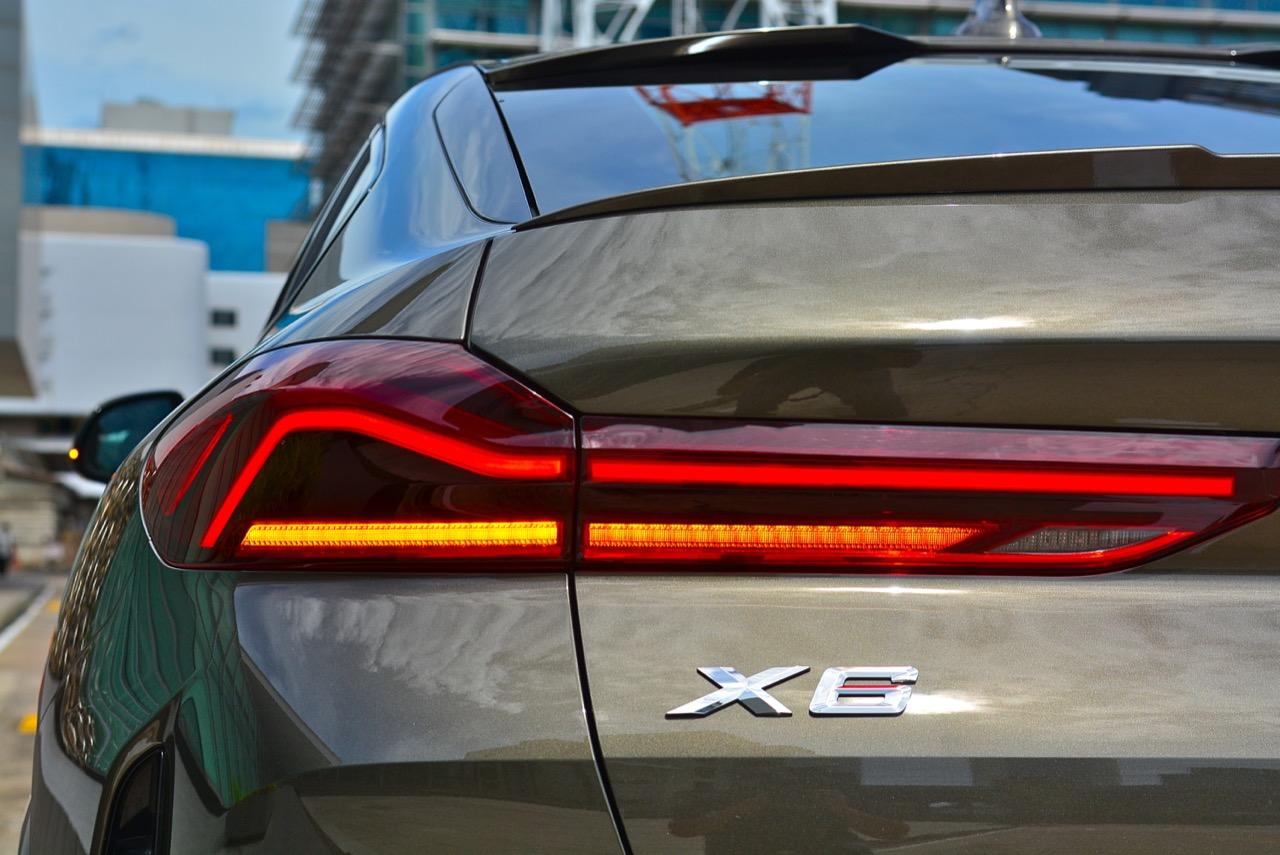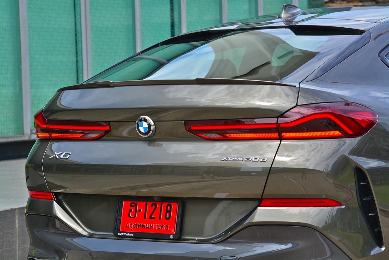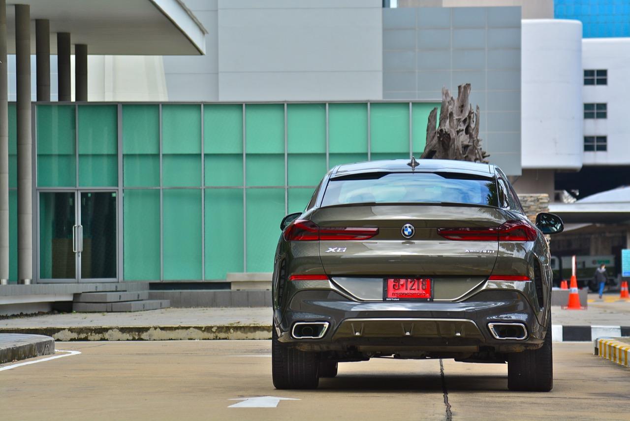 รูปลักษณ์ที่ดุดันของ X6 ใหม่ ส่วนหนึ่งเกิดจากความใหญ่ของล้ออัลลอย M ขนาด 22 นิ้ว เติมช่องเปิดบริเวณแก้มข้างที่เด่นชัด ห่อรัดด้วยยางสปอร์ตสมรรถนะสูง เพื่อทำให้ได้ประโยชน์จากการเพิ่มระดับของการยึดเกาะ เส้นหลังคาไหลลาดลงด้านหลัง ซึ่งลงท้ายด้วยความละเอียดอ่อน สปอยเลอร์ชิ้นเล็กๆ แปะติดกับขอบของฝาท้าย ซุ้มล้อหลังที่แผ่กว้างผสมผสานเข้ากับส่วนโค้งเว้าของการออกแบบกันชนหลัง บั้นท้ายของ X6 เป็นแบบแยกส่วนสองชั้นที่ใช้งานได้จริง มีการเพิ่มเติมความสวยงามด้วยการออกแบบไฟท้ายทรงยาวที่ขนานในแนวนอนไปกับขอบของฝาท้าย บั้นท้ายของมันยังได้รับการปรับปรุงประสิทธิภาพในด้านอากาศพลศาสตร์ ส่วนที่ลงตัวและซับซ้อนมากที่สุดก็คือ ฝาท้ายแนวของกันชนหลัง และแถบครีบรีดอากาศบริเวณชายล่างของกันชนหลัง ไฟท้าย LED รูปตัว L บางเฉียบ ประดับด้านบนของฝาท้ายโดยอยู่สูงเหนือท่อไอเสียทรงเหลี่ยม ซึ่งรวมอยู่ในแผงดิฟฟิวเซอร์ เป็นงานออกแบบที่ลงตัวและสวยงามไร้ที่ติ จุดนี้ BMW ทำออกมาได้ดีกว่าบั้นท้ายของรถคู่แข่ง