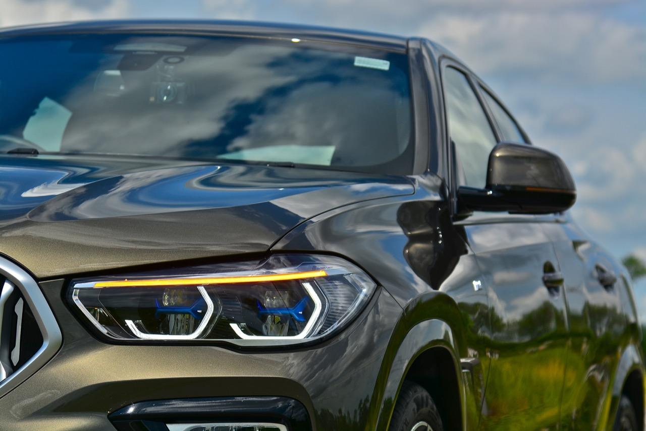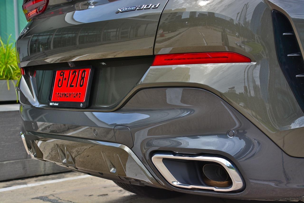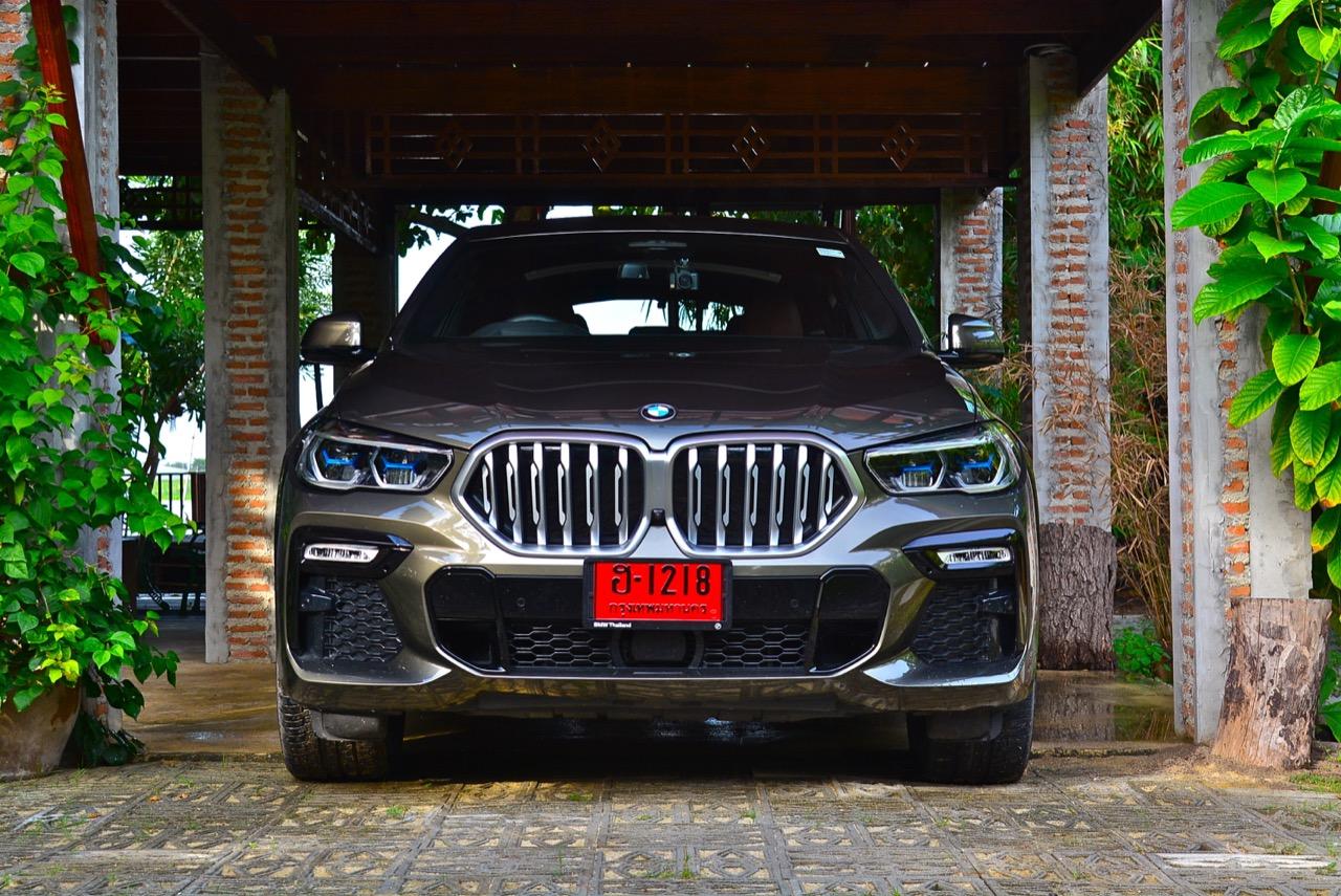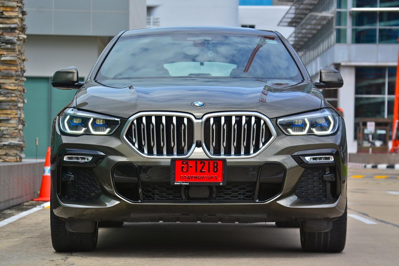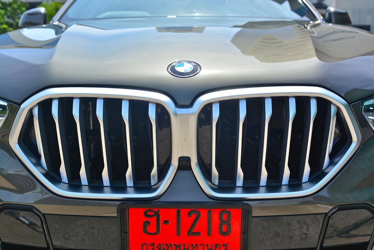 BMW X6 เดินทางมาถึงเจนเนอเรชั่นที่ 3 ด้วยรหัสตัวถัง G06 รถทดสอบรุ่น xDRIVE 30d M Sport สี Manhattan Green Metallic ยิ่งดูใกล้ๆ ก็ยิ่งทำให้นึกถึงแฮตชแบคทรงล้ำอนาคตที่ถูกขยายสัดส่วนทั้งความกว้าง ความยาว ส่วนความสูงลดลงเล็กน้อย ไฟหน้าและกระจังหน้าที่เป็นเอกลักษณ์ของรุ่นนั้นสวยงามดุดันมากกว่าเดิม เทคโนโลยีที่ก้าวล้ำของหลอดไฟ LED ที่ทำงานร่วมกับเซนเซอร์ในระบบส่องสว่างแบบอัตโนมัติด้วยระบบไฟ BMW Laser Adaptive LED ภายในกรอบไฟหน้าตกแต่งด้วยพลาสติกสีฟ้าที่มีรูปทรงคล้ายก้างปลา กระจังหน้าพร้อมระบบเปิด-ปิดอัตโนมัติ เมื่อเครื่องยนต์มีอุณหภูมิต่ำ กระจังจะปิดเพื่อกั้นไม่ให้กระแสลมไหลผ่าน ซึ่งทำให้แรงต้านอากาศลดลง กระจังจะเปิดออกเองโดยอัตโนมัติ เมื่อเซนเซอร์ตรวจพบว่าอุณหภูมิของห้องเครื่องยนต์อยู่ในเกณฑ์ที่จะต้องระบายความร้อนอย่างรวดเร็ว กันชน M มีช่องรับอากาศขนาดใหญ่ บริเวณใต้กระจังหน้าและด้านข้างของชุดกันชนทั้งสองฝั่ง แม้จะไม่ค่อยมีความจำเป็น เนื่องจากระบบไฟ LED นั้นสว่างมาก แต่ BMW ก็ยังติดตั้งไฟตัดหมอกมาให้ เพื่อเพิ่มความสว่างขณะขับบนถนนที่กำลังมีหมอกลงจัด