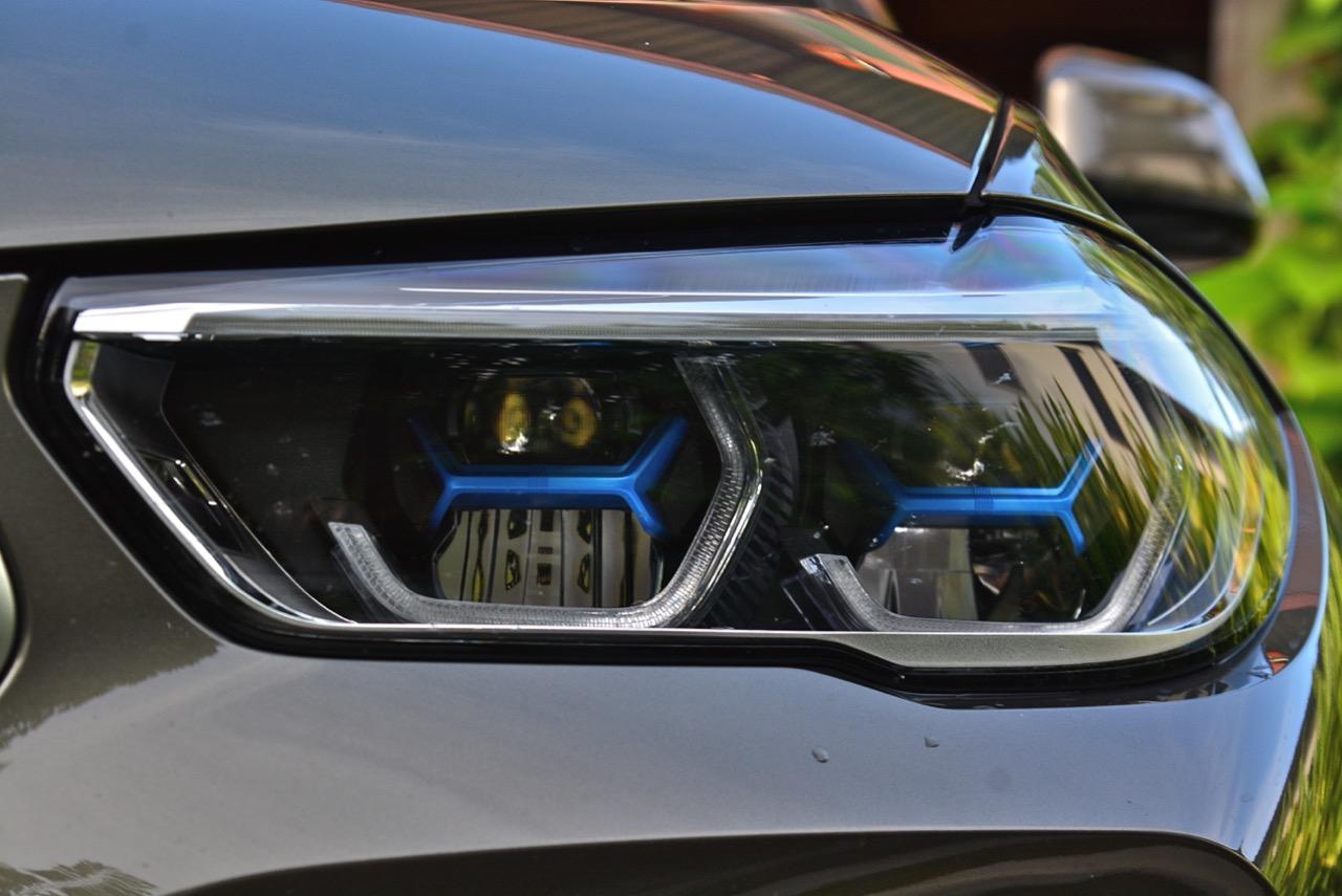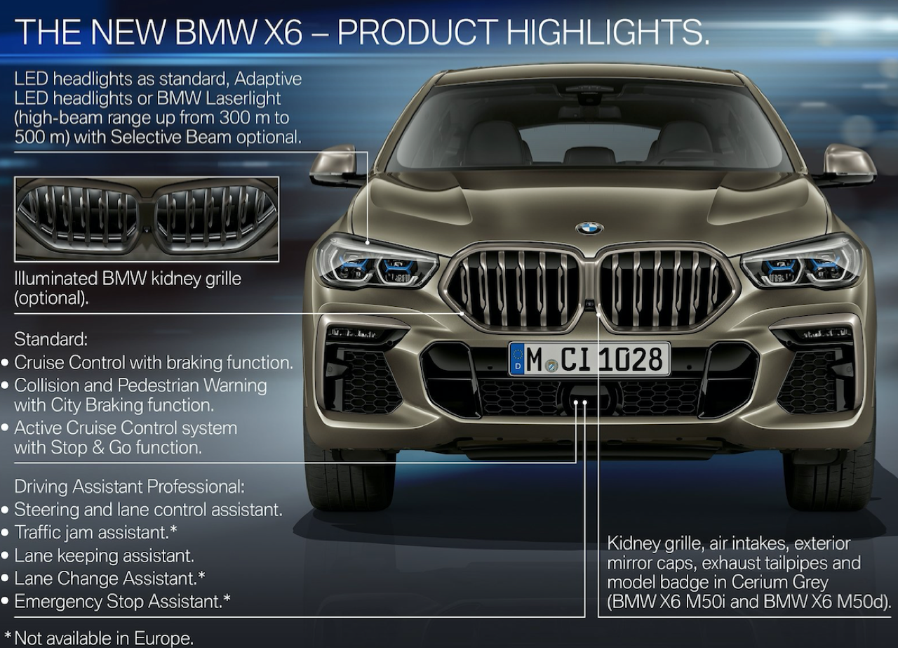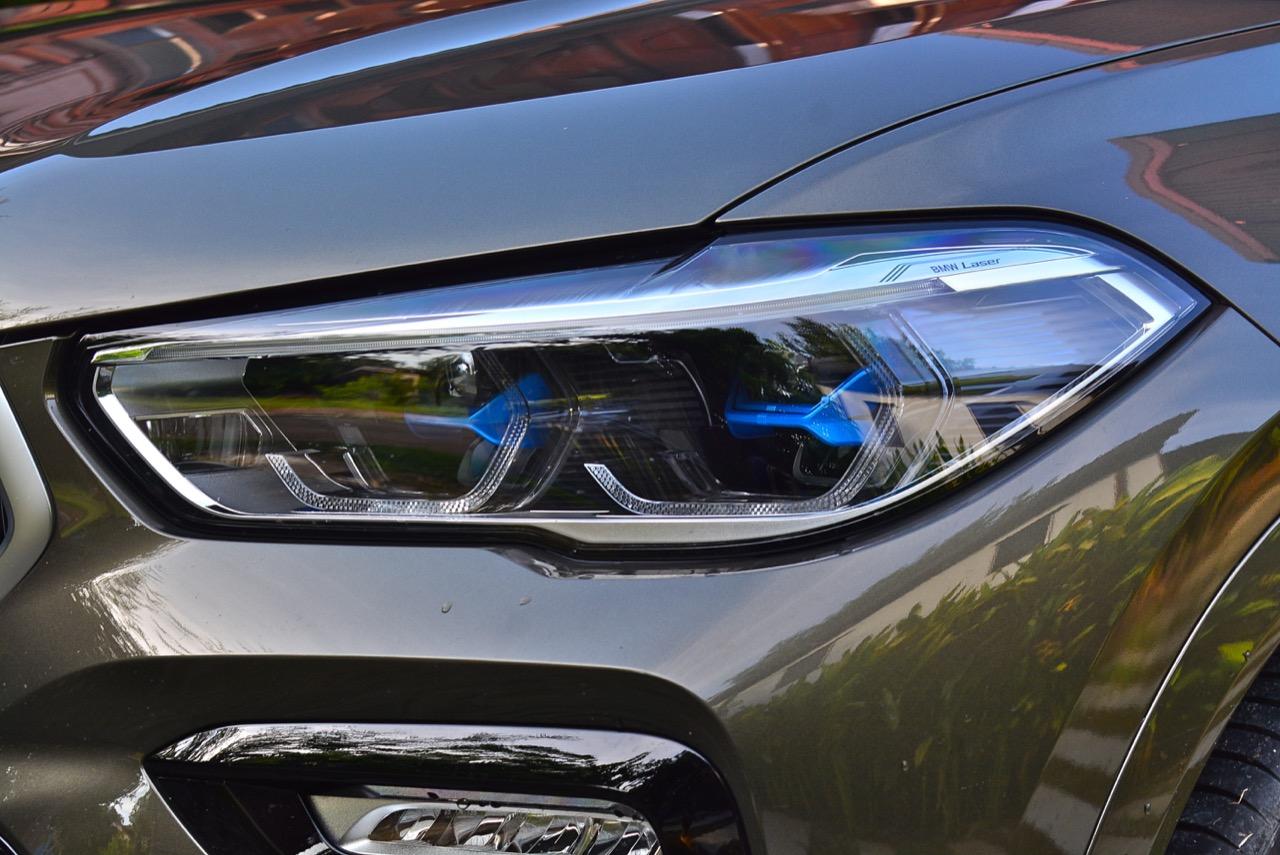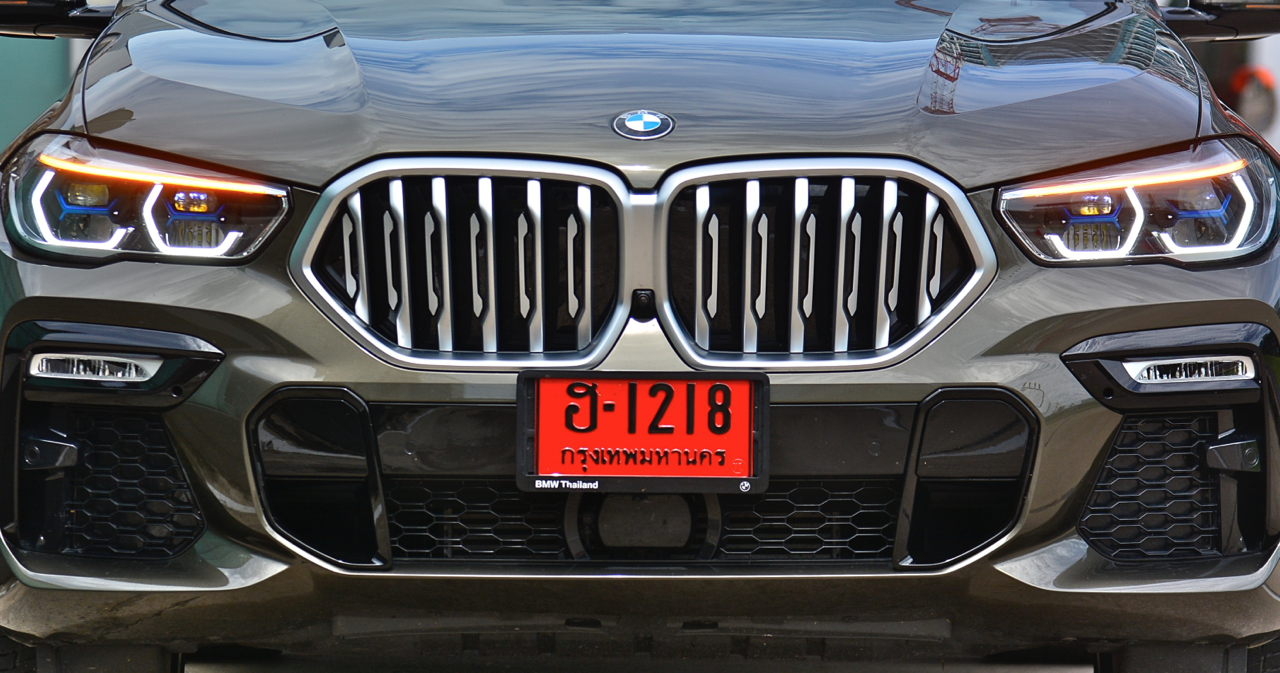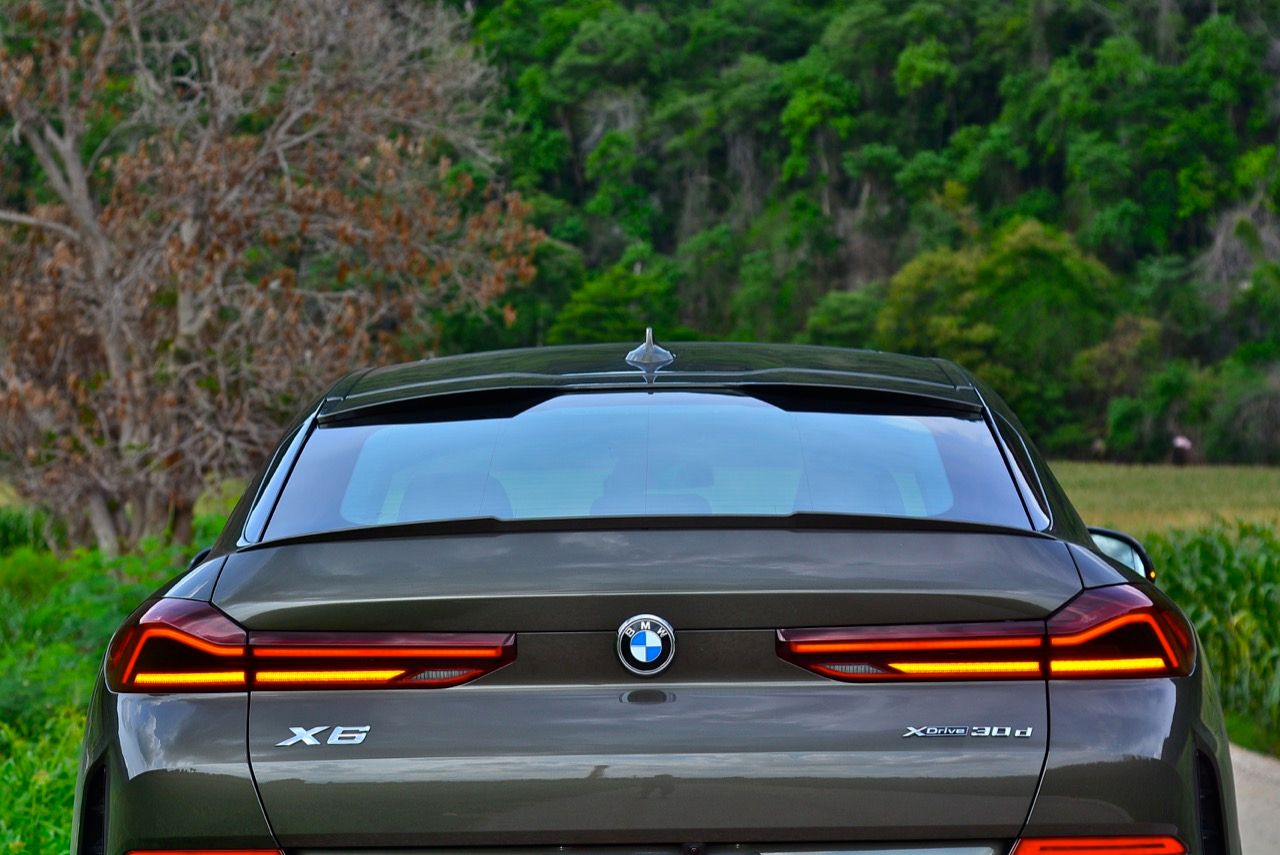 BMW X6 เดินทางมาถึงเจนเนอเรชั่นที่ 3 ด้วยรหัสตัวถัง G06 รถทดสอบรุ่น xDRIVE 30d M Sport สี Manhattan Green Metallic ยิ่งดูใกล้ๆ ก็ยิ่งทำให้นึกถึงแฮตชแบคทรงล้ำอนาคตที่ถูกขยายสัดส่วนทั้งความกว้าง ความยาว ส่วนความสูงลดลงเล็กน้อย ไฟหน้าและกระจังหน้าที่เป็นเอกลักษณ์ของรุ่นนั้นสวยงามดุดันมากกว่าเดิม เทคโนโลยีที่ก้าวล้ำของหลอดไฟ LED ที่ทำงานร่วมกับเซนเซอร์ในระบบส่องสว่างแบบอัตโนมัติด้วยระบบไฟ BMW Laser Adaptive LED ภายในกรอบไฟหน้าตกแต่งด้วยพลาสติกสีฟ้าที่มีรูปทรงคล้ายก้างปลา กระจังหน้าพร้อมระบบเปิด-ปิดอัตโนมัติ เมื่อเครื่องยนต์มีอุณหภูมิต่ำ กระจังจะปิดเพื่อกั้นไม่ให้กระแสลมไหลผ่าน ซึ่งทำให้แรงต้านอากาศลดลง กระจังจะเปิดออกเองโดยอัตโนมัติ เมื่อเซนเซอร์ตรวจพบว่าอุณหภูมิของห้องเครื่องยนต์อยู่ในเกณฑ์ที่จะต้องระบายความร้อนอย่างรวดเร็ว กันชน M มีช่องรับอากาศขนาดใหญ่ บริเวณใต้กระจังหน้าและด้านข้างของชุดกันชนทั้งสองฝั่ง แม้จะไม่ค่อยมีความจำเป็น เนื่องจากระบบไฟ LED นั้นสว่างมาก แต่ BMW ก็ยังติดตั้งไฟตัดหมอกมาให้ เพื่อเพิ่มความสว่างขณะขับบนถนนที่กำลังมีหมอกลงจัด