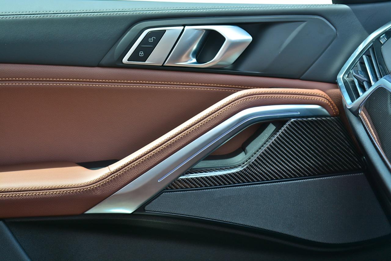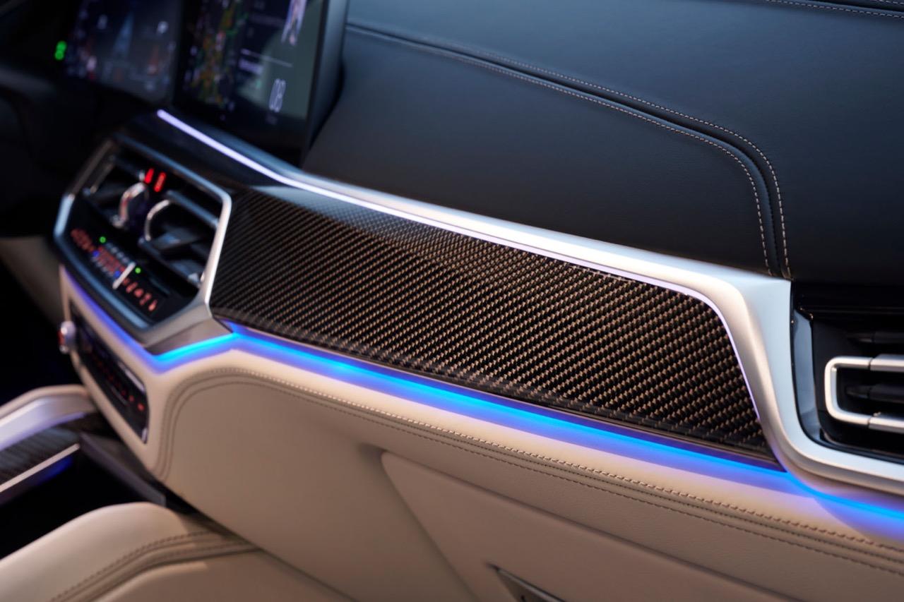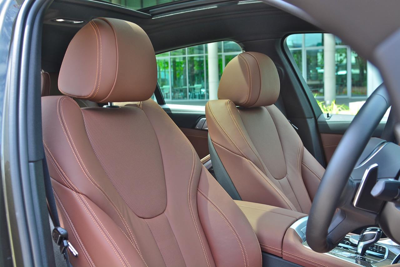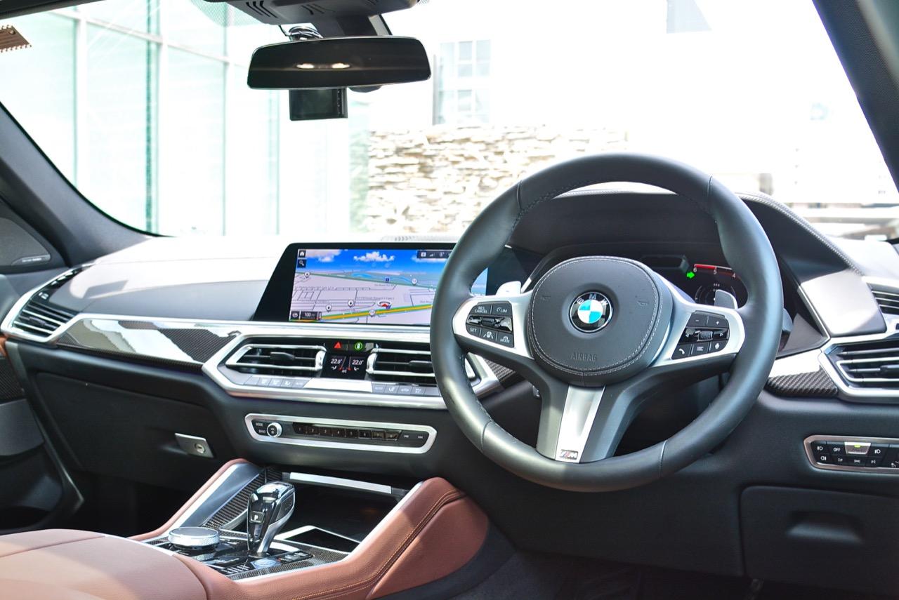 พื้นที่ภายในโปร่งโล่งจากความสูงของหลังคา ยิ่งไม่ได้ติดฟิล์มกรองแสงก็ยิ่งกระจ่างตา มองเห็นรอบๆ ตัวได้อย่างชัดเจน แดชบอร์ดแบบใหม่ใหญ่โตเหมือนเดิม แบ่งการใช้งานหลักๆ ของอุปกรณ์โดยเอียงเข้าหาคนขับเพื่อความสะดวกคล่องตัวในการใช้นิ้วกดเบาๆ หรือหมุน คอนโซลหน้าปรับรูปแบบตามสไตล์ของ BMW ยุคใหม่ มีความหรูหราทุกกระเบียดนิ้วด้วยวัสดุชั้นดี ช่องแอร์ทรงเหลี่ยมล้อมกรอบด้วยพลาสติกที่ทำออกมาให้คล้ายกับอะลูมิเนียม กึ่งกลางแดชบอร์ดตกแต่งด้วยวัสดุคาร์บอนไฟเบอร์ แผงควบคุมระบบปรับอากาศดิจิทัล มีหน้าตาเหมือนกับของ X5 xDRIVE 45e แผงประตูเต็มไปด้วยรายละเอียดของงานดีไซน์ที่ทันสมัยพร้อมวัสดุชั้นดี เพื่อยกระดับความน่าใช้ แผงประตูงดงามจากงานหนังที่ประณีต พลาสติกเดินเส้นข้างมือจับประตูสีเงิน และกรวยลำโพง Harman Kardon พร้อมแผงคาร์บอนไฟเบอร์ เชื่อมโยงกับกึ่งกลางของแดชบอร์ดอย่างลงตัว ซุ้มเกียร์เต็มไปด้วยปุ่มและสวิชท์ที่ใช้สั่งงานต่างๆ รวมไปถึงปุ่มปรับโหมด 4 ระดับการขับเคลื่อน
