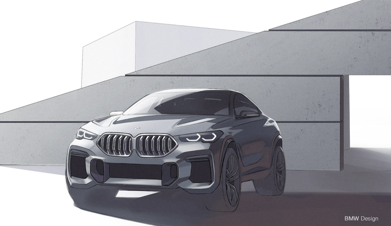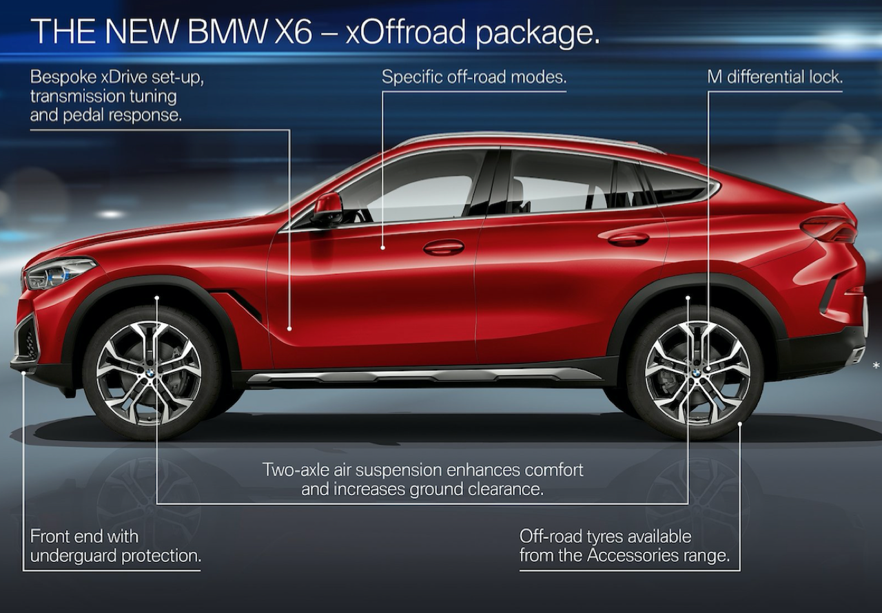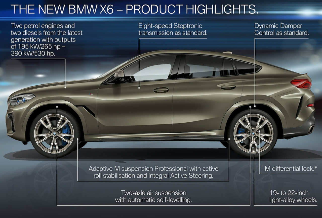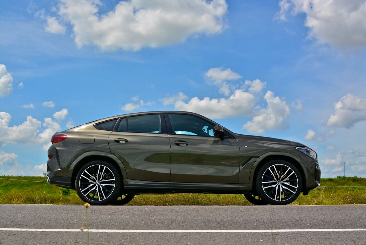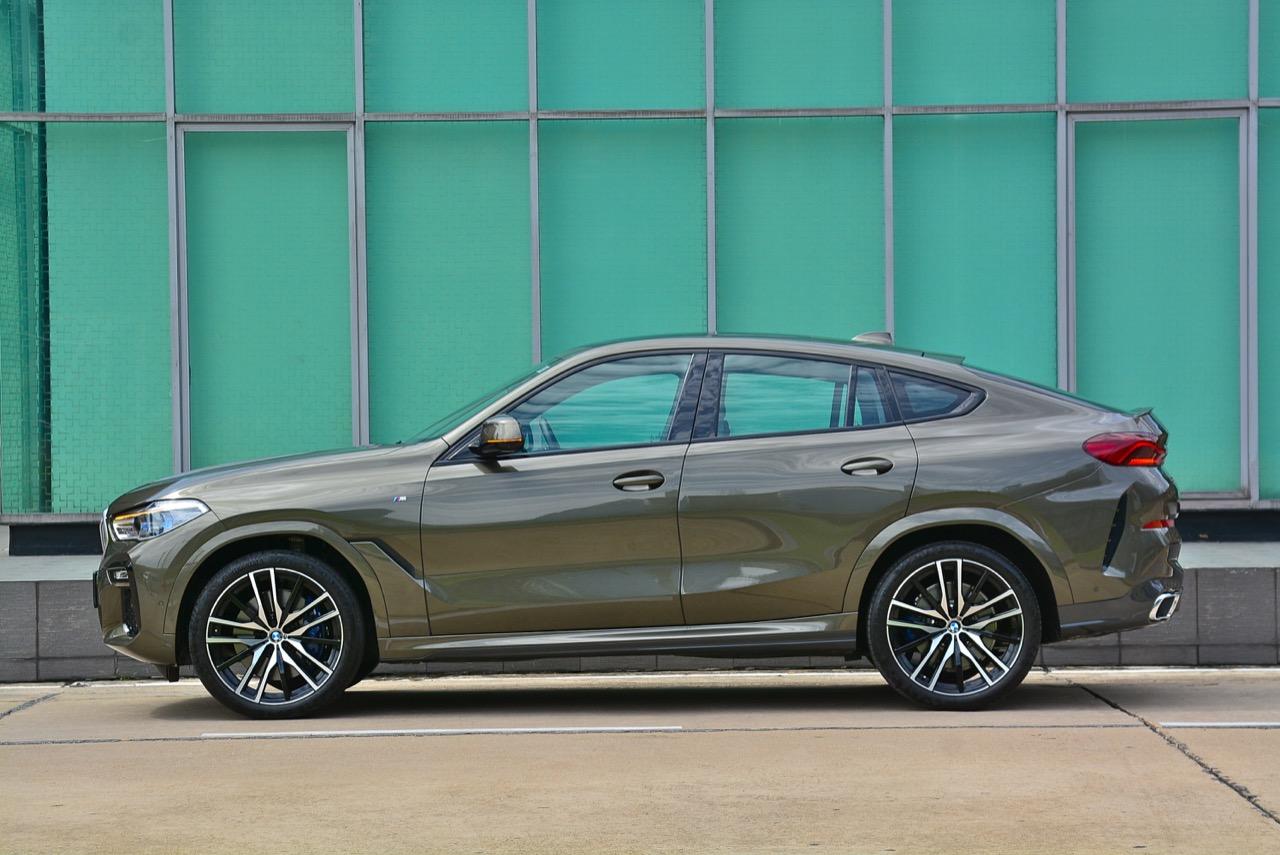 ฝากระโปรงหน้าทำจากอะลูมิเนียมช่วยลดน้ำหนักและเพิ่มความสวยงาม แนวเสาหน้าที่มีองศาของความลาดเอียงราวกับรถสปอร์ต หลังคากระจก Panoramic กินพื้นที่เกือบทั้งหมดของผืนหลังคาและทำงานด้วยระบบไฟฟ้า คุณสามารถเปิดออกได้จนหมดในวันที่มีอากาศดี หลังคากระจกยังเป็นออปชั่นที่ลูกค้าชื่นชอบ แม้ว่าจะไม่ค่อยเปิดใช้งาน แต่มีไว้เพื่อความเท่ก็ดีเหมือนกัน! แนวหลังคาที่ลาดเทลงไปยังส่วนท้ายแบบ Coupe กำลังเป็นที่นิยมอย่างสูงสำหรับรถเอสยูวีของเยอรมัน ไม่ว่าจะเป็น Mercedes-Benz GLE Coupe กับ Audi Q8 คู่แข่งโดยตรงของ X6 รวมไปถึง Porsche Cayenne Coupe รุ่น E Hybrid ที่มีราคาถูกกว่า X6 ใหม่ (แต่มีออปชั่นน้อยกว่า X6 แบบเทียบกันไม่ติด) ด้านข้าตัวถังมีแนวซุ้มล้อที่ลงตัว แก้มข้างออกแบบให้มีช่องระบายอากาศที่สอดรับกับแนวโค้งของซุ้มล้อหน้า
