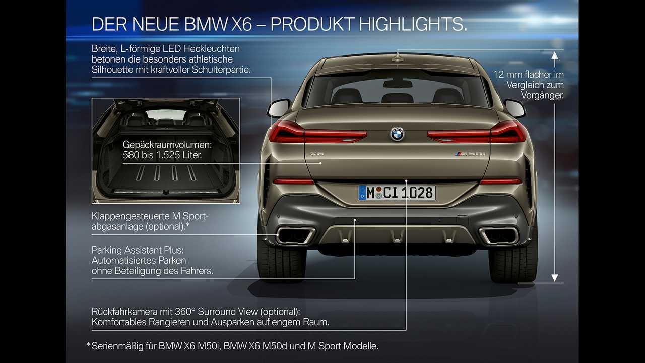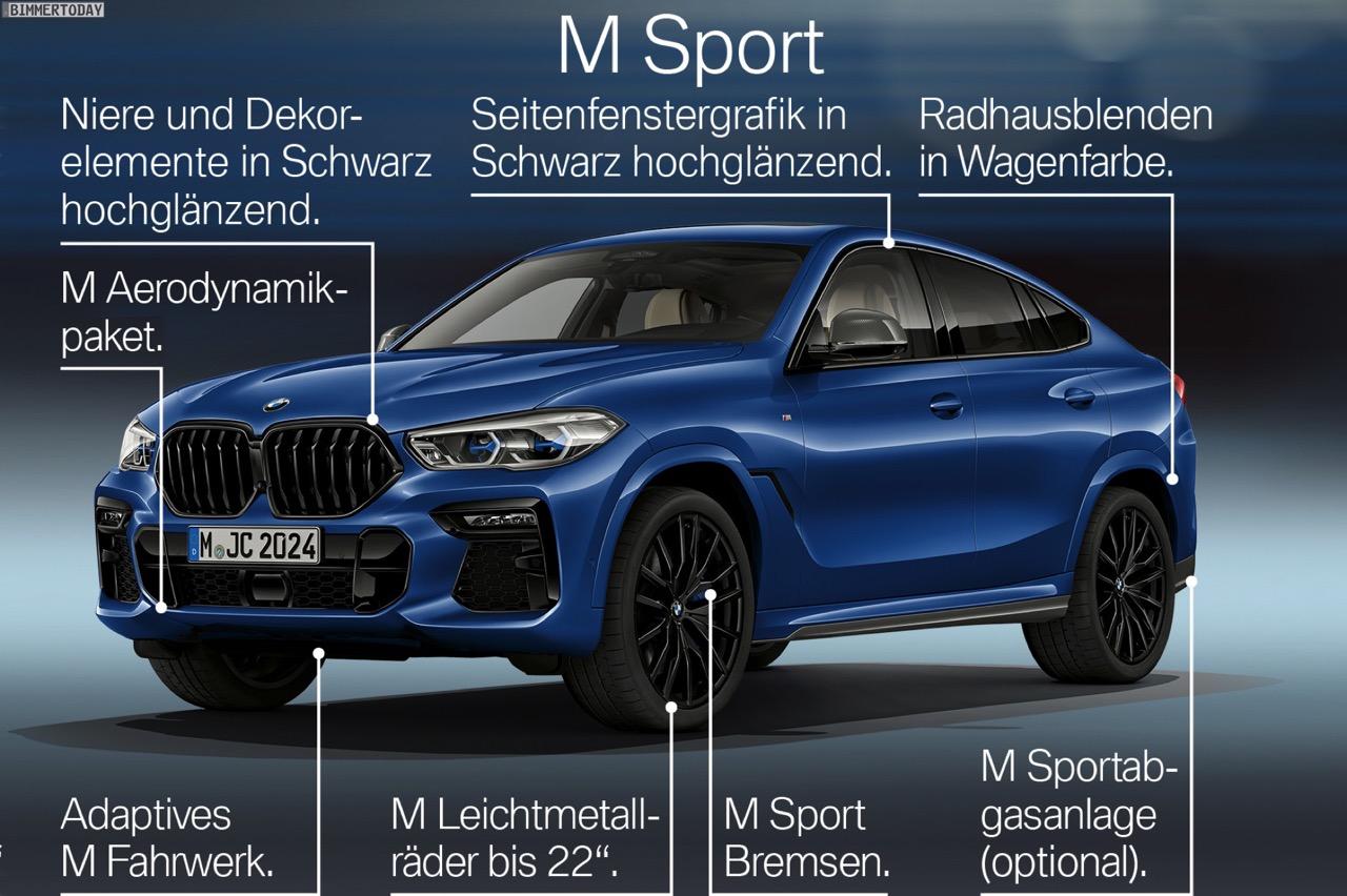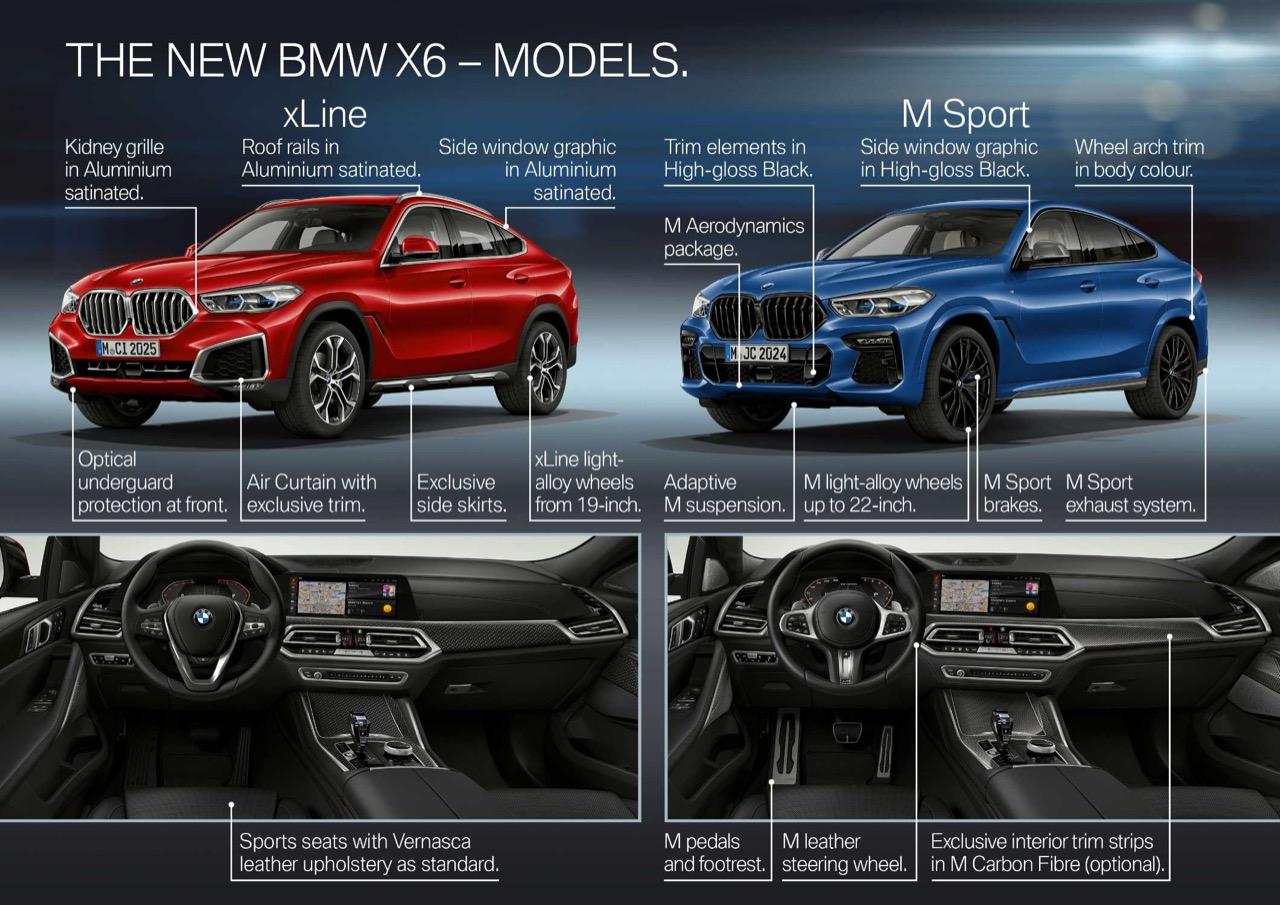 ขนาดของ X6 เจนเนอเรชั่นที่ 3 ประจำปี 2020 มีความยาวโดยรวมเพิ่มขึ้นเล็กน้อย 25.4 มิลลิเมตร, ฐานล้อ ยาวขึ้นอีก 40 มิลลิเมตร (+1.6 นิ้ว) ความกว้างตัวถังเพิ่มขึ้นเล็กน้อยที่ 15 มิลลิเมตร (+0.6 นิ้ว) ในขณะที่ความสูงลดลงโดยเฉลี่ย 18 มิลลิเมตร (0.7 นิ้ว) สำหรับระบบอากาศพลศาสตร์ มีการปรับปรุงแก้ใขให้ดีขึ้น โดยมีจุดศูนย์ถ่วงที่ต่ำลง ช่วยเพิ่มความคล่องตัวให้กับ X6 อุปกรณ์แนวๆ ที่ทันสมัยและสวยงาม ถูกเพิ่มเข้ามาเพื่อความน่าใช้งาน BMW X6 รุ่นใหม่ ยังทำหน้าที่เป็นเอสเอวีรุ่นเปิดตัว สำหรับกระจังหน้าทรงไตคู่แบบใหม่จาก BMW ซึ่งเป็นอุปกรณ์เสริม ด้วยการติดตั้งระบบไฟส่องสว่าง LED ในชุดกระจัง สามารถเปิดใช้งานได้ โดยการปลดล็อกหรือล็อครถ หรือเปิดและปิดด้วยระบบอัตโนมัติ กระจังหน้าแบบส่องสว่างด้วยชุดไฟ LED เป็นส่วนหนึ่งของคุณสมบัติไฟหรี่กลางวัน LED Daytime Runing Light กระจังหน้าทรงไตคู่แบบชิ้นเดียวของ BMW ขนาดใหญ่พร้อมแผ่นเปิดปิดอากาศแบบแอกทีฟ ขนาบข้างด้วยกรอบกระจังทรงสี่เหลี่ยมคางหมู ไฟหน้า Adaptive Full LED ช่องเปิดรับอากาศขนาดใหญ่ของชุดกันชน M และเส้นที่แหลมคมของชุดกันชน M คืองานดีไซน์ที่ลงตัวมากกว่า X6 รุ่นที่แล้วอย่างชัดเจน