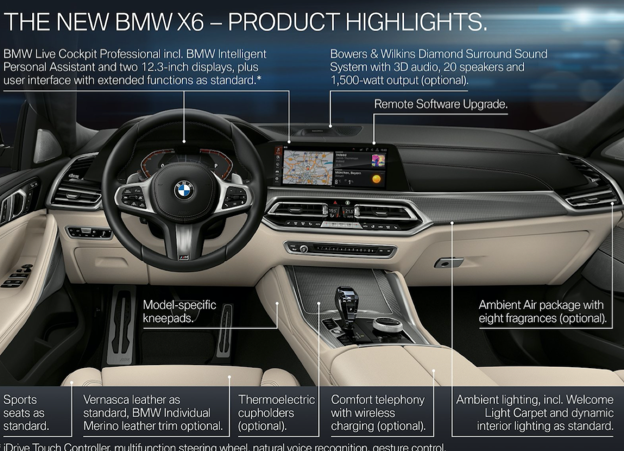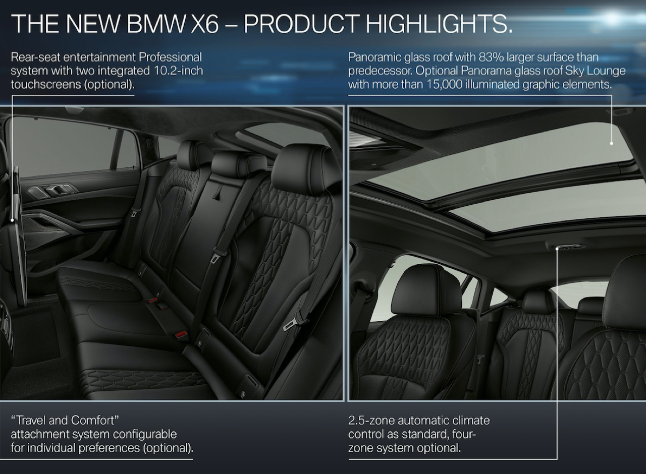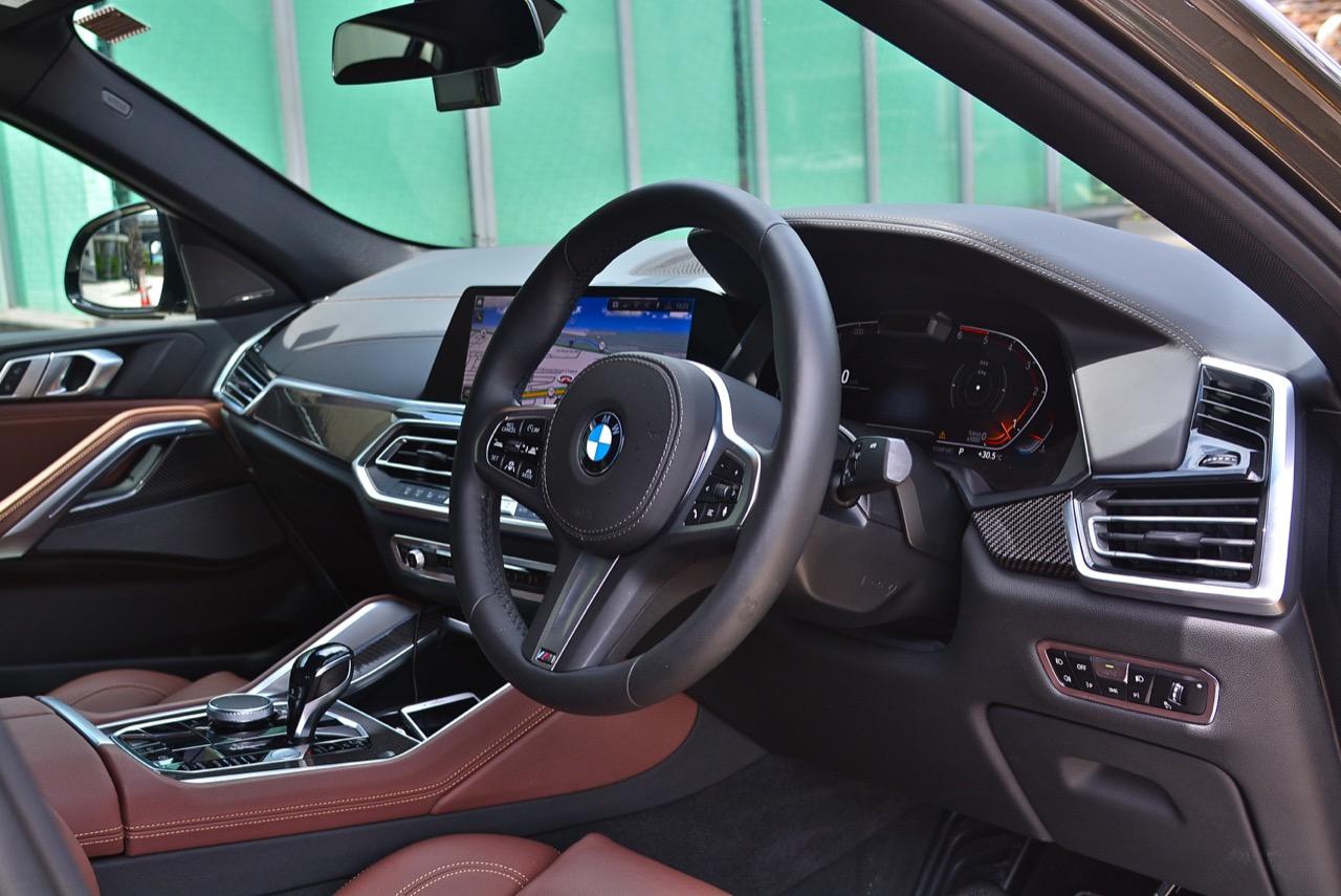 เนื่องจากมีคู่แข่งอย่าง Mercedes-Benz New GLE Coupe / Audi Q8 / Porsche Cayenne Coupe ซึ่งรถคู่ต่อสู้แต่ละแบรนด์นั้น จัดงานตกแต่งภายในมาอย่างเต็มเหนี่ยว เพื่อดึงดูดใจของลูกค้าที่กำลังอยากได้ ภายในของ New X6 xDRIVE 30d M Sport จึงมีความจำเป็นที่จะต้องจัดเต็มทรง ในด้านความหรูหราของวัสดุตกแต่งและงานดีไซน์ ภายในที่ถูกจริตคนรวยจากวัสดุและโทนสี ขนาดความกว้างของพื้นที่ เบาะแถวที่สองออกแบบให้แบ่งพับในอัตราส่วน 40:20:40 สำหรับการขนของที่มีขนาดความยาวมากๆ พวกกระดานโต้คลื่นหรือจักรยานเสือหมอบ หรือจะพับให้ราบลงเพื่อเปิดพื้นที่สำหรับการขนแม้กระทั่งจักรยานเสือภูเขา เบาะหน้าปรับไฟฟ้าพร้อมหน่วยความจำ หุ้มหนังแท้สีน้ำตาลเข้มอย่างหรู เป็นเบาะหนังที่นุ่มนิ่มนั่งสบายก้น พร้อมกลไกมอเตอร์ไฟฟ้าสำหรับการปรับท่านั่งที่ครอบคลุมไม่ว่าคุณจะมีรูปร่างแบบไหน เบาะคู่หน้า ออกแบบให้มีขนาดใหญ่ โอบอุ้มสรีระทั้งคนขับและผู้โดยสารตอนหน้าได้เป็นอย่างดี นั่งขับทั้งวันก็ยังไม่มีอาการเมื่อยตัว ปราศจากอาการปวดบริเวณแผ่นหลัง ต้นคอ หรือเอว เป็นเบาะที่วางตำแหน่งพร้อมการปรับด้วยไฟฟ้าที่ละเอียดยิบ เบาะแถวหลังพับได้เพื่อเพิ่มพื้นที่เก็บสัมภาระ ออปชั่นพิเศษติดมาให้ใช้งานด้วยหลังคากระจก panoramic roof ใหญ่โตครอบคลุมผืนหลังคาทั้งหมดด้วยกระจกและม่านบังแดดที่สามารถเลื่อนเปิด-ปิดได้
