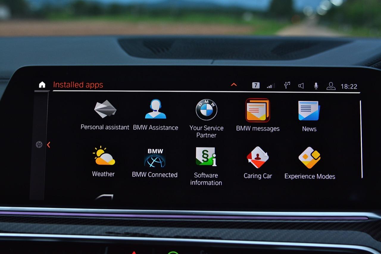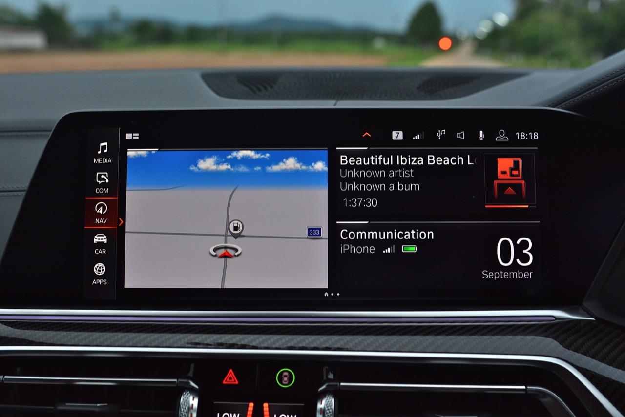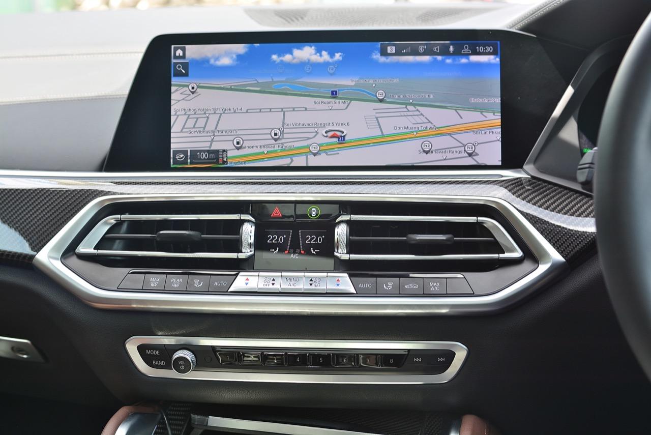 กึ่งกลางแดชบอร์ดคาดด้วยชิ้นงานตกแต่งคาร์บอนไฟเบอร์ ด้านบนติดตั้งจอภาพมอนิเตอร์ขนาดใหญ่ 12.3 นิ้ว พร้อมระบบสั่งงานผ่าน iDRIVE หรือจะสั่งงานด้วยการใช้นิ้วสัมผัสที่หน้าจอก็ยังได้ จอภาพมอนิเตอร์ขนาดยักษ์แบบ Panorama บรรจุโปรแกรมต่างๆ เปรียบเหมือนกับคอมพิวเตอร์ส่วนกลางของรถ มีมาให้ครบ เช่น กล้องมองรอบทิศทางความคมชัดสูง ไม่เกี่ยงแม้ใช้งานตอนกลางคืนก็ยังชัดแจ่ม กล้องมองรอบทิศทางแบบ 360 องศา มาพร้อมเส้นระนาบในการกะระยะถอย เชื่อมโยงกับระบบนำจอดอัตโนมัติ ระบบนำทางด้วยดาวเทียม วิทยุ AM / FM เชื่อมต่ออุปกรณ์ภายนอกในระบบบลูทูธ รองรับแอปพลิเคชันต่างๆ เพียบ จอแสดงผลกลางยังใช้ปรับตั้งค่าต่างๆ เช่น ระบบไฟ ระบบปรับอากาศ ระบบเครื่องเสียง แสดงผลอัตราสิ้นเปลืองเชื้อเพลิง เวลาและวันที่รวมถึงอุณหภูมิ การตั้งค่าล็อกหรือปลดล็อกประตู แรงดันลมยาง การแจ้งเตือนต่างๆ ของระบบขับเคลื่อน การปรับตั้งระบบส่องสว่างทั้งภายนอกและภายใน ที่เจ๋งมากก็คือ ระบบนำทางด้วยดาวเทียมแบบใหม่ของ BMW ที่แจ้งสภาพการจราจรในแบบ Realtime