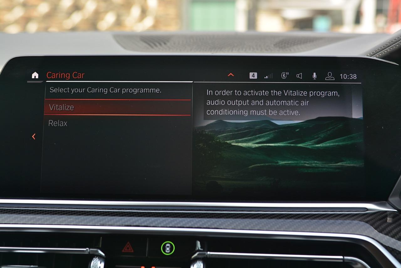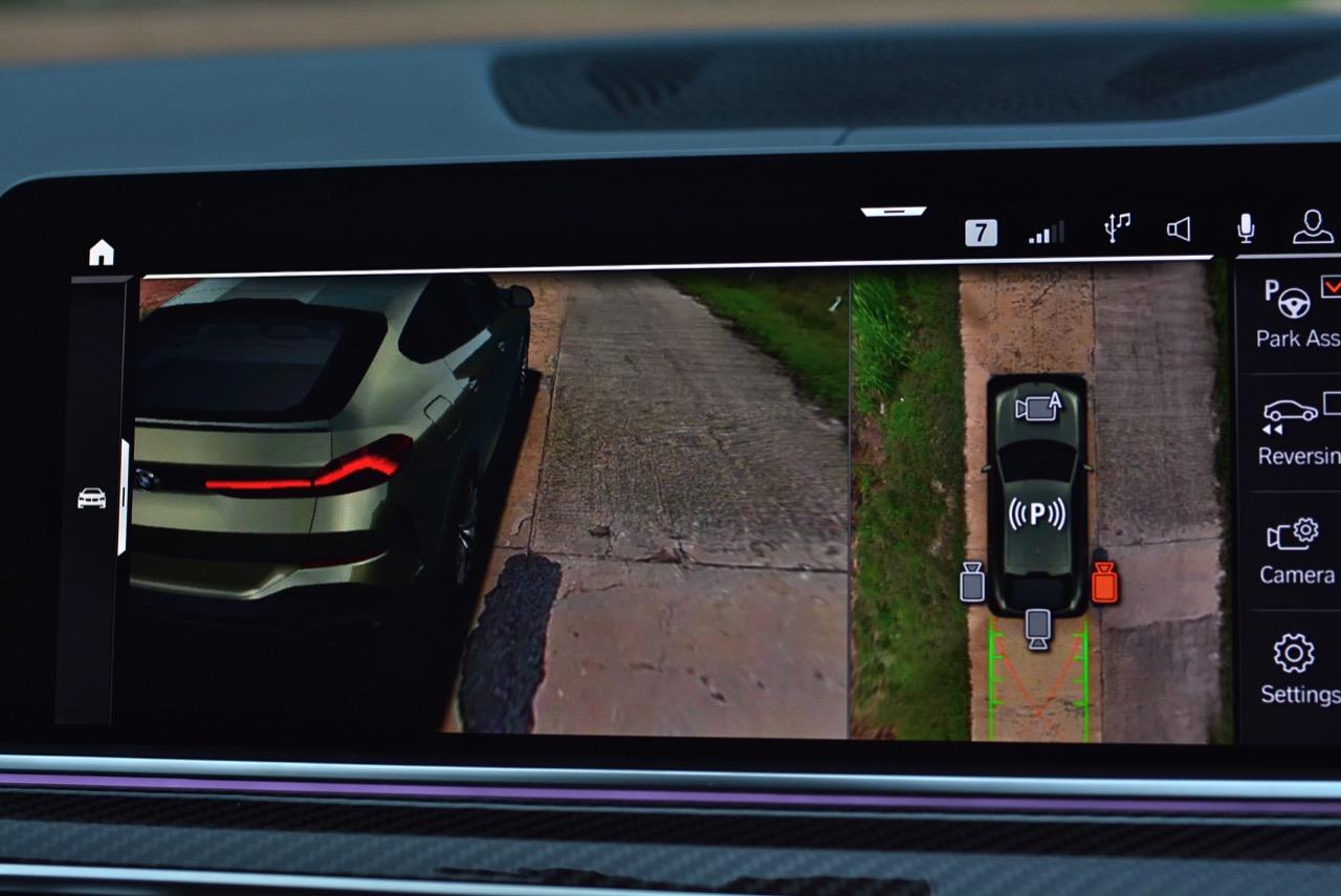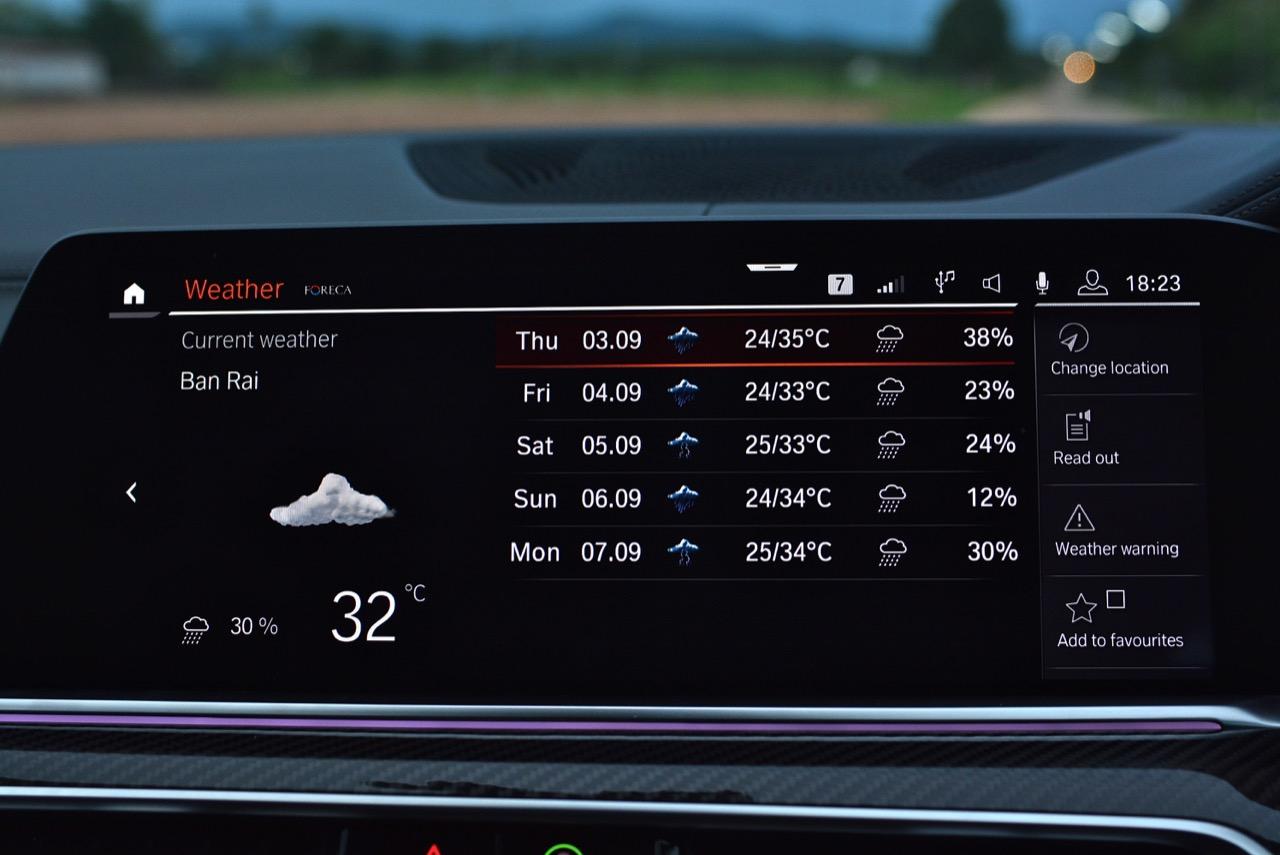 กึ่งกลางแดชบอร์ดคาดด้วยชิ้นงานตกแต่งคาร์บอนไฟเบอร์ ด้านบนติดตั้งจอภาพมอนิเตอร์ขนาดใหญ่ 12.3 นิ้ว พร้อมระบบสั่งงานผ่าน iDRIVE หรือจะสั่งงานด้วยการใช้นิ้วสัมผัสที่หน้าจอก็ยังได้ จอภาพมอนิเตอร์ขนาดยักษ์แบบ Panorama บรรจุโปรแกรมต่างๆ เปรียบเหมือนกับคอมพิวเตอร์ส่วนกลางของรถ มีมาให้ครบ เช่น กล้องมองรอบทิศทางความคมชัดสูง ไม่เกี่ยงแม้ใช้งานตอนกลางคืนก็ยังชัดแจ่ม กล้องมองรอบทิศทางแบบ 360 องศา มาพร้อมเส้นระนาบในการกะระยะถอย เชื่อมโยงกับระบบนำจอดอัตโนมัติ ระบบนำทางด้วยดาวเทียม วิทยุ AM / FM เชื่อมต่ออุปกรณ์ภายนอกในระบบบลูทูธ รองรับแอปพลิเคชันต่างๆ เพียบ จอแสดงผลกลางยังใช้ปรับตั้งค่าต่างๆ เช่น ระบบไฟ ระบบปรับอากาศ ระบบเครื่องเสียง แสดงผลอัตราสิ้นเปลืองเชื้อเพลิง เวลาและวันที่รวมถึงอุณหภูมิ การตั้งค่าล็อกหรือปลดล็อกประตู แรงดันลมยาง การแจ้งเตือนต่างๆ ของระบบขับเคลื่อน การปรับตั้งระบบส่องสว่างทั้งภายนอกและภายใน ที่เจ๋งมากก็คือ ระบบนำทางด้วยดาวเทียมแบบใหม่ของ BMW ที่แจ้งสภาพการจราจรในแบบ Realtime