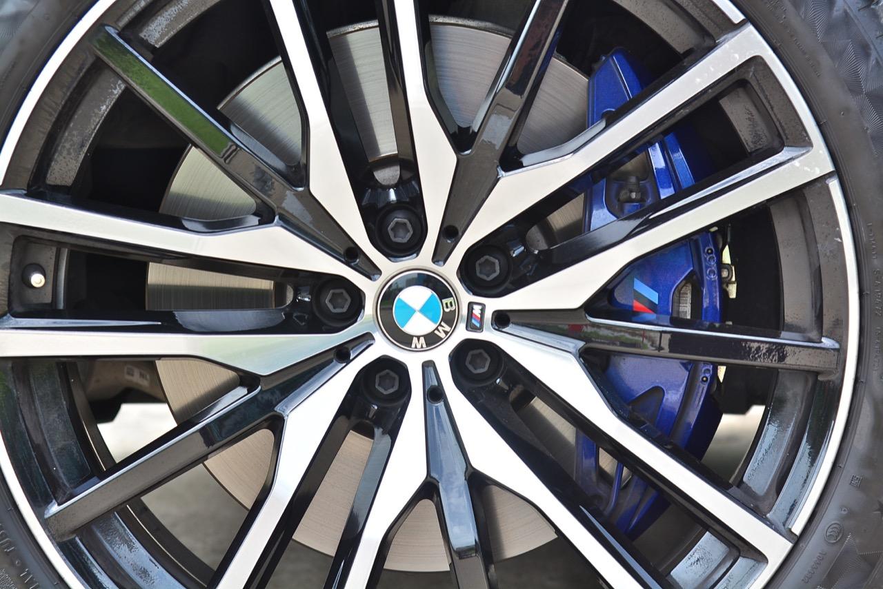 ล้ออะลูมิเนียมลายใหม่ของ M ล้อหน้าขนาดความกว้าง 9.5 J x 22" ห่อรัดด้วยยางสปอร์ต Continental Premium Contact 6 ไซส์ยางหน้า 275/35 R22 ส่วนล้อหลังเล่นใหญ่ขึ้นมาอีกนิดที่ 10.5 J x 22" ไซส์ยางหลัง ล่อกันถึง 315/30 R22 เปลี่ยนยางแต่ละครั้ง ถ้าไม่รวยจริงนี่มีสะดุ้ง X6 xDRIVE 30d คันทดสอบ มีน้ำหนักตัวมากถึง 2,235 กิโลกรัม ต้องยัดเบรกประสิทธิภาพสูงของ BMW M Performance Brakes คาร์ลิปเปอร์เบรกหน้า M แบบ 4 พอต สีน้ำเงิน พร้อมจานเบรกขนาด 400 มิลลิเมตร เบรกหลังแบบซิงเกิลพอต เส้นผ่าศูนย์กลางจานเบรกหลัง 370 มิลลิเมตร