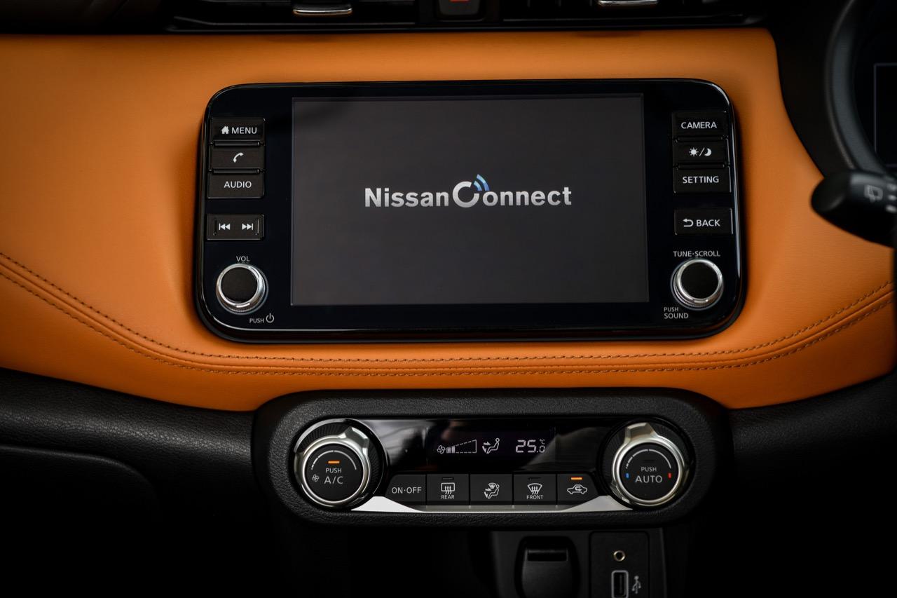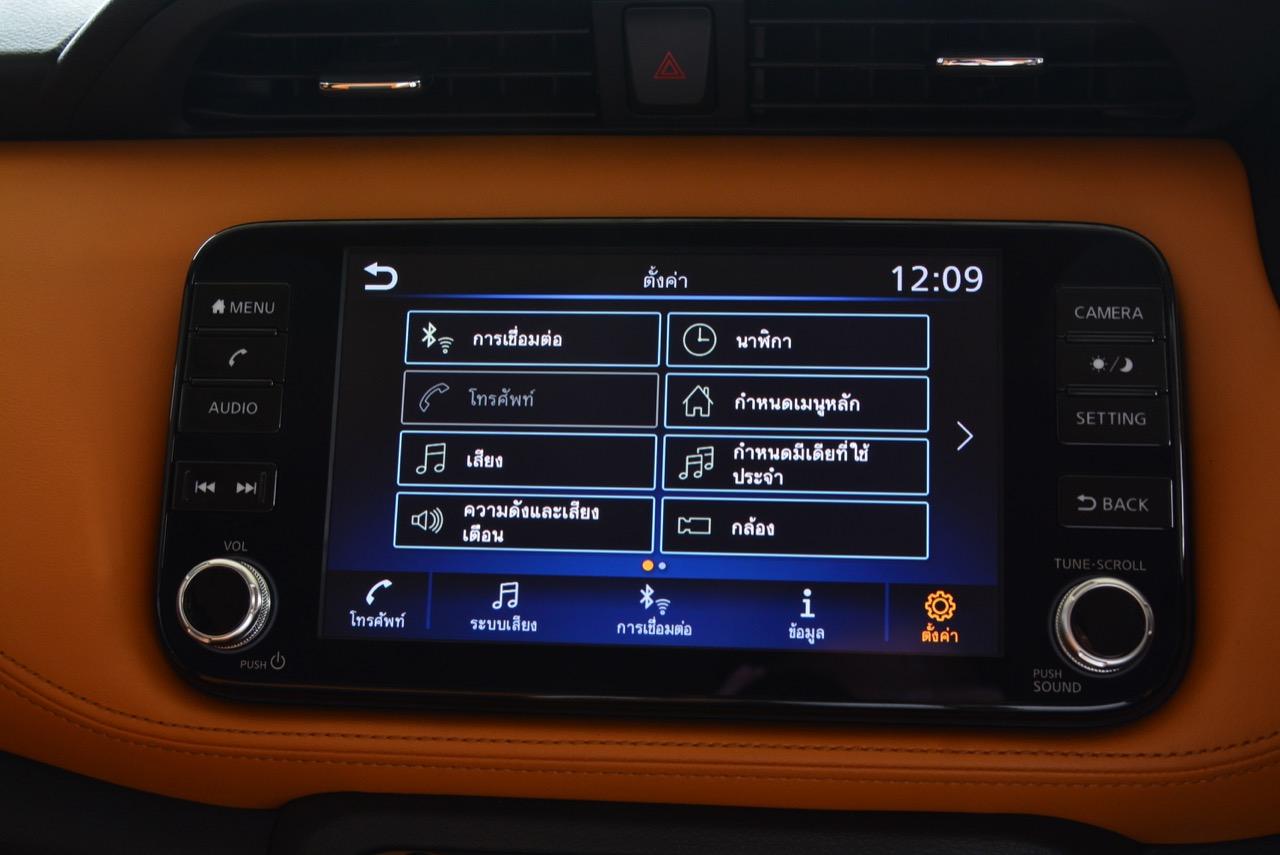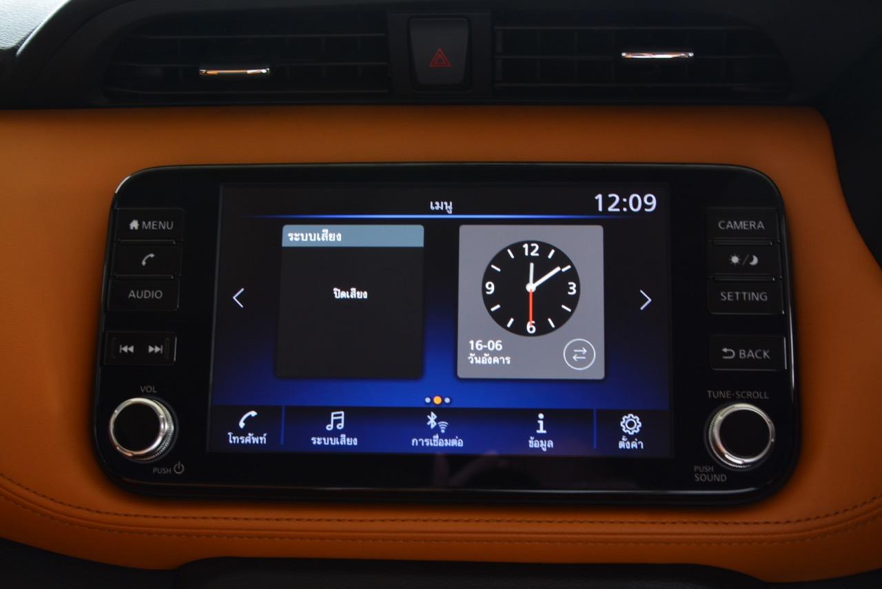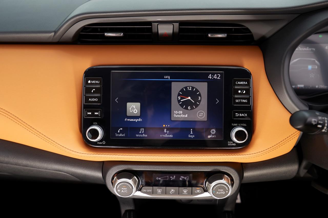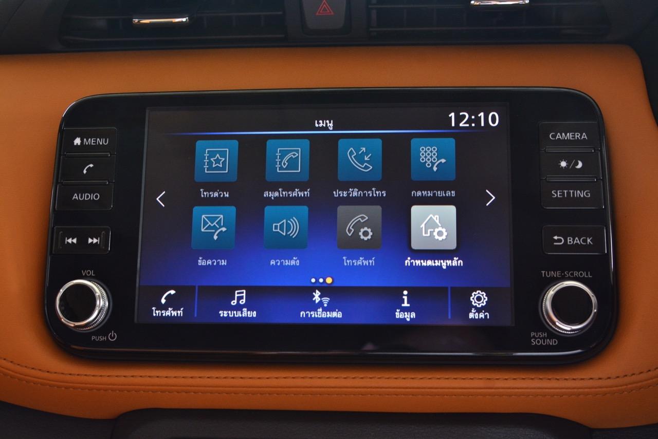 พวงมาลัยสามก้าน หุ้มหนังตกแต่งด้วยสีเงินสไตล์สปอร์ตปรับระดับได้ ก้านวงติดตั้งสวิตช์ควบคุมระบบเครื่องเสียง และระบบโทรศัพท์ กับสวิตช์ควบคุมหน้าจอมาตรวัดแสดงผลข้อมูลการขับขี่แบบ TFT เป็นมาตรวัดแบบเรืองแสง Fine Vision Meter แบบ Digital ผ่านจอ TFT ขนาด 7 นิ้ว ส่วนจอมอนิเตอร์กลางขนาด 8 นิ้ว รองรับระบบข้อมูลและความบันเทิง Nissan Connect หน้าจอสั่งงานด้วยระบบสัมผัส พร้อมช่องเชื่อมต่อ Bluetooth®, USB และ AUX IN สำหรับอุปกรณ์ต่อพ่วง ระบบเชื่อมต่อโทรศัพท์สมาร์ทโฟน Apple CarPlay® (สำหรับระบบปฏิบัติการ iOS) ระบบเชื่อมต่อโทรศัพท์ไร้สายแบบ Bluetooth