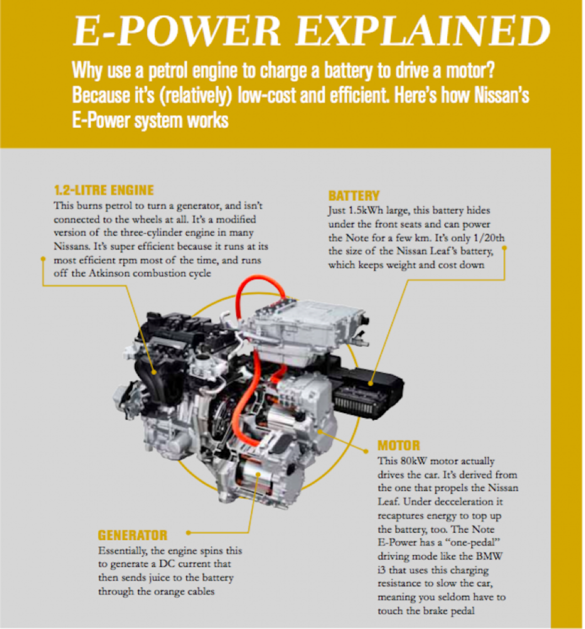 e-Power เทคโนโลยีระบบขับเคลื่อนแบบใหม่ที่ถือเป็นเอกสิทธิของ Nissan เปิดตัวในปี พ.ศ.2560 มีความแตกต่างจากระบบขับเคลื่อนที่ใช้ไฟฟ้า 100% เครื่องยนต์ e-Power มีส่วนประกอบสองส่วนคือ มอเตอร์ไฟฟ้า และเครื่องยนต์สันดาปภายในขนาดเล็ก ซึ่งเครื่องยนต์สันดาปภายในขนาดเล็กไม่ได้มีหน้าที่ขับเคลื่อนรถโดยตรง แต่จะรับหน้าที่ช่วยปั่นไฟให้กับมอเตอร์ไฟฟ้าเมื่อต้องการใช้พลังงาน โดยระบบขับเคลื่อนแบบนี้ไม่ต้องใช้การประจุไฟฟ้าจากสถานีชาร์จภายนอก หรือพูดให้เข้าใจง่ายๆ ก็คือมันเป็นรถไฟฟ้าที่ไม่ต้องเสียบปลั๊กชาร์จไฟเข้าแบตฯ เนื่องจากมีเครื่องยนต์เอาไว้ปั่นไฟ แค่เติมน้ำมัน ขับด้วยความเร็วต่ำในเมือง เครื่องยนต์ก็จะติดๆ ดับๆ ไปตามสภาพการของการขับเคลื่อน และเมื่อขับเร็วขึ้น มอเตอร์ต้องการไฟมากขึ้นจากความเร็วที่เพิ่มขึ้น เครื่องยนต์ก็จะทำงานตลอดเวลาเพื่อทำให้มีกระแสไฟมากพอในการทำความเร็ว