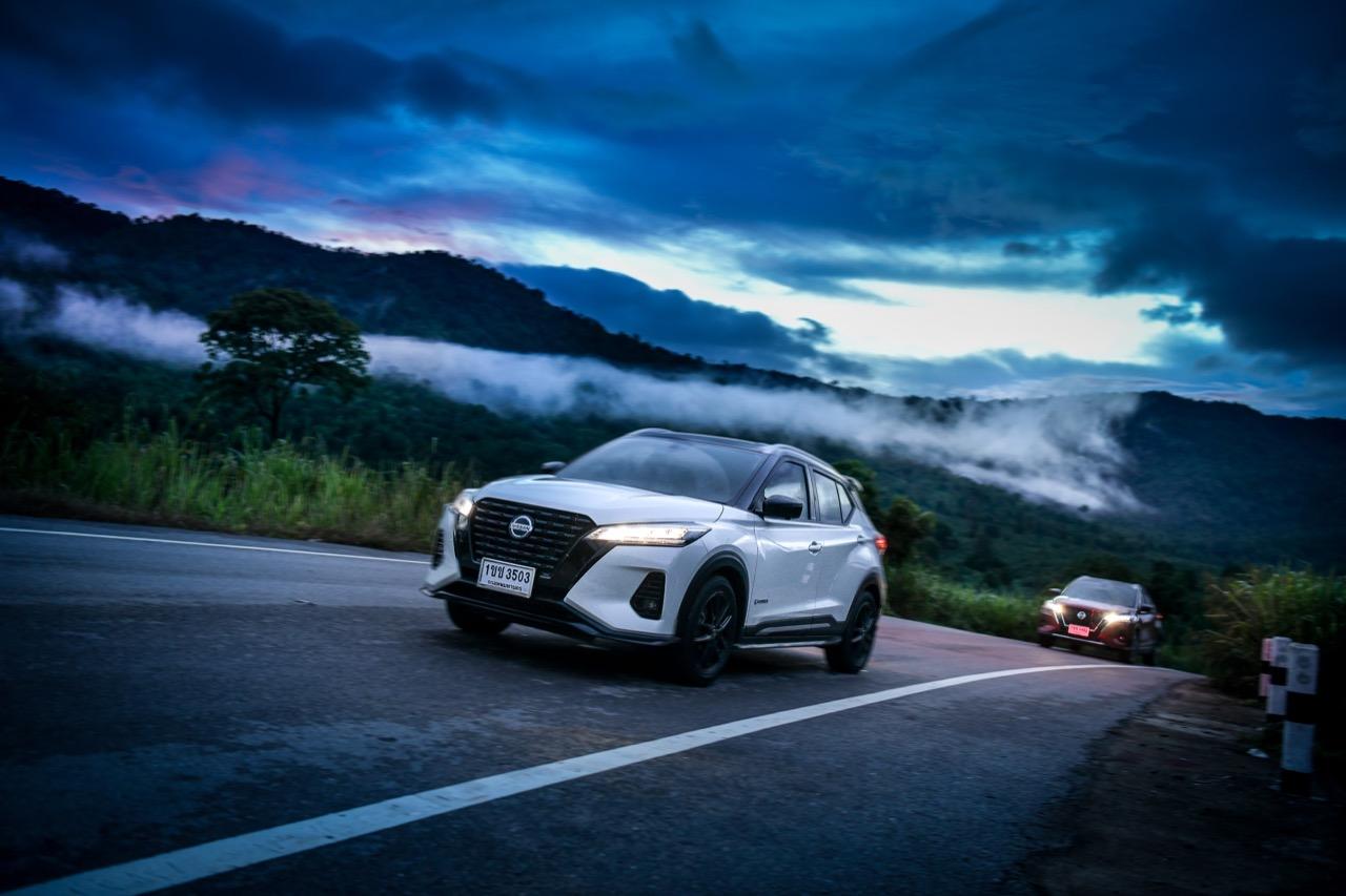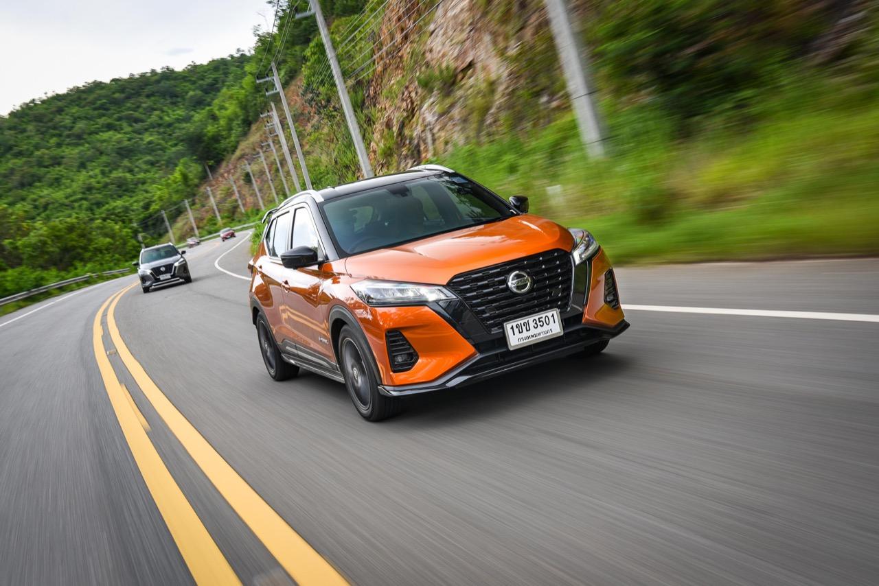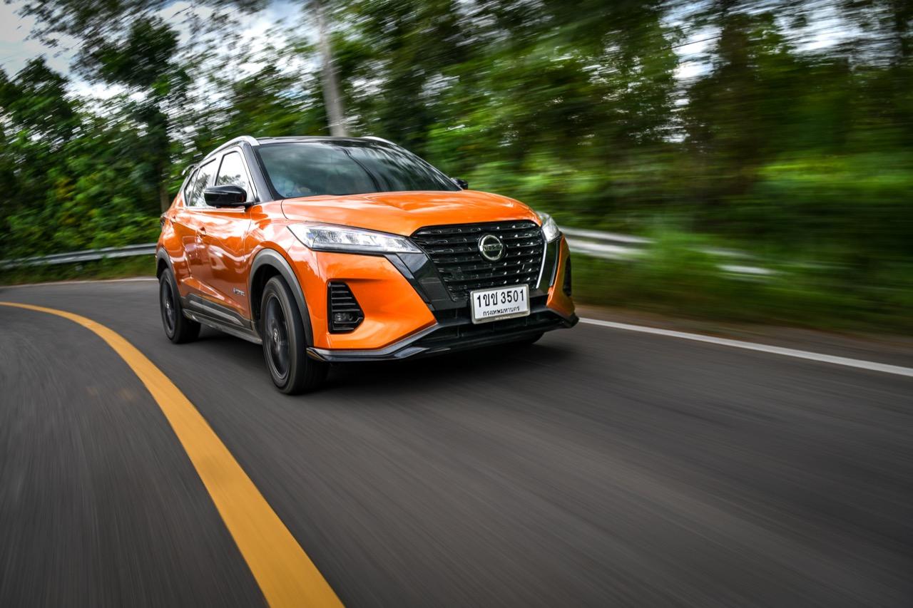 การเซตให้ช่วงล่างทำงานร่วมกับชุดบังคับเลี้ยวได้อย่างกลมกลืน ทำให้ Kicks เป็นรถกึ่งไฟฟ้าที่ควบคุมได้ง่าย ความง่ายของมันทำให้เกิดความสบายในการขับทั้งในและนอกเมือง แม้จะปล่อยมลพิษออกมาบ้าง แต่ไม่มากเท่ากับรถยนต์คู่แข่งที่ใช้เครื่องสันดาปภายในขนาดใหญ่กว่า โดยไม่มีทั้งแบตฯ และมอเตอร์ (ยกเว้น Toyota C-HR Hybrid) Kicks เป็นรถขับเคลื่อนล้อหน้าที่เซตช่วงล่างมาดี เส้นทางในอำเภอสวนผึ้งของจังหวัดราชบุรี เต็มไปด้วยทางโค้งขึ้น-ลงเนินเขาที่เหมาะกับการทดสอบการทรงตัว การถ่ายเทน้ำหนักขณะเข้าโค้งหรือเบรก พวงมาลัยไฟฟ้าอัตราทดแปรผันตามความเร็วมีความเที่ยงตรงแม่นยำใช้ได้ การถ่ายเทน้ำหนัก ทั้งเลี้ยว เร่งและเบรกเร็วๆ อยู่ในเกณฑ์ดี รวมไปถึงการทรงตัวในย่านความเร็วสูงก็ยังทำออกมาได้ดี ไม่ว่าคุณจะขับมันแบบไหน Kicks ก็ให้ความสนุกกับคุณทุกครั้งเมื่ออยู่หลังพวงมาลัย