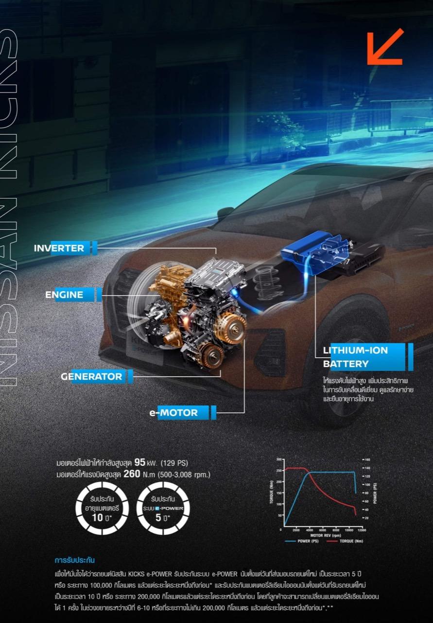 ขั้นตอนการทำงานของระบบขับเคลื่อน e-Power เมื่อกดปุ่มสตาร์ตเครื่องยนต์ หากมีไฟในแบตเตอรี่มากพอที่จะใช้ขับเคลื่อนสั้นๆ ในย่านความเร็วต่ำ เครื่องยนต์ของมันก็จะยังไม่ทำงาน เมื่อไฟในแบตฯ เหลือน้อยลง เครื่องยนต์ตัวเล็กแค่ 3 สูบ จะเริ่มต้นรับหน้าที่ปั่นไฟโดยมีตัวแปลงกระแสไฟฟ้าหรือ Inverter ทำการแปลงกระแสไฟฟ้าป้อนให้กับมอเตอร์ไฟฟ้าในระบบขับเคลื่อน แนวคิดดังกล่าวถูกนำไปใช้ใน Nissan Note และรถ Mini MPV อย่าง Nissan Serena โดย Kicks ถือว่าเป็นรถยนต์รุ่นล่าสุดที่ใช้ระบบขับเคลื่อนที่พัฒนามานานกว่า 6 ปีแล้ว เครื่องยนต์เบนซินแถวเรียง 3 สูบของมันมีความจุแค่ 1,198 ซีซี. ปั่นไฟผ่าน Inverter ป้อนให้กับมอเตอร์ไฟฟ้า EM57 ระบบ e-Power ของ Nissan Kicks มีเรี่ยวแรงประมาณ 95 กิโลวัตต์ หรือ 129 แรงม้า เป็นแรงจากมอเตอร์ไฟฟ้าล้วนๆ โดยที่เครื่องยนต์ไม่ได้มาเกี่ยวข้องกับการปั่นให้ล้อหมุนแต่อย่างใดทั้งสิ้น สำหรับแรงบิดสูงสุดอยู่ที่ 260 นิวตันเมตร เมื่อเทียบกับแรงบิดของเครื่องยนต์จะคล้ายกับแรงบิดจากเครื่องดีเซลตัวเล็ก Mazda Skyactiv-D 1.5 ลิตร ซึ่งมีแรงบิดประมาณ 250 นิวตันเมตร แรงบิดจากมอเตอร์ของ Kicks แรงกว่า 10 นิวตันเมตร ถือว่ามีกำลังแรงฉุดลากอยู่ในเกณฑ์ดีเลยทีเดียว อัตราเร่ง 0-100 กิโลเมตรต่อชั่วโมง ใน 9.8 วินาที กระฉับกระเฉงเอาเรื่องเหมือนกัน