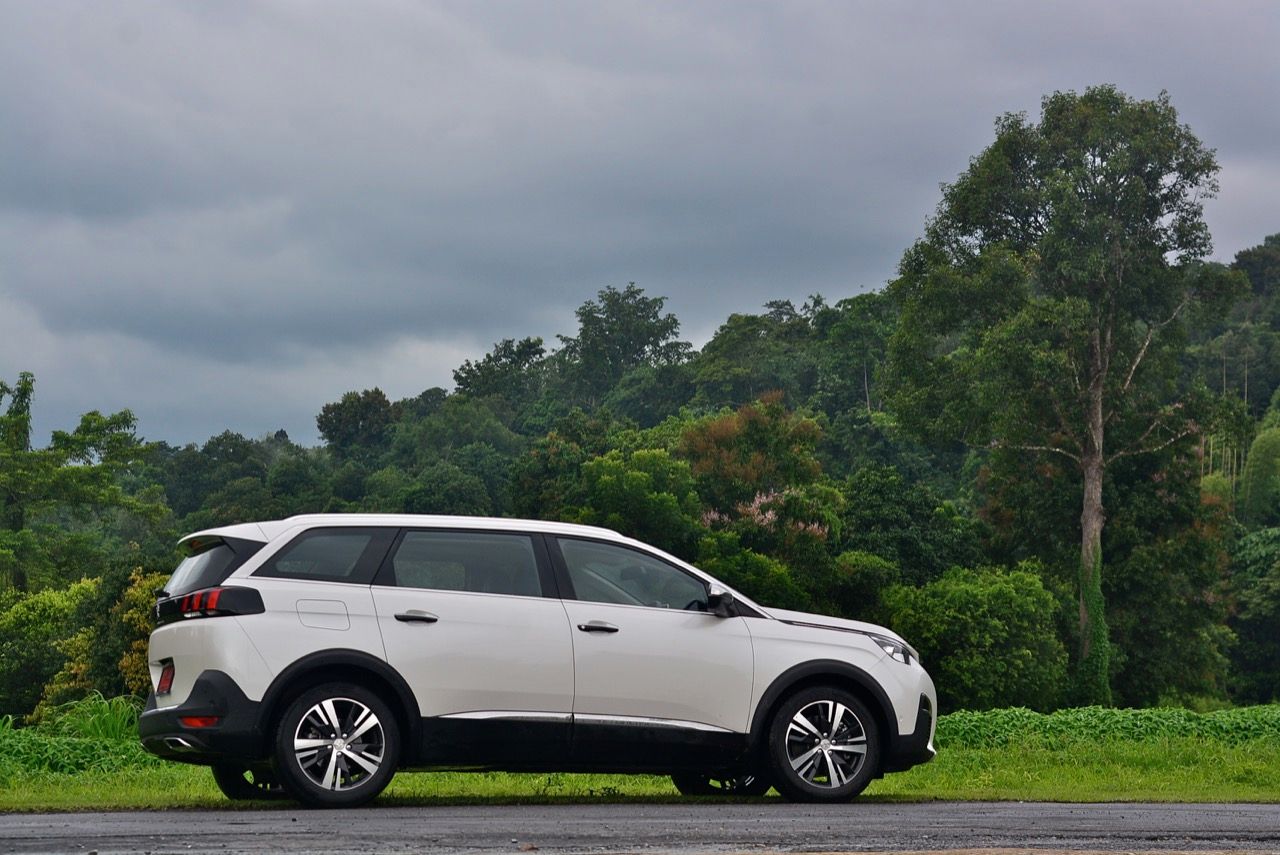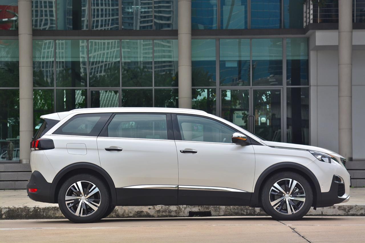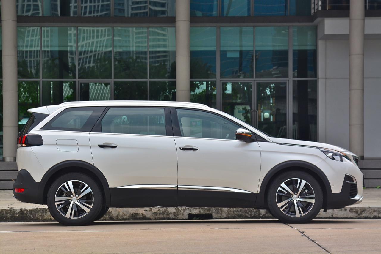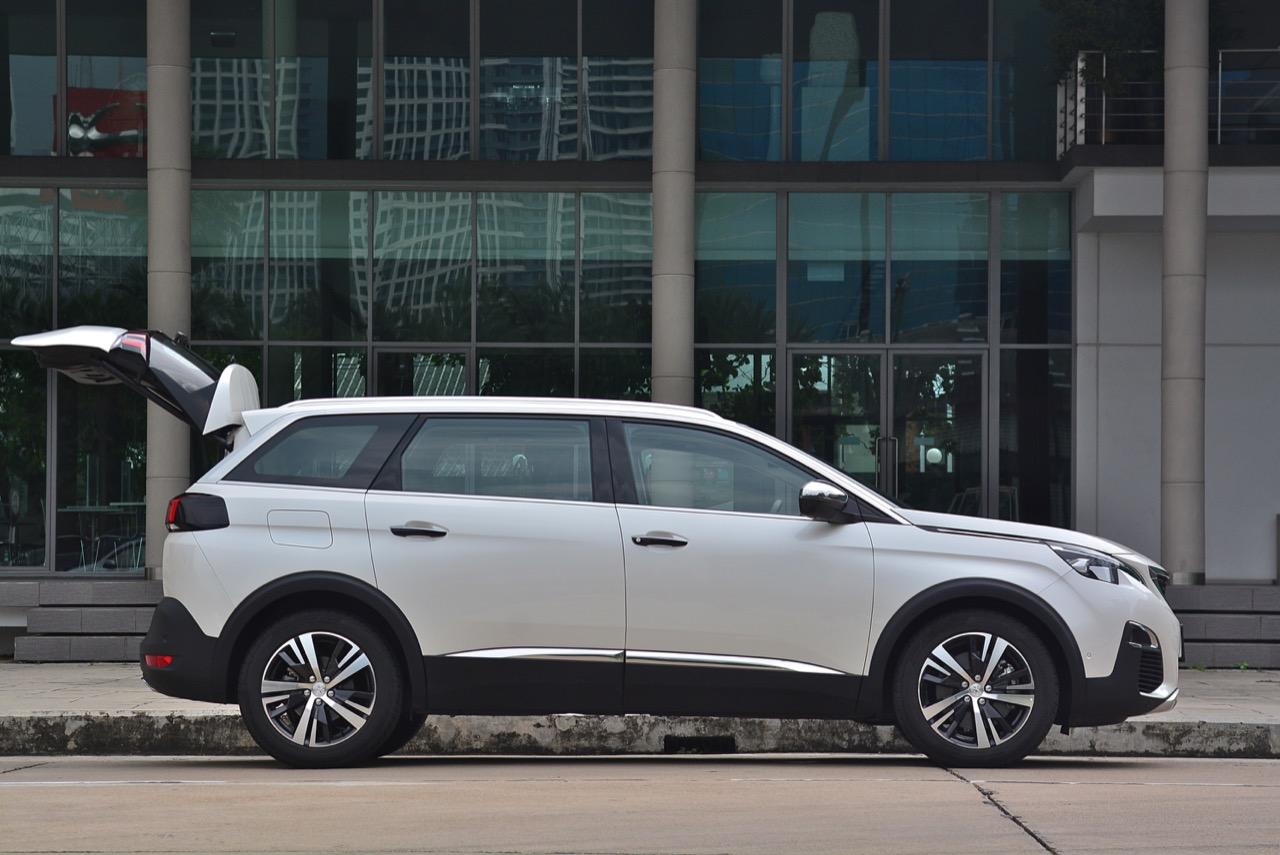 ทรงด้านข้างแสดงออกถึงความเป็นรถ MPV อย่างชัดเจน แต่ความสูงที่เพิ่มมากขึ้นทำให้ Peugeot เรียกรถรุ่นนี้ว่า SUV จุดที่ลงตัวบริเวนด้านข้างตัวรถก็คือ แก้มข้างที่ใช้เส้นโครเมียมลากจนถึงมุมของเสาหน้า กรอบกระจกมองข้างแบบโครเมียมที่คล้ายรถกระบะบางรุ่นในไทย ชายล่างของบานประตูทั้งสองติดตั้งชิ้นงานพลาสติกโครเมียมสีเงิน ซุ้มล้อพลาสติกสีดำลามไปจนถึงขอบของกันชนหลัง กรอบกระจกบานหน้าต่างสีดำที่ตัดกับตัวถังสีขาวมุก Pearl White แรคหลังคาสีเงิน องศาความลาดเอียงของเสาหน้าที่สมบูรณ์แบบเชื่อมโยงแนวหลังคาทั้งผืนที่มีกระจกซันรูฟมาให้ใช้งาน เสาท้ายสไตล์รถแวกอน พร้อมฝาท้ายไฟฟ้า ล้ออัลลอยขอบ 18 นิ้ว ห่อรัดด้วยยาง Continental Conti Cross Contact ไซส์ 255/55R18 V บั้นท้ายทรงเหลี่ยม ดีไซน์ไฟท้ายแปลกตาแบบ LED สามช่อง พร้อมพลาสติกสีดำเงา ตกแต่งคาดกลางเชื่อมโยงไฟท้ายทั้งสองข้าง ฝาท้ายไฟฟ้า เปิดออกได้ด้วยมุมที่กว้างมากกว่าปกติเพื่อการขนสัมภาระ กระจกหลังบานฝาท้ายมีขนาดค่อนข้างเล็ก มีที่ปัดน้ำฝนมาให้ใช้งาน พร้อมกับไฟเบรกดวงที่สามแบบ LED กันชนหลังพลาสติกสีดำด้าน มีชิ้นงานกันกระแทกแปะอยู่บริเวณขอบของกันชนหลัง ท่อระบายไอเสียแบบเหลี่ยม กับแผงพลาสติกมัลติรีเฟลกเตอร์สีแดง