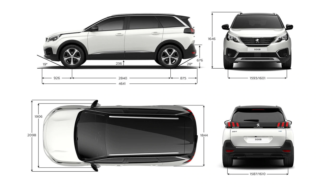 มิติตัวถังของ Peugeot 5008 1.6 Turbo Allure มีขนาดความยาว 4,641 มิลลิเมตร กว้าง 1,844 มิลลิเมตร สูง 1,646 มิลลิเมตร ความยาวฐานล้อ 2,840 มิลลิเมตร ระยะห่างล้อหน้า 1,601 มิลลิเมตร ระยะห่างล้อหลัง 1,610 มิลลิเมตร ระยะห่างจากพื้นถึงใต้ท้อง 191 มิลลิเมตร น้ำหนักรถ 1,473 กิโลกรัม ความจุถังเชื้อเพลิง 56 ลิตร พื้นที่เก็บสัมภาระท้าย เมื่อยังไม่ได้พับเบาะแถวที่ 2-3 มีความจุ 166 ลิตร และเมื่อพับเบาะแถวที่ 2-3 พื้นที่เก็บสัมภาระจะเพิ่มขึ้นเป็น 2,150 ลิตร