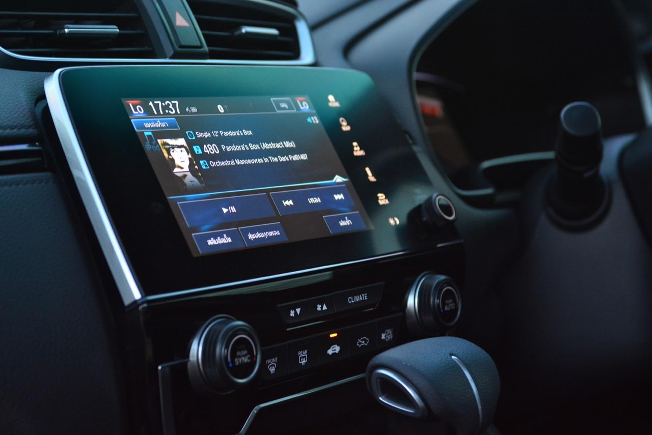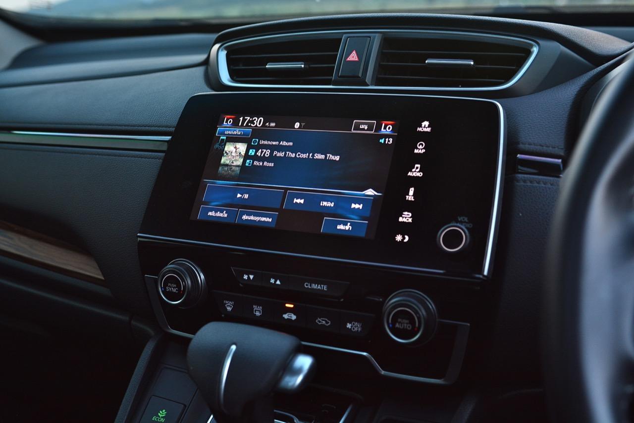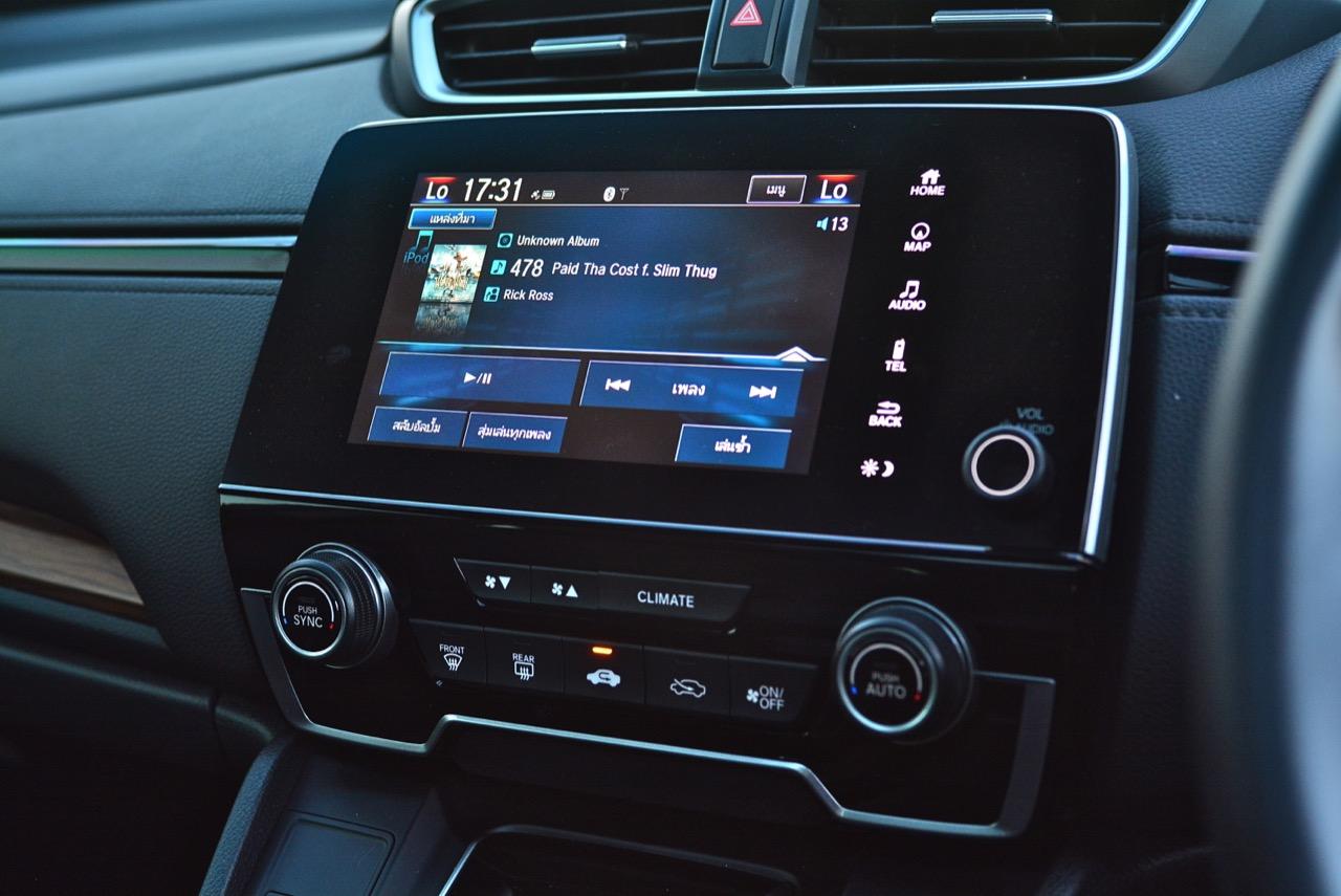 จอแสดงผลกลางขนาด 7 นิ้ว สั่งงานด้วยระบบสัมผัสลงไปที่หน้าจอมีเนวิเกเตอร์ติดมาให้ใช้บอกเส้นทาง และเป็นมอนิเตอร์ของกล้องมองหลัง ระบบเครื่องเสียงหน้าจอสัมผัสรองรับการเชื่อมต่อสารพัดสารพัน เช่น Apple Car Play แต่รองรับเฉพาะสมาร์ทโฟนบางรุ่นเท่านั้น ระบบเชื่อมต่อโทรศัพท์ไร้สายแบบบลูทูธ ลำโพงของระบบเครื่องเสียงจำนวน 8 ตัว ให้เสียงที่แค่พอใช้งานได้ ไม่ได้เจ็บเหมือน SUV ตัวเต็มจากยุโรปที่มีราคา 3-4 ล้านบาท ด้านหน้าในห้องโดยสารติดลำโพงมาให้ 4 ตัว โดยลำโพง 2 ตัวจะอยู่ที่เสาหน้า (ทวิตเตอร์) อีก 2 ตัวติดตั้งที่ประตูหลัง ทวิตเตอร์อีก 2 ตัว อยู่ที่ประตูหลังเช่นเดียวกัน การใช้งานหน้าจอมอนิเตอร์แบบสัมผัสก็ไม่มีอะไรยุ่งยาก เนื่องจาก Honda ยัดโปรแกรมภาษาไทยมาให้ใช้งานเหมือนเดิม