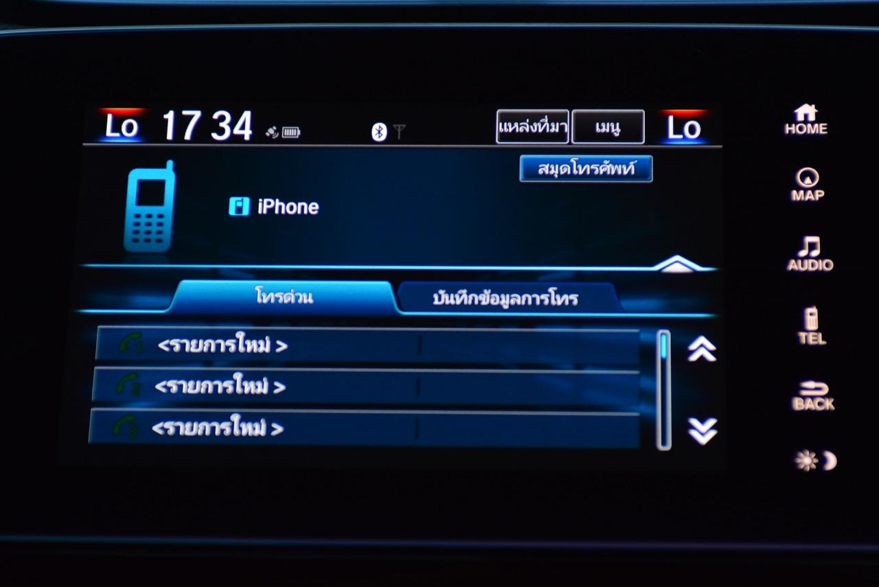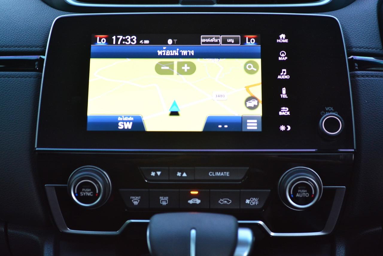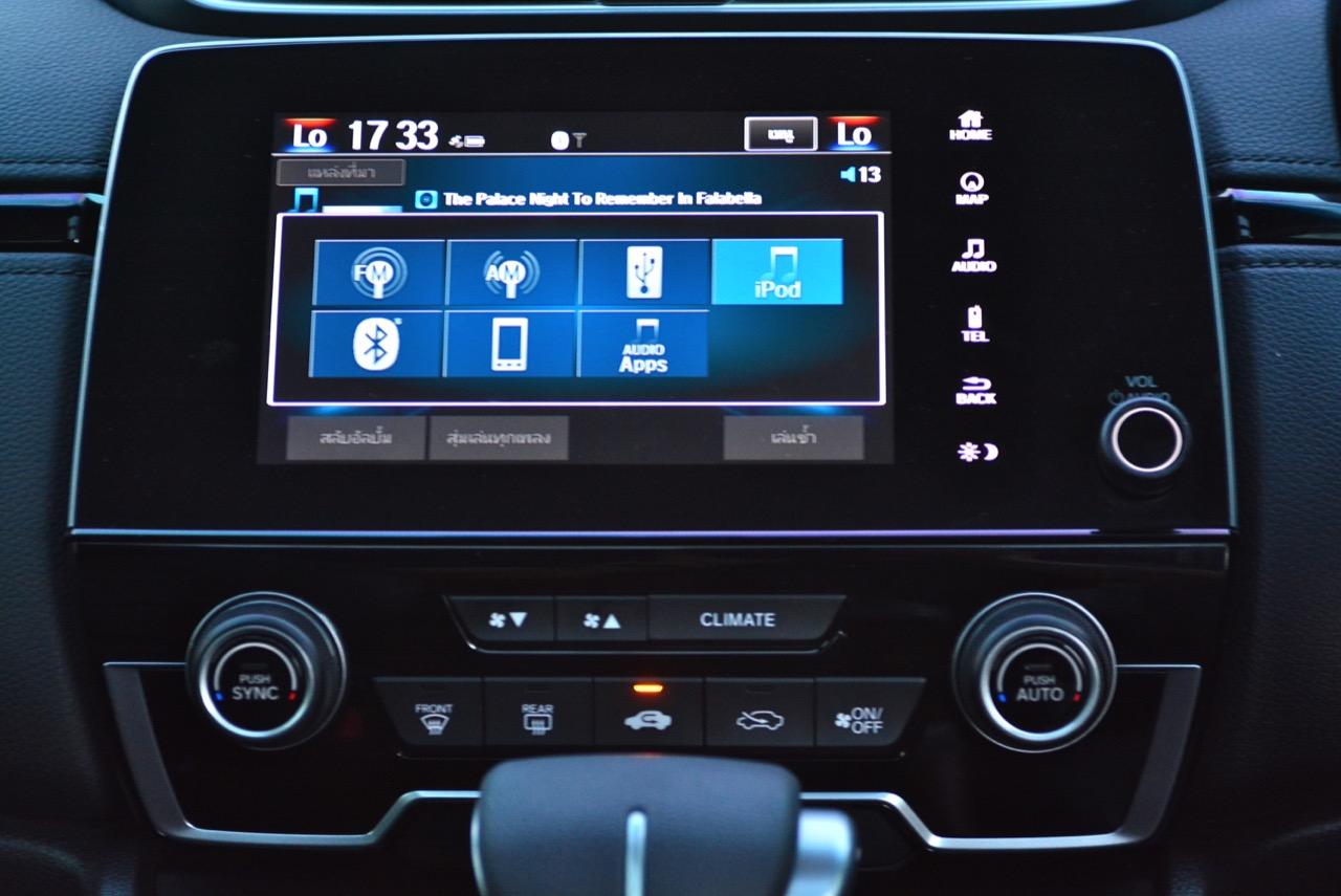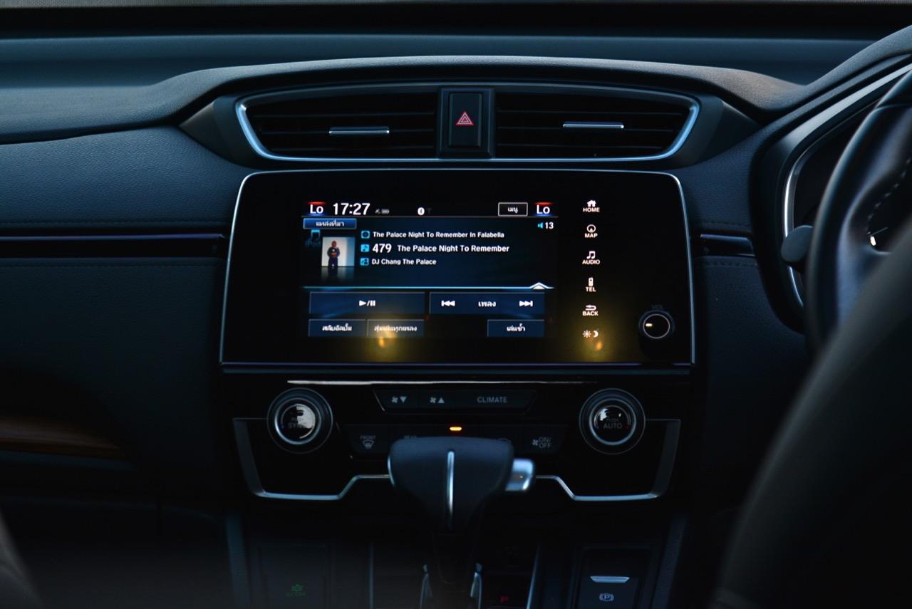 จอแสดงผลกลางขนาด 7 นิ้ว สั่งงานด้วยระบบสัมผัสลงไปที่หน้าจอมีเนวิเกเตอร์ติดมาให้ใช้บอกเส้นทาง และเป็นมอนิเตอร์ของกล้องมองหลัง ระบบเครื่องเสียงหน้าจอสัมผัสรองรับการเชื่อมต่อสารพัดสารพัน เช่น Apple Car Play แต่รองรับเฉพาะสมาร์ทโฟนบางรุ่นเท่านั้น ระบบเชื่อมต่อโทรศัพท์ไร้สายแบบบลูทูธ ลำโพงของระบบเครื่องเสียงจำนวน 8 ตัว ให้เสียงที่แค่พอใช้งานได้ ไม่ได้เจ็บเหมือน SUV ตัวเต็มจากยุโรปที่มีราคา 3-4 ล้านบาท ด้านหน้าในห้องโดยสารติดลำโพงมาให้ 4 ตัว โดยลำโพง 2 ตัวจะอยู่ที่เสาหน้า (ทวิตเตอร์) อีก 2 ตัวติดตั้งที่ประตูหลัง ทวิตเตอร์อีก 2 ตัว อยู่ที่ประตูหลังเช่นเดียวกัน การใช้งานหน้าจอมอนิเตอร์แบบสัมผัสก็ไม่มีอะไรยุ่งยาก เนื่องจาก Honda ยัดโปรแกรมภาษาไทยมาให้ใช้งานเหมือนเดิม