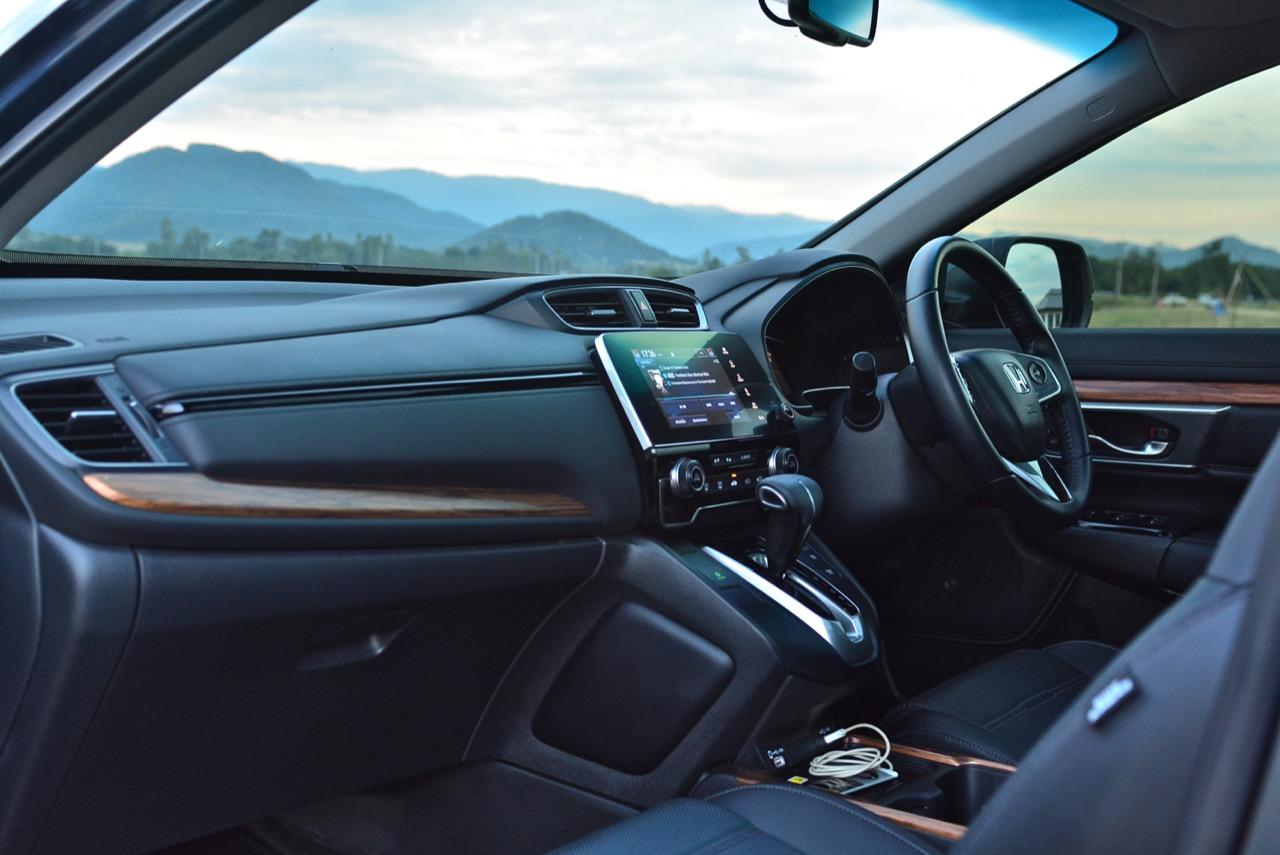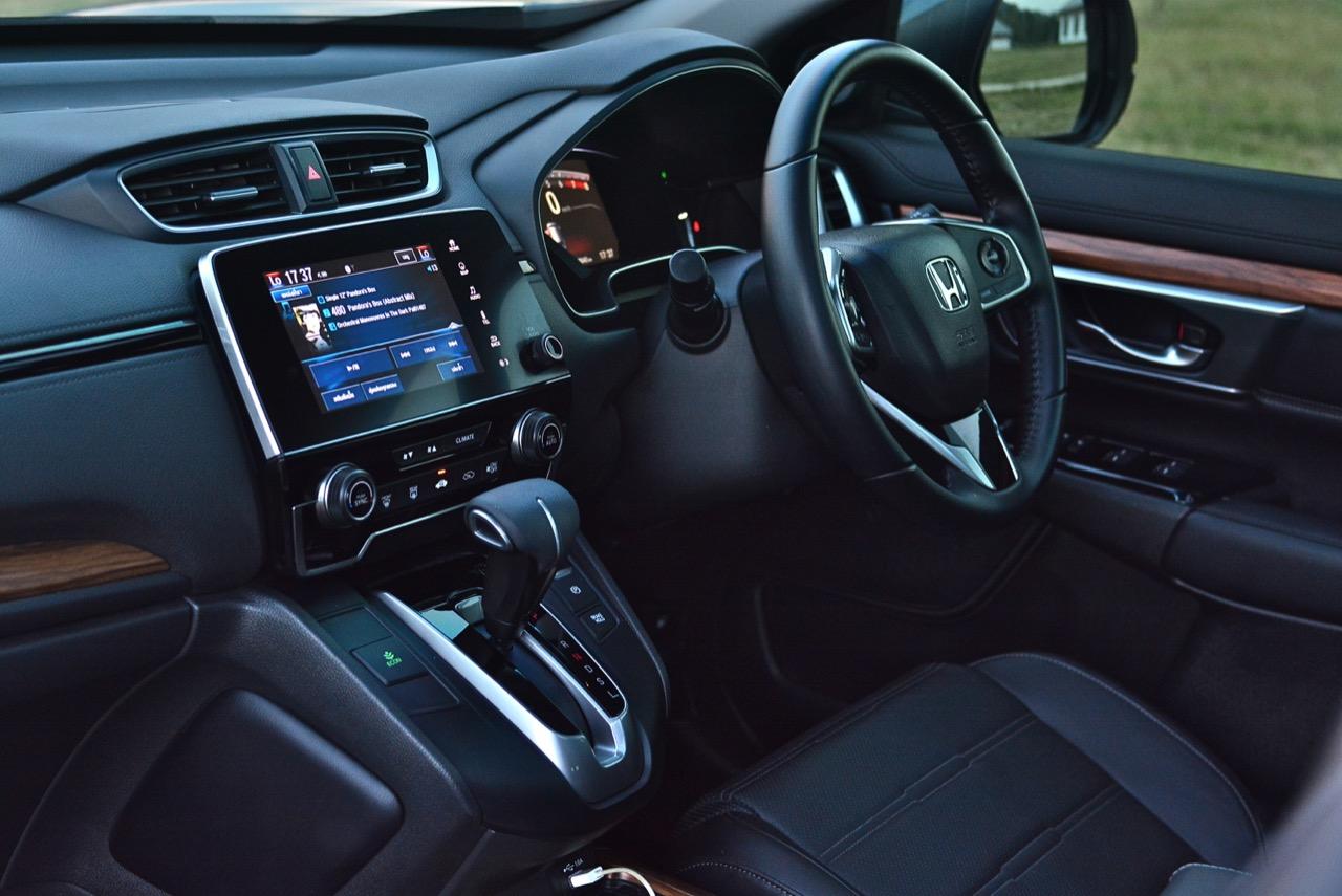 ห้องโดยสารให้อารมณ์รถผู้ใหญ่ที่แตกต่างไปจาก Civic คอนโซลแดชบอร์ด ขึ้นรูปด้วยพลาสติก หุ้มด้วยหนังสังเคราะห์ในบางจุดที่ต้องการซับเสียงและให้สัมผัสที่นุ่มนวล งานออกแบบภายในสไตล์ยุโรป ของ CR-V ทำให้ห้องโดยสารของมันหรูหราน่าใช้งานมากกว่ารูปแบบเดิมๆ ในรุ่นที่แล้ว ชิ้นส่วนพวกอุปกรณ์ต่างๆ รวมถึงงานตกแต่ง ถูกปรับใหม่ทั้งหมด แม้แต่วัสดุพวกพลาสติกก็มีเกรดที่ดีขึ้น ลายไม้ที่กรุอยู่กลางแผงแดชบอร์ดกับแผงประตู ช่วยทำให้ห้องโดยสารของ CR-V มีความเป็นรถผู้ใหญ่มากยิ่งขึ้น พร้อมความหรูหราที่มากกว่าเดิม ช่องแอร์ทรงเหลี่ยมใช้งานได้ดีแถมยังดูหรูด้วยการกรุขอบช่องแอร์ด้วยชิ้นงานโครเมียม เติมรายละเอียดกันอย่างลึกซึ้ง วัสดุพวก Piano Black ประดับประดาอยู่ทั่วไปหมด ทำให้เวลาใช้งานต้องคอยเช็ดถูทำความสะอาด เนื่องจากฝุ่นจับและเป็นรอยง่าย