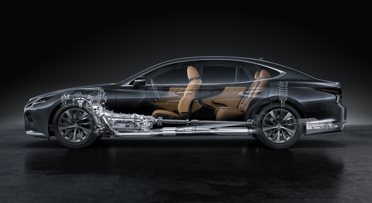 ช่วงล่างและชุดบังคับเลี้ยวของ LS500h ผมสารภาพตามตรงว่าต้องกางสเปกเขียน เนื่องจากมีรายละเอียดยิบย่อยที่ต้องเอามาเขียนเชื่อมโยงกับการอวยในครั้งนี้! LS ใช้พวงมาลัยไฟฟ้าอัตราทดแปรผันไปตามความเร็วและโหมดของการขับเคลื่อน Electronic Power Steering (EPS) รัศมีวงเลี้ยวแคบสุด 5.9 เมตร ระบบรองรับที่มาของความนุ่มนวลสบายตัวใช้ช่วงล่างด้านหน้าแบบปีกนกคู่ดับเบิ้ลวิชโบนพวกแขนยึดโยงทำจากอะลูมิเนียมทั้งหมด โช้คอัพด้านหน้าหล่อลื่นด้วยน้ำมันแรงเสียดทานต่ำ ชิ้นส่วนพวกแขนยึดโยงปีกนกทำจากอัลลอย เพื่อลดน้ำหนักใต้สปริง ช่วงล่างด้านหลังเป็นแบบมัลติลิงก์ ระบบ Adaptive Variable Air Suspension สามารถปรับระดับความสูงได้พร้อมกับโช้คแบบถุงลมหรือ Air Suspension ควบคุมด้วยระบบอิเล็กทรอนิกส์ ช่วงล่าง Adaptive Variable Suspension หรือ AVS มีกลไฟไฟฟ้า VDIM ผสมผสานการควบคุมทั้งหมด เช่น เครื่องยนต์ เบรก พวงมาลัย พร้อมฟังก์ชันอื่นๆ เช่นระบบควบคุมมุมของการเลี้ยวที่ล้อหน้าและหลัง ESP และ LDH เพิ่มความปลอดภัยแบบ Active ระบบ LDH จะปรับองศาของล้อทั้งสี่ โดยประเมินผลจากความเร็วในขณะนั้นและองศาของพวงมาลัยไฟฟ้า ระบบเบรกติดตั้งคาร์ลิปเปอร์เบรกหน้าแบบ 4 พอต จานเบรกหน้าพร้อมช่องระบายความร้อนเส้นผ่าศูนย์กลาง 357 มิลลิเมตร เบรกหลังซิงเกิ้ลพอต พร้อมจานเบรกหลังเส้นผ่าศูนย์กลาง 335 มิลลิเมตร LS500h ติดตั้งตัวช่วยเบรก เช่น Four-wheel power-assisted disc brakes with Electronic Controlled Braking (ECB); four-sensor, four-channel Anti-lock Braking System (ABS); Electronic Brakeforce Distribution (EBD) and Brake Assist