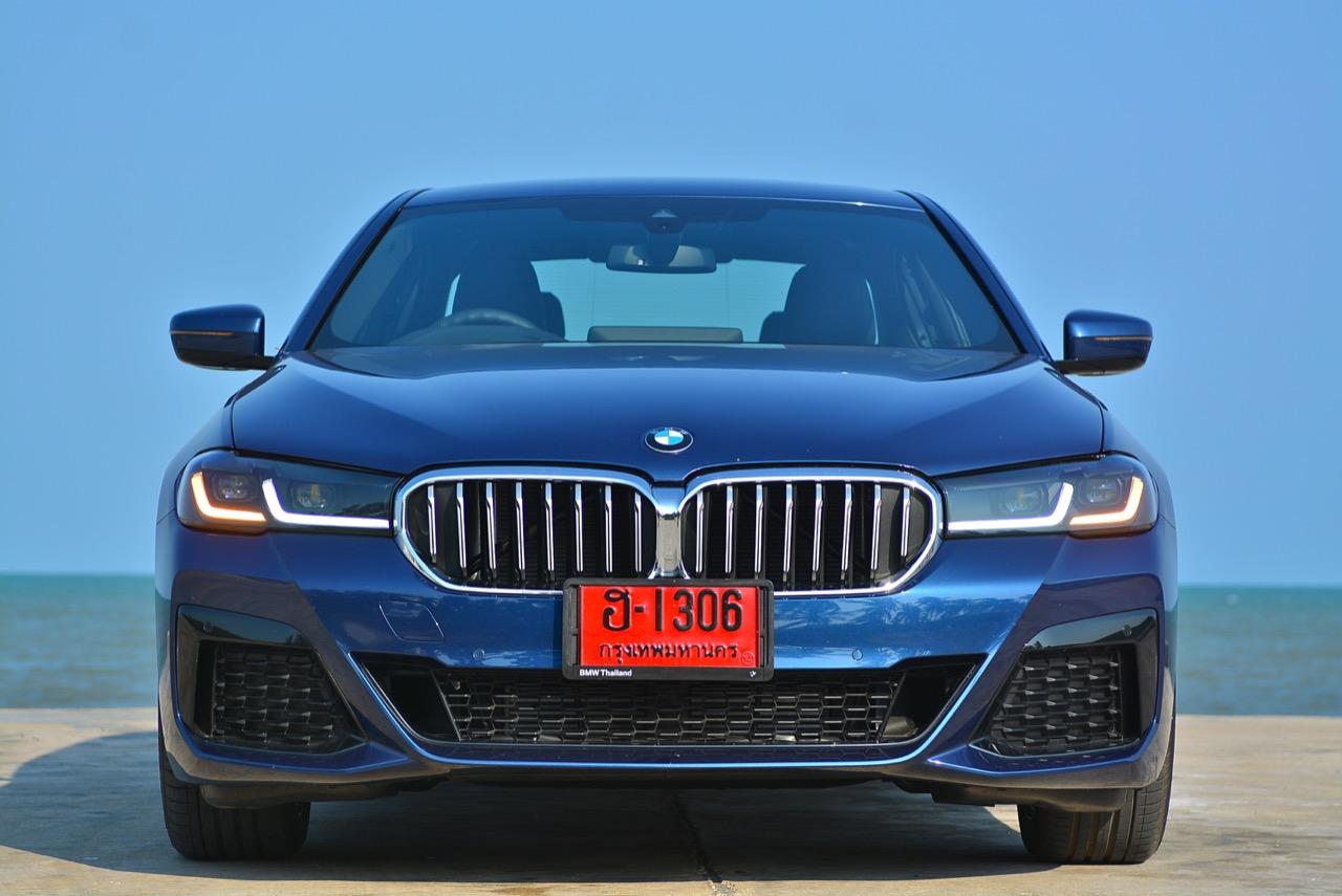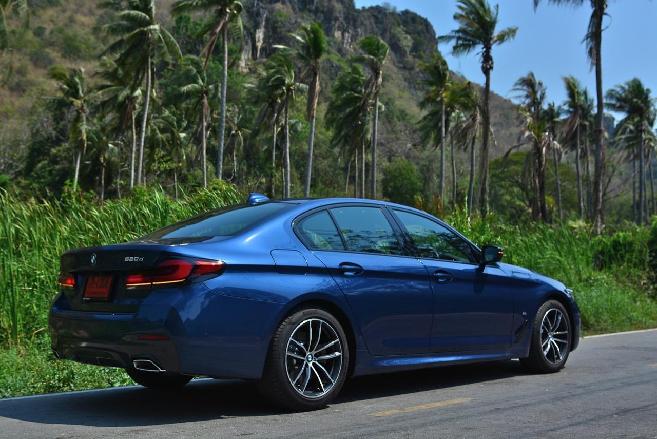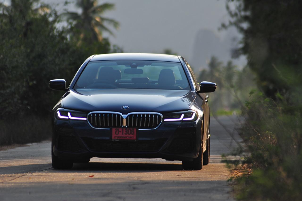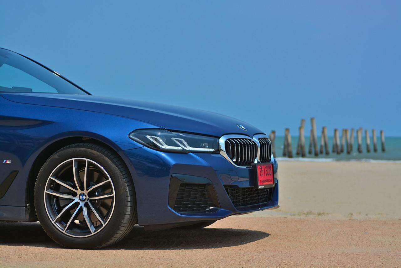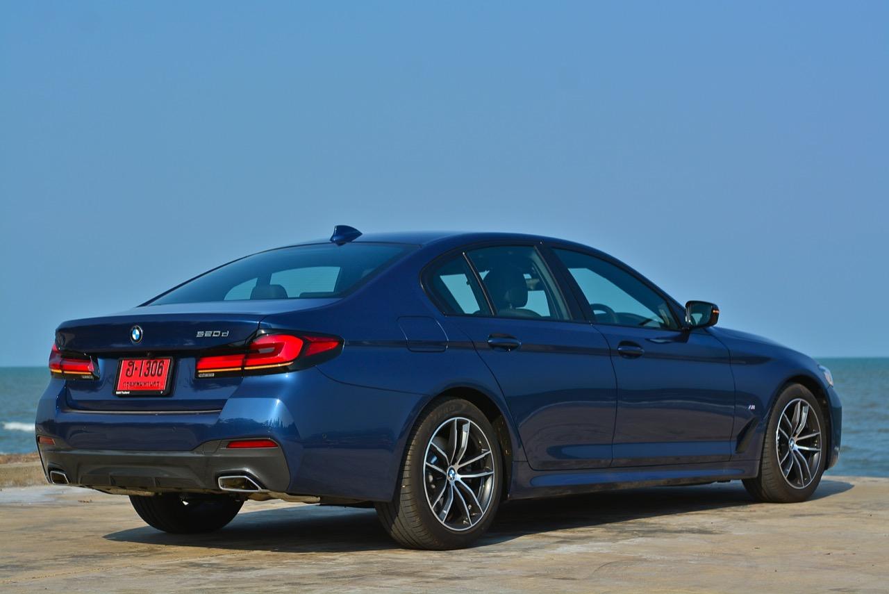 รุ่นเก่าผ่านไป ถึงเวลาของรถรุ่นปรับโฉมใหม่ หรือ LCI อย่าง Series-5 G30 เวอร์ชันไมเนอร์เชนจ์ ประจำปี 2021 รถทดสอบในอาทิตย์นี้คือซาลูนหรู 4 ประตู รุ่น New Series-5 520d M Sport ประกอบในประเทศ ราคาเปิดออกมาที่ 3,539,000 บาท สูสีกับคู่แข่งอย่าง Mercedes-Benz E220d AMG Dynamic เมื่อลองส่องดูทั่วทั้งคันก็จะพบว่าหน้าตาของ BMW 5-Series รุ่นปรับโฉมมีความสวยงามลงตัว รูปลักษณ์แตกต่างจากรุ่นที่แล้วไม่มากนัก งานออกแบบด้านหน้าใหม่เข้ามาเพิ่มเติมความเข้มข้นของ New Series-5 ให้เฉียบคมและดูดีขึ้นมาอีกนิด การปรับให้น้ำหนักส่วนเกินถูกตัดออกไป เกิดขึ้นจากแนวคิด BMW Efficient Lightweight เน้นการใช้วัสดุน้ำหนักเบาอย่างอลูมิเนียมและเหล็กกล้าที่มีความทนทานสูงแต่น้ำหนักเบามาใช้เป็นเปลือกตัวถังและแชสซี New Series-5 รุ่น 520d จึงมีน้ำหนักเบากว่ารุ่นก่อน (520d F10) 115 กิโลกรัม ตัวถังถูกออกแบบให้มีจุดศูนย์ถ่วงที่ต่ำ กระจายน้ำหนักอย่างสมดุล 50/50 และมีแรงเสียดทานอากาศต่ำที่สุดในรถระดับเดียวกัน การลงมือจูนช่วงล่างเพิ่มเติมในโฉม LCI ส่งผลให้การขับขี่มีความคล่องตัว เข้ากับความหนึบนุ่มของระบบรองรับที่เซตมาให้ในรูปแบบที่มีกลิ่นของสปอร์ตซาลูนมากกว่ารุ่น Luxury ตัวก่อนปรับโฉม ทีมวิศวกรของ BMW ทำงานอย่างหนักเพื่อลดค่าสัมประสิทธิ์แรงต้านอากาศลง 10% เมื่อเทียบกับรุ่นก่อนหน้า โดยมีค่าสัมประสิทธิ์แรงต้านอากาศอยู่ที่ 0.26 เป็นมาตรฐานสำหรับรถยนต์ซาลูนขนาดกลาง ไล่เรียงจากไฟหน้าแบบใหม่ Adaptive LED พร้อมไฟหรี่กลางวัน LED Daytime Running Light และที่เพิ่มเข้ามาก็คือกระจังหน้าใหม่ พร้อมระบบเปิด-ปิดกระจังหน้าอัตโนมัติ เมื่ออุณหภูมิเครื่องยนต์ยังคงเย็นอยู่ แผ่นครีบด้านในของชุดกระจังจะปิด เพื่อทำให้กระแสลมไหลผ่านได้ดีขึ้น และเมื่ออุณหภูมิของเครื่องยนต์สูงขึ้น กระจังจะเปิดออกโดยอัตโนมัติเพื่อนำลมมาช่วยระบายความร้อนให้กับเครื่องยนต์ร่วมกับพัดลมไฟฟ้า กันชนหน้า M Sport มีช่องรับอากาศทั้งส่วนหน้าและที่นำไประบายความร้อนให้กับชุดเบรกหน้า