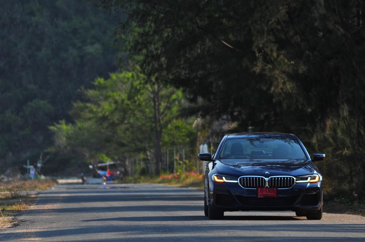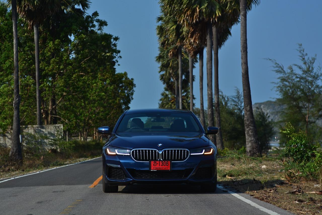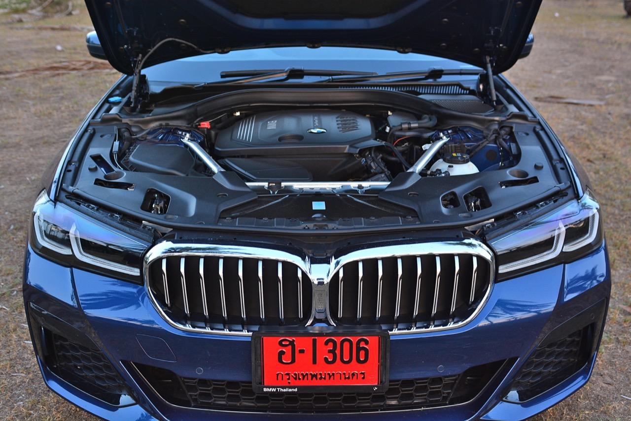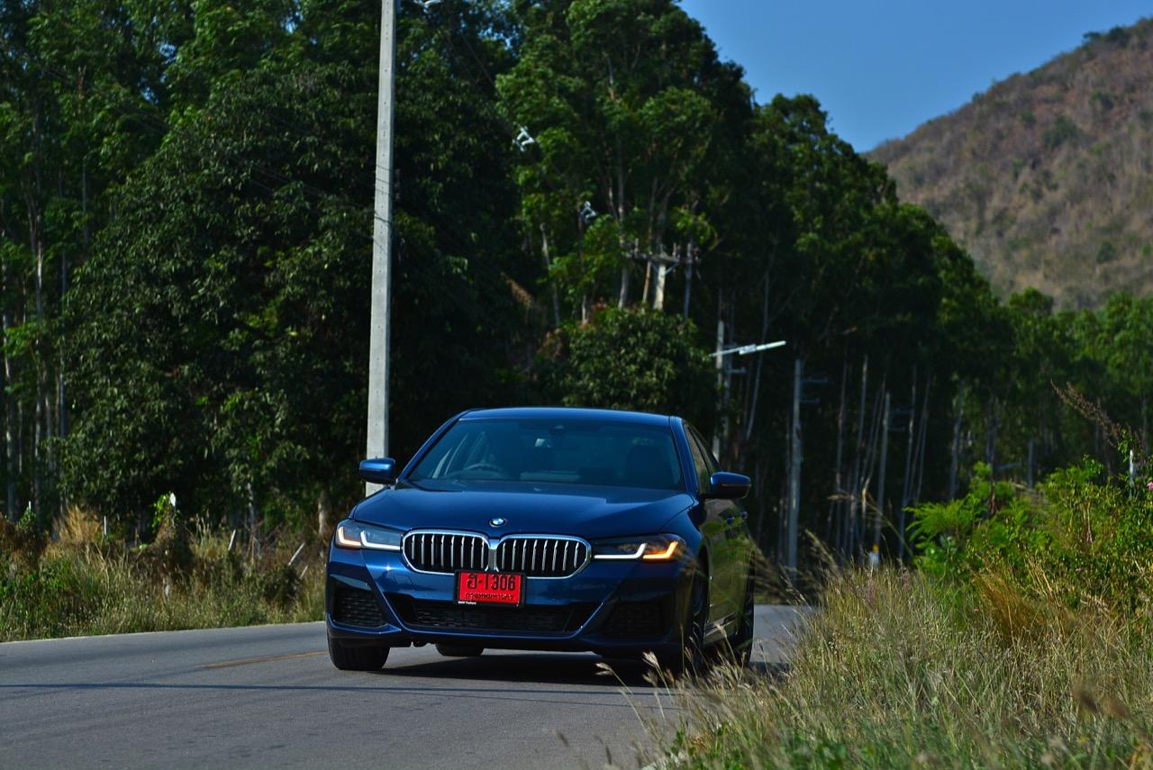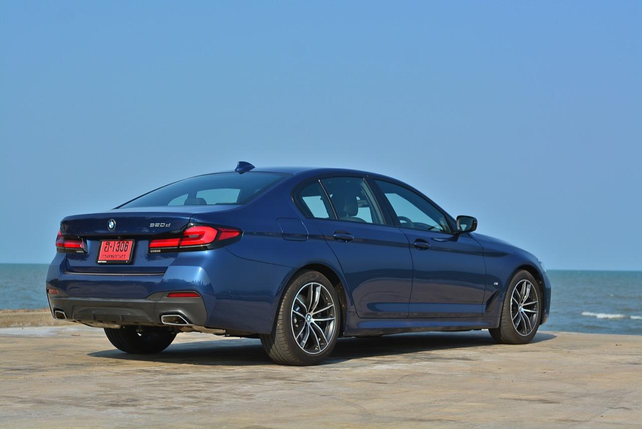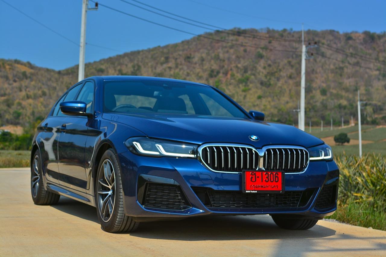 รุ่นเก่าผ่านไป ถึงเวลาของรถรุ่นปรับโฉมใหม่ หรือ LCI อย่าง Series-5 G30 เวอร์ชันไมเนอร์เชนจ์ ประจำปี 2021 รถทดสอบในอาทิตย์นี้คือซาลูนหรู 4 ประตู รุ่น New Series-5 520d M Sport ประกอบในประเทศ ราคาเปิดออกมาที่ 3,539,000 บาท สูสีกับคู่แข่งอย่าง Mercedes-Benz E220d AMG Dynamic เมื่อลองส่องดูทั่วทั้งคันก็จะพบว่าหน้าตาของ BMW 5-Series รุ่นปรับโฉมมีความสวยงามลงตัว รูปลักษณ์แตกต่างจากรุ่นที่แล้วไม่มากนัก งานออกแบบด้านหน้าใหม่เข้ามาเพิ่มเติมความเข้มข้นของ New Series-5 ให้เฉียบคมและดูดีขึ้นมาอีกนิด การปรับให้น้ำหนักส่วนเกินถูกตัดออกไป เกิดขึ้นจากแนวคิด BMW Efficient Lightweight เน้นการใช้วัสดุน้ำหนักเบาอย่างอลูมิเนียมและเหล็กกล้าที่มีความทนทานสูงแต่น้ำหนักเบามาใช้เป็นเปลือกตัวถังและแชสซี New Series-5 รุ่น 520d จึงมีน้ำหนักเบากว่ารุ่นก่อน (520d F10) 115 กิโลกรัม ตัวถังถูกออกแบบให้มีจุดศูนย์ถ่วงที่ต่ำ กระจายน้ำหนักอย่างสมดุล 50/50 และมีแรงเสียดทานอากาศต่ำที่สุดในรถระดับเดียวกัน การลงมือจูนช่วงล่างเพิ่มเติมในโฉม LCI ส่งผลให้การขับขี่มีความคล่องตัว เข้ากับความหนึบนุ่มของระบบรองรับที่เซตมาให้ในรูปแบบที่มีกลิ่นของสปอร์ตซาลูนมากกว่ารุ่น Luxury ตัวก่อนปรับโฉม ทีมวิศวกรของ BMW ทำงานอย่างหนักเพื่อลดค่าสัมประสิทธิ์แรงต้านอากาศลง 10% เมื่อเทียบกับรุ่นก่อนหน้า โดยมีค่าสัมประสิทธิ์แรงต้านอากาศอยู่ที่ 0.26 เป็นมาตรฐานสำหรับรถยนต์ซาลูนขนาดกลาง ไล่เรียงจากไฟหน้าแบบใหม่ Adaptive LED พร้อมไฟหรี่กลางวัน LED Daytime Running Light และที่เพิ่มเข้ามาก็คือกระจังหน้าใหม่ พร้อมระบบเปิด-ปิดกระจังหน้าอัตโนมัติ เมื่ออุณหภูมิเครื่องยนต์ยังคงเย็นอยู่ แผ่นครีบด้านในของชุดกระจังจะปิด เพื่อทำให้กระแสลมไหลผ่านได้ดีขึ้น และเมื่ออุณหภูมิของเครื่องยนต์สูงขึ้น กระจังจะเปิดออกโดยอัตโนมัติเพื่อนำลมมาช่วยระบายความร้อนให้กับเครื่องยนต์ร่วมกับพัดลมไฟฟ้า กันชนหน้า M Sport มีช่องรับอากาศทั้งส่วนหน้าและที่นำไประบายความร้อนให้กับชุดเบรกหน้า