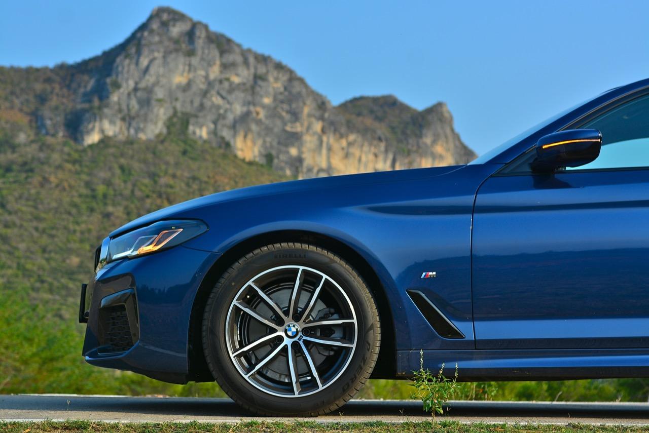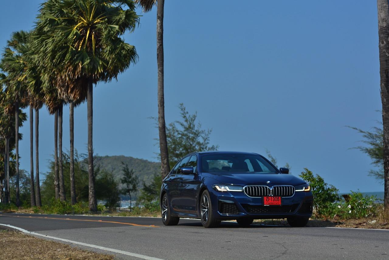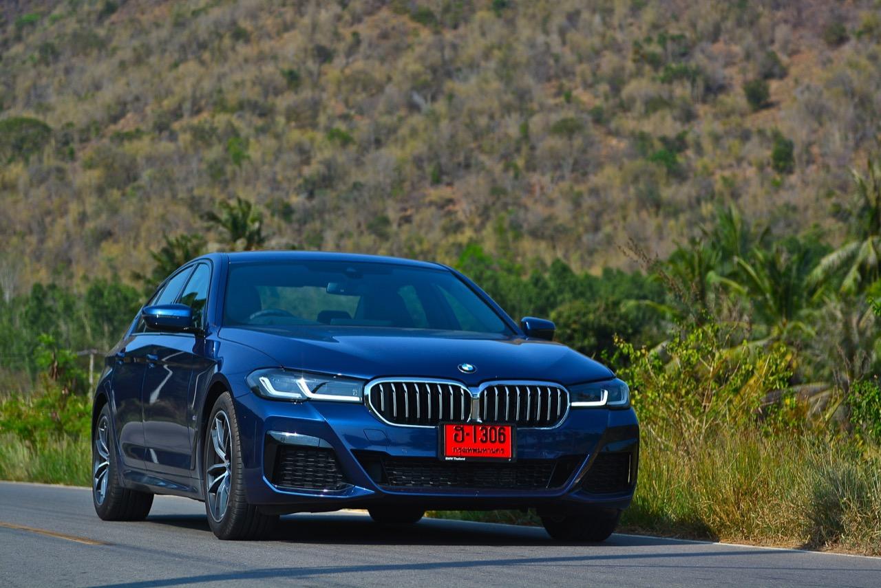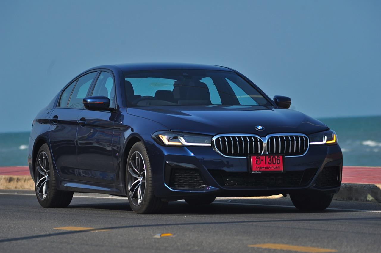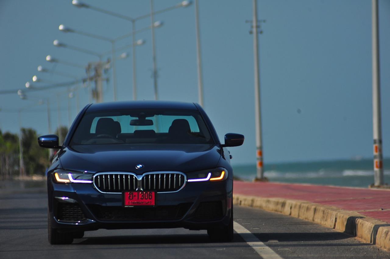 รุ่นเก่าผ่านไป ถึงเวลาของรถรุ่นปรับโฉมใหม่ หรือ LCI อย่าง Series-5 G30 เวอร์ชันไมเนอร์เชนจ์ ประจำปี 2021 รถทดสอบในอาทิตย์นี้คือซาลูนหรู 4 ประตู รุ่น New Series-5 520d M Sport ประกอบในประเทศ ราคาเปิดออกมาที่ 3,539,000 บาท สูสีกับคู่แข่งอย่าง Mercedes-Benz E220d AMG Dynamic เมื่อลองส่องดูทั่วทั้งคันก็จะพบว่าหน้าตาของ BMW 5-Series รุ่นปรับโฉมมีความสวยงามลงตัว รูปลักษณ์แตกต่างจากรุ่นที่แล้วไม่มากนัก งานออกแบบด้านหน้าใหม่เข้ามาเพิ่มเติมความเข้มข้นของ New Series-5 ให้เฉียบคมและดูดีขึ้นมาอีกนิด การปรับให้น้ำหนักส่วนเกินถูกตัดออกไป เกิดขึ้นจากแนวคิด BMW Efficient Lightweight เน้นการใช้วัสดุน้ำหนักเบาอย่างอลูมิเนียมและเหล็กกล้าที่มีความทนทานสูงแต่น้ำหนักเบามาใช้เป็นเปลือกตัวถังและแชสซี New Series-5 รุ่น 520d จึงมีน้ำหนักเบากว่ารุ่นก่อน (520d F10) 115 กิโลกรัม ตัวถังถูกออกแบบให้มีจุดศูนย์ถ่วงที่ต่ำ กระจายน้ำหนักอย่างสมดุล 50/50 และมีแรงเสียดทานอากาศต่ำที่สุดในรถระดับเดียวกัน การลงมือจูนช่วงล่างเพิ่มเติมในโฉม LCI ส่งผลให้การขับขี่มีความคล่องตัว เข้ากับความหนึบนุ่มของระบบรองรับที่เซตมาให้ในรูปแบบที่มีกลิ่นของสปอร์ตซาลูนมากกว่ารุ่น Luxury ตัวก่อนปรับโฉม ทีมวิศวกรของ BMW ทำงานอย่างหนักเพื่อลดค่าสัมประสิทธิ์แรงต้านอากาศลง 10% เมื่อเทียบกับรุ่นก่อนหน้า โดยมีค่าสัมประสิทธิ์แรงต้านอากาศอยู่ที่ 0.26 เป็นมาตรฐานสำหรับรถยนต์ซาลูนขนาดกลาง ไล่เรียงจากไฟหน้าแบบใหม่ Adaptive LED พร้อมไฟหรี่กลางวัน LED Daytime Running Light และที่เพิ่มเข้ามาก็คือกระจังหน้าใหม่ พร้อมระบบเปิด-ปิดกระจังหน้าอัตโนมัติ เมื่ออุณหภูมิเครื่องยนต์ยังคงเย็นอยู่ แผ่นครีบด้านในของชุดกระจังจะปิด เพื่อทำให้กระแสลมไหลผ่านได้ดีขึ้น และเมื่ออุณหภูมิของเครื่องยนต์สูงขึ้น กระจังจะเปิดออกโดยอัตโนมัติเพื่อนำลมมาช่วยระบายความร้อนให้กับเครื่องยนต์ร่วมกับพัดลมไฟฟ้า กันชนหน้า M Sport มีช่องรับอากาศทั้งส่วนหน้าและที่นำไประบายความร้อนให้กับชุดเบรกหน้า