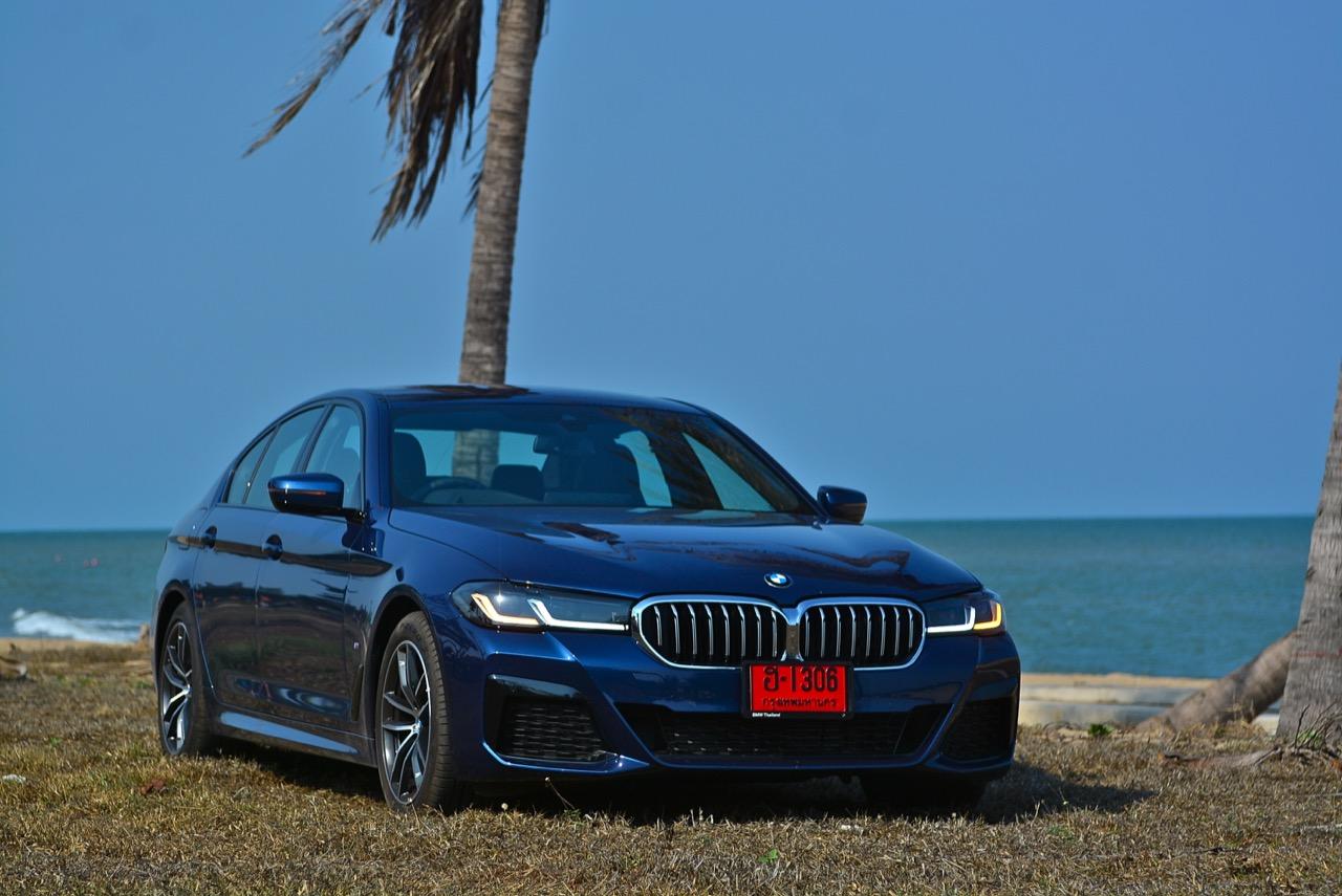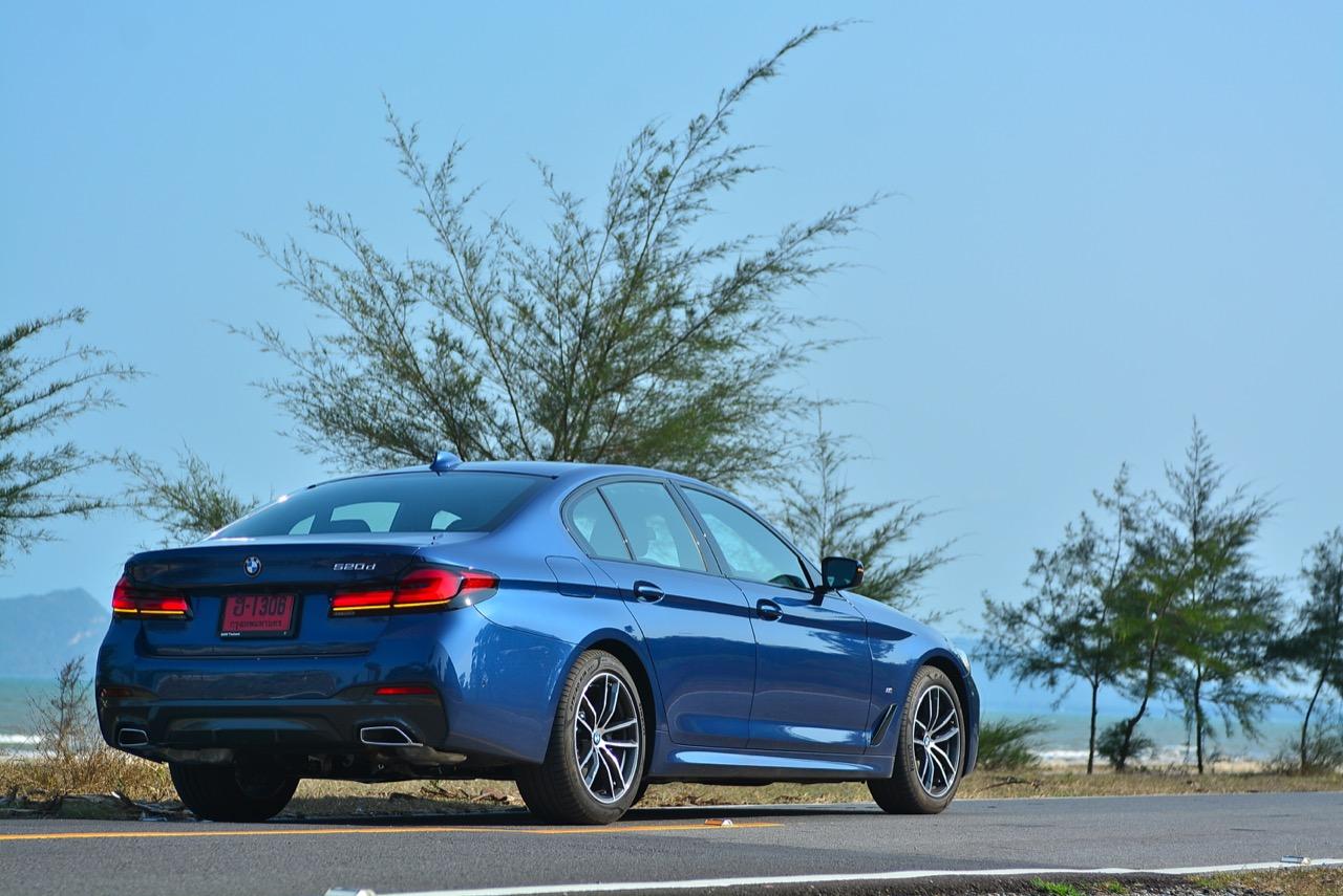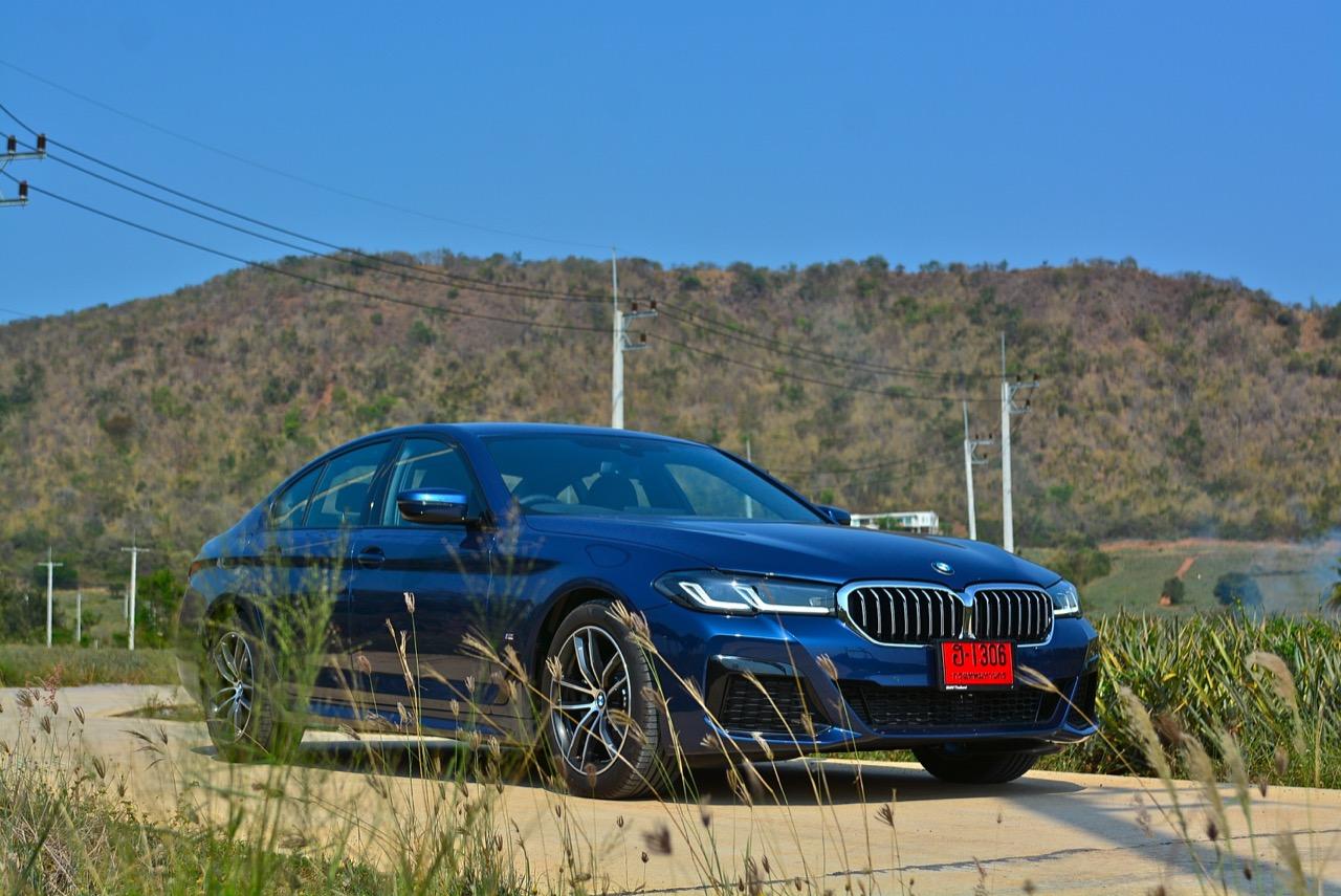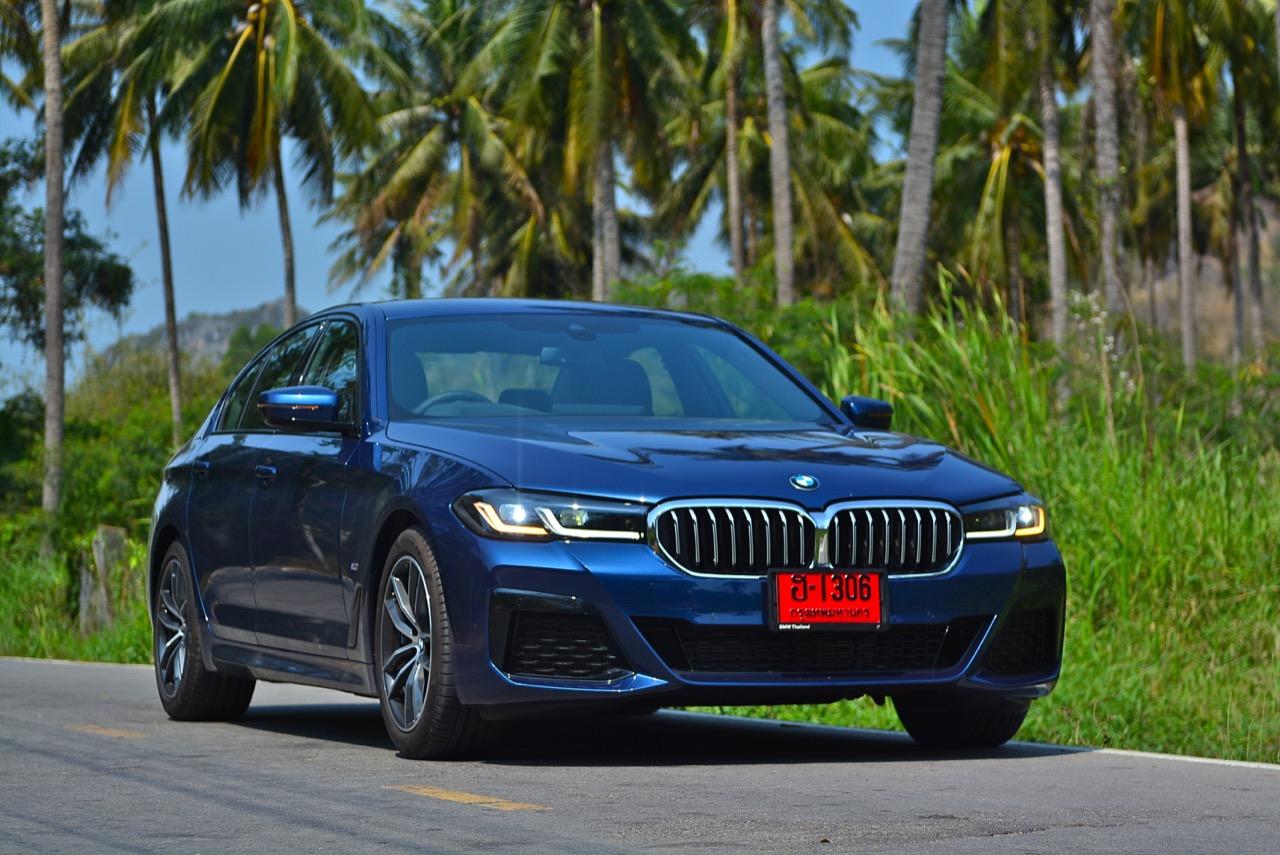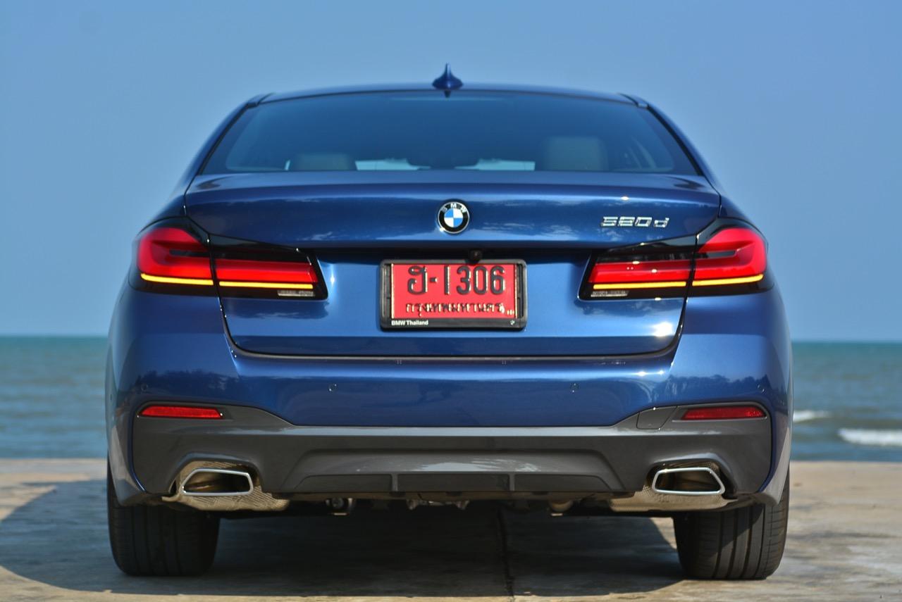 รุ่นเก่าผ่านไป ถึงเวลาของรถรุ่นปรับโฉมใหม่ หรือ LCI อย่าง Series-5 G30 เวอร์ชันไมเนอร์เชนจ์ ประจำปี 2021 รถทดสอบในอาทิตย์นี้คือซาลูนหรู 4 ประตู รุ่น New Series-5 520d M Sport ประกอบในประเทศ ราคาเปิดออกมาที่ 3,539,000 บาท สูสีกับคู่แข่งอย่าง Mercedes-Benz E220d AMG Dynamic เมื่อลองส่องดูทั่วทั้งคันก็จะพบว่าหน้าตาของ BMW 5-Series รุ่นปรับโฉมมีความสวยงามลงตัว รูปลักษณ์แตกต่างจากรุ่นที่แล้วไม่มากนัก งานออกแบบด้านหน้าใหม่เข้ามาเพิ่มเติมความเข้มข้นของ New Series-5 ให้เฉียบคมและดูดีขึ้นมาอีกนิด การปรับให้น้ำหนักส่วนเกินถูกตัดออกไป เกิดขึ้นจากแนวคิด BMW Efficient Lightweight เน้นการใช้วัสดุน้ำหนักเบาอย่างอลูมิเนียมและเหล็กกล้าที่มีความทนทานสูงแต่น้ำหนักเบามาใช้เป็นเปลือกตัวถังและแชสซี New Series-5 รุ่น 520d จึงมีน้ำหนักเบากว่ารุ่นก่อน (520d F10) 115 กิโลกรัม ตัวถังถูกออกแบบให้มีจุดศูนย์ถ่วงที่ต่ำ กระจายน้ำหนักอย่างสมดุล 50/50 และมีแรงเสียดทานอากาศต่ำที่สุดในรถระดับเดียวกัน การลงมือจูนช่วงล่างเพิ่มเติมในโฉม LCI ส่งผลให้การขับขี่มีความคล่องตัว เข้ากับความหนึบนุ่มของระบบรองรับที่เซตมาให้ในรูปแบบที่มีกลิ่นของสปอร์ตซาลูนมากกว่ารุ่น Luxury ตัวก่อนปรับโฉม ทีมวิศวกรของ BMW ทำงานอย่างหนักเพื่อลดค่าสัมประสิทธิ์แรงต้านอากาศลง 10% เมื่อเทียบกับรุ่นก่อนหน้า โดยมีค่าสัมประสิทธิ์แรงต้านอากาศอยู่ที่ 0.26 เป็นมาตรฐานสำหรับรถยนต์ซาลูนขนาดกลาง ไล่เรียงจากไฟหน้าแบบใหม่ Adaptive LED พร้อมไฟหรี่กลางวัน LED Daytime Running Light และที่เพิ่มเข้ามาก็คือกระจังหน้าใหม่ พร้อมระบบเปิด-ปิดกระจังหน้าอัตโนมัติ เมื่ออุณหภูมิเครื่องยนต์ยังคงเย็นอยู่ แผ่นครีบด้านในของชุดกระจังจะปิด เพื่อทำให้กระแสลมไหลผ่านได้ดีขึ้น และเมื่ออุณหภูมิของเครื่องยนต์สูงขึ้น กระจังจะเปิดออกโดยอัตโนมัติเพื่อนำลมมาช่วยระบายความร้อนให้กับเครื่องยนต์ร่วมกับพัดลมไฟฟ้า กันชนหน้า M Sport มีช่องรับอากาศทั้งส่วนหน้าและที่นำไประบายความร้อนให้กับชุดเบรกหน้า