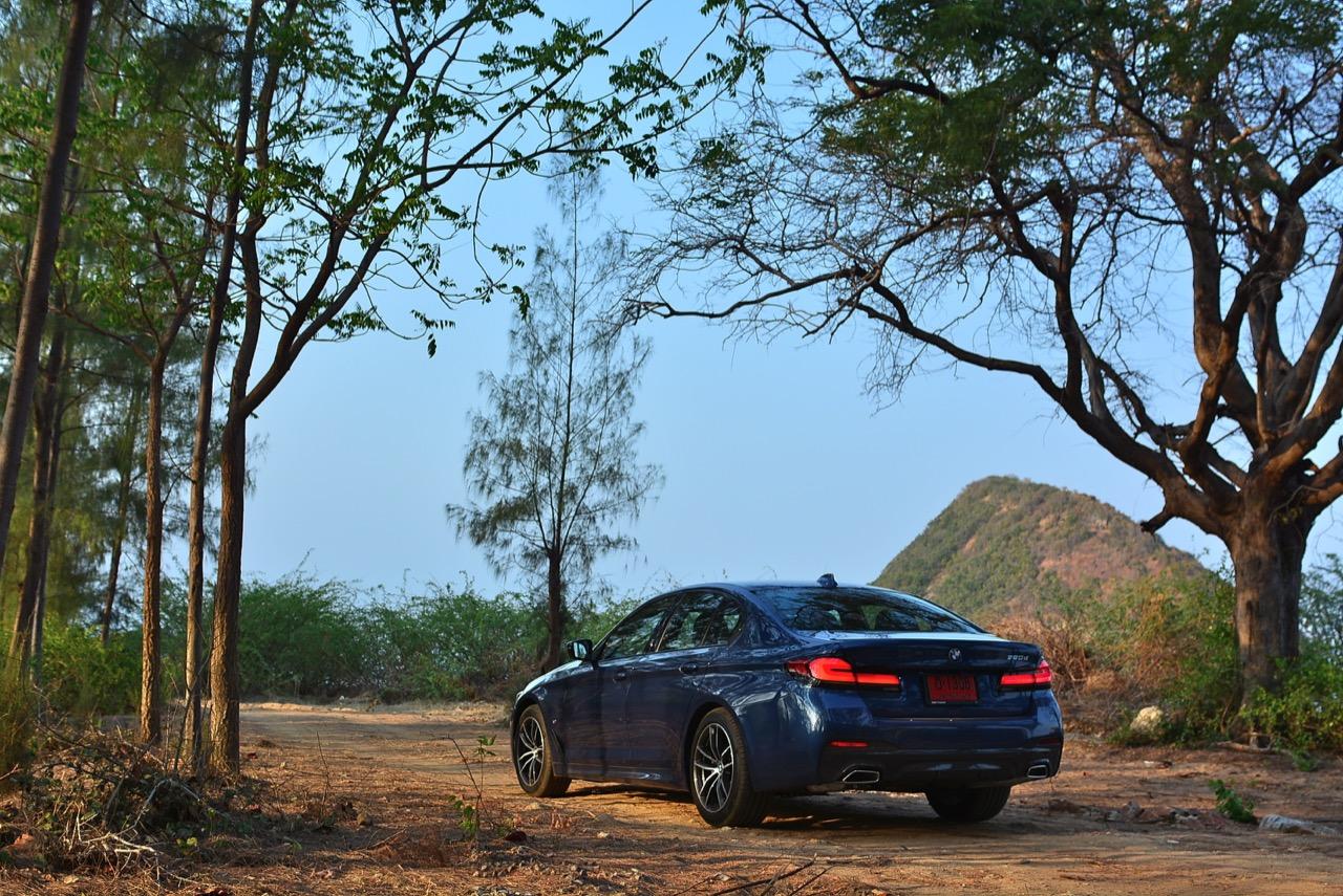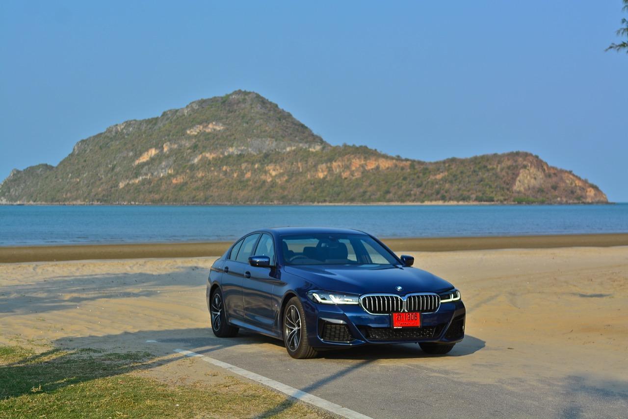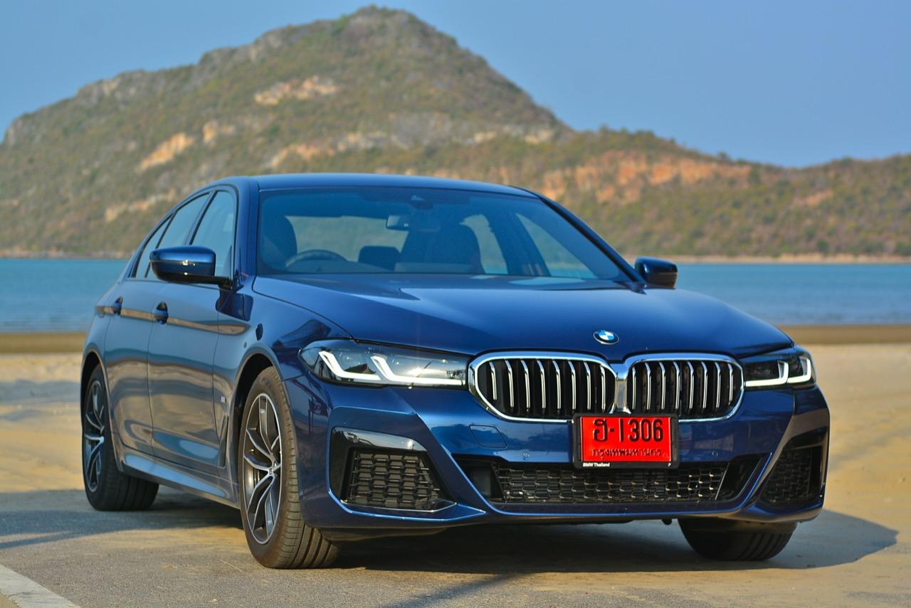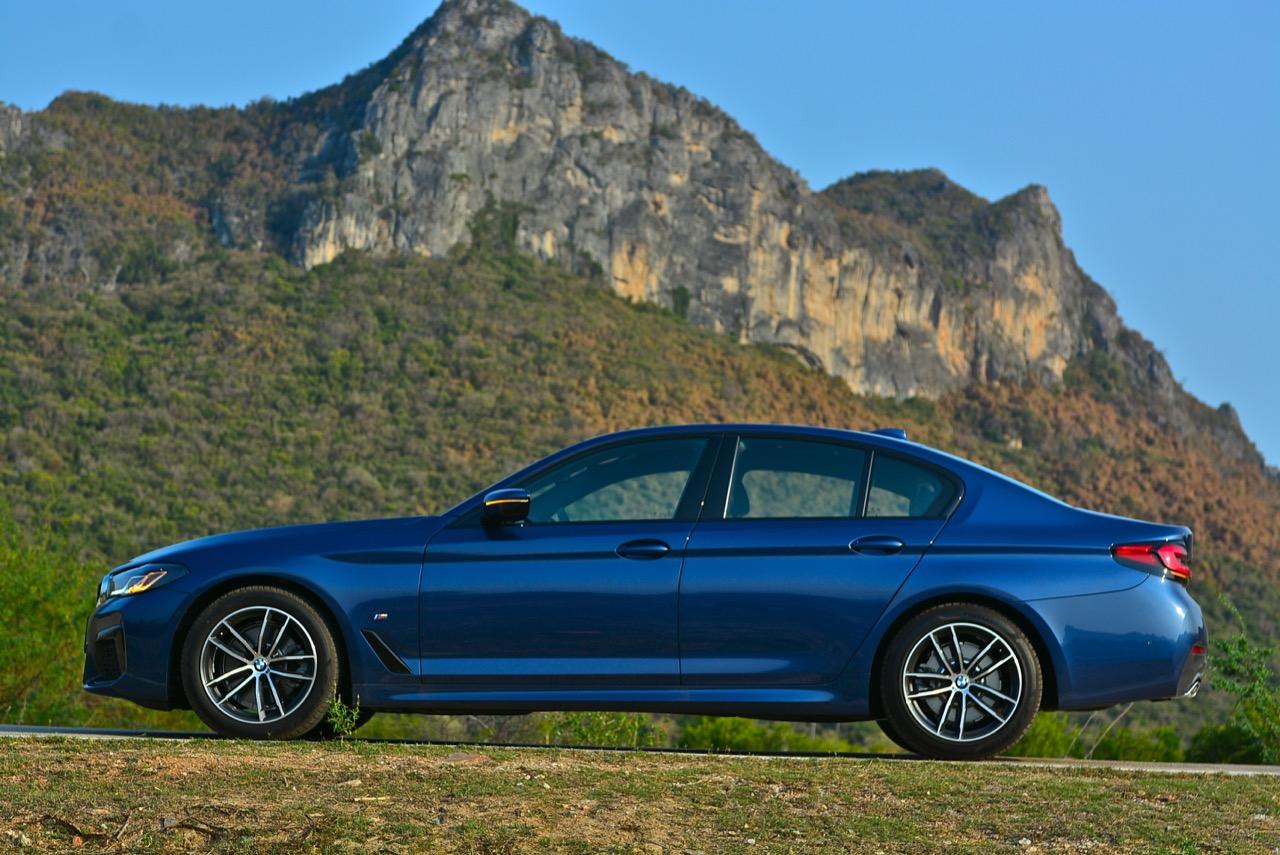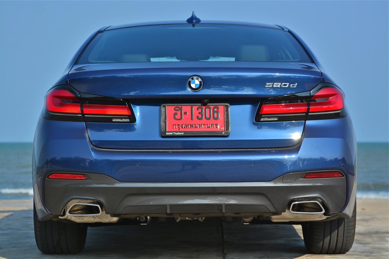 รุ่นเก่าผ่านไป ถึงเวลาของรถรุ่นปรับโฉมใหม่ หรือ LCI อย่าง Series-5 G30 เวอร์ชันไมเนอร์เชนจ์ ประจำปี 2021 รถทดสอบในอาทิตย์นี้คือซาลูนหรู 4 ประตู รุ่น New Series-5 520d M Sport ประกอบในประเทศ ราคาเปิดออกมาที่ 3,539,000 บาท สูสีกับคู่แข่งอย่าง Mercedes-Benz E220d AMG Dynamic เมื่อลองส่องดูทั่วทั้งคันก็จะพบว่าหน้าตาของ BMW 5-Series รุ่นปรับโฉมมีความสวยงามลงตัว รูปลักษณ์แตกต่างจากรุ่นที่แล้วไม่มากนัก งานออกแบบด้านหน้าใหม่เข้ามาเพิ่มเติมความเข้มข้นของ New Series-5 ให้เฉียบคมและดูดีขึ้นมาอีกนิด การปรับให้น้ำหนักส่วนเกินถูกตัดออกไป เกิดขึ้นจากแนวคิด BMW Efficient Lightweight เน้นการใช้วัสดุน้ำหนักเบาอย่างอลูมิเนียมและเหล็กกล้าที่มีความทนทานสูงแต่น้ำหนักเบามาใช้เป็นเปลือกตัวถังและแชสซี New Series-5 รุ่น 520d จึงมีน้ำหนักเบากว่ารุ่นก่อน (520d F10) 115 กิโลกรัม ตัวถังถูกออกแบบให้มีจุดศูนย์ถ่วงที่ต่ำ กระจายน้ำหนักอย่างสมดุล 50/50 และมีแรงเสียดทานอากาศต่ำที่สุดในรถระดับเดียวกัน การลงมือจูนช่วงล่างเพิ่มเติมในโฉม LCI ส่งผลให้การขับขี่มีความคล่องตัว เข้ากับความหนึบนุ่มของระบบรองรับที่เซตมาให้ในรูปแบบที่มีกลิ่นของสปอร์ตซาลูนมากกว่ารุ่น Luxury ตัวก่อนปรับโฉม ทีมวิศวกรของ BMW ทำงานอย่างหนักเพื่อลดค่าสัมประสิทธิ์แรงต้านอากาศลง 10% เมื่อเทียบกับรุ่นก่อนหน้า โดยมีค่าสัมประสิทธิ์แรงต้านอากาศอยู่ที่ 0.26 เป็นมาตรฐานสำหรับรถยนต์ซาลูนขนาดกลาง ไล่เรียงจากไฟหน้าแบบใหม่ Adaptive LED พร้อมไฟหรี่กลางวัน LED Daytime Running Light และที่เพิ่มเข้ามาก็คือกระจังหน้าใหม่ พร้อมระบบเปิด-ปิดกระจังหน้าอัตโนมัติ เมื่ออุณหภูมิเครื่องยนต์ยังคงเย็นอยู่ แผ่นครีบด้านในของชุดกระจังจะปิด เพื่อทำให้กระแสลมไหลผ่านได้ดีขึ้น และเมื่ออุณหภูมิของเครื่องยนต์สูงขึ้น กระจังจะเปิดออกโดยอัตโนมัติเพื่อนำลมมาช่วยระบายความร้อนให้กับเครื่องยนต์ร่วมกับพัดลมไฟฟ้า กันชนหน้า M Sport มีช่องรับอากาศทั้งส่วนหน้าและที่นำไประบายความร้อนให้กับชุดเบรกหน้า