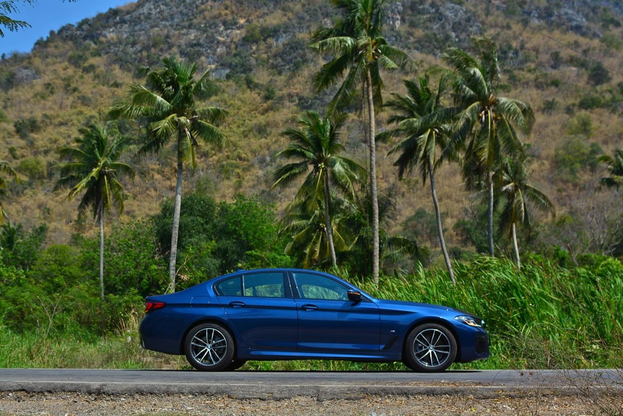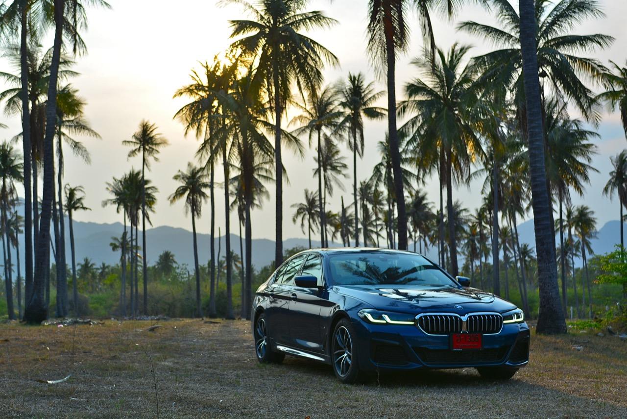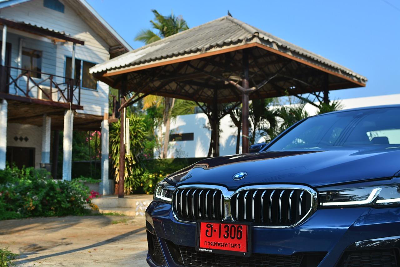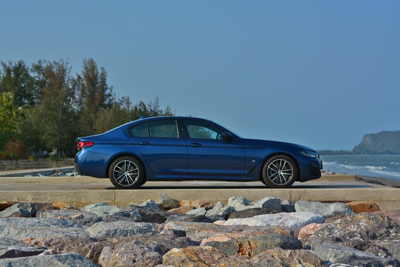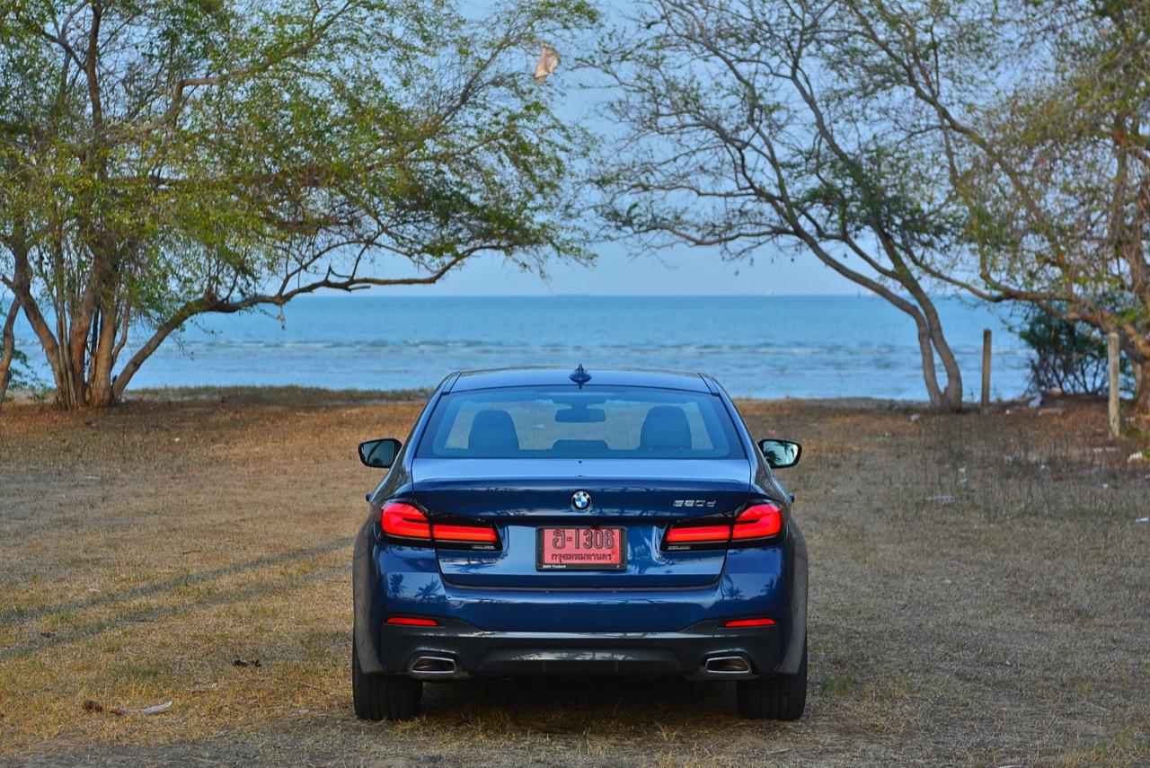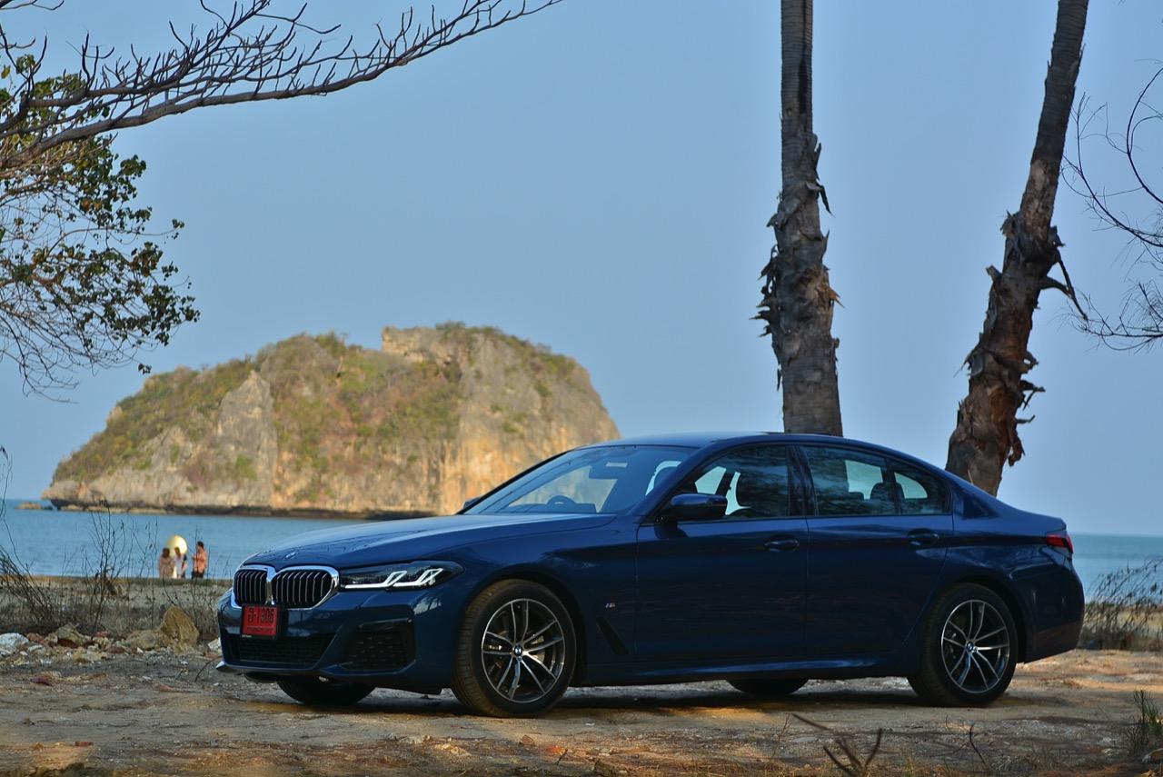 รุ่นเก่าผ่านไป ถึงเวลาของรถรุ่นปรับโฉมใหม่ หรือ LCI อย่าง Series-5 G30 เวอร์ชันไมเนอร์เชนจ์ ประจำปี 2021 รถทดสอบในอาทิตย์นี้คือซาลูนหรู 4 ประตู รุ่น New Series-5 520d M Sport ประกอบในประเทศ ราคาเปิดออกมาที่ 3,539,000 บาท สูสีกับคู่แข่งอย่าง Mercedes-Benz E220d AMG Dynamic เมื่อลองส่องดูทั่วทั้งคันก็จะพบว่าหน้าตาของ BMW 5-Series รุ่นปรับโฉมมีความสวยงามลงตัว รูปลักษณ์แตกต่างจากรุ่นที่แล้วไม่มากนัก งานออกแบบด้านหน้าใหม่เข้ามาเพิ่มเติมความเข้มข้นของ New Series-5 ให้เฉียบคมและดูดีขึ้นมาอีกนิด การปรับให้น้ำหนักส่วนเกินถูกตัดออกไป เกิดขึ้นจากแนวคิด BMW Efficient Lightweight เน้นการใช้วัสดุน้ำหนักเบาอย่างอลูมิเนียมและเหล็กกล้าที่มีความทนทานสูงแต่น้ำหนักเบามาใช้เป็นเปลือกตัวถังและแชสซี New Series-5 รุ่น 520d จึงมีน้ำหนักเบากว่ารุ่นก่อน (520d F10) 115 กิโลกรัม ตัวถังถูกออกแบบให้มีจุดศูนย์ถ่วงที่ต่ำ กระจายน้ำหนักอย่างสมดุล 50/50 และมีแรงเสียดทานอากาศต่ำที่สุดในรถระดับเดียวกัน การลงมือจูนช่วงล่างเพิ่มเติมในโฉม LCI ส่งผลให้การขับขี่มีความคล่องตัว เข้ากับความหนึบนุ่มของระบบรองรับที่เซตมาให้ในรูปแบบที่มีกลิ่นของสปอร์ตซาลูนมากกว่ารุ่น Luxury ตัวก่อนปรับโฉม ทีมวิศวกรของ BMW ทำงานอย่างหนักเพื่อลดค่าสัมประสิทธิ์แรงต้านอากาศลง 10% เมื่อเทียบกับรุ่นก่อนหน้า โดยมีค่าสัมประสิทธิ์แรงต้านอากาศอยู่ที่ 0.26 เป็นมาตรฐานสำหรับรถยนต์ซาลูนขนาดกลาง ไล่เรียงจากไฟหน้าแบบใหม่ Adaptive LED พร้อมไฟหรี่กลางวัน LED Daytime Running Light และที่เพิ่มเข้ามาก็คือกระจังหน้าใหม่ พร้อมระบบเปิด-ปิดกระจังหน้าอัตโนมัติ เมื่ออุณหภูมิเครื่องยนต์ยังคงเย็นอยู่ แผ่นครีบด้านในของชุดกระจังจะปิด เพื่อทำให้กระแสลมไหลผ่านได้ดีขึ้น และเมื่ออุณหภูมิของเครื่องยนต์สูงขึ้น กระจังจะเปิดออกโดยอัตโนมัติเพื่อนำลมมาช่วยระบายความร้อนให้กับเครื่องยนต์ร่วมกับพัดลมไฟฟ้า กันชนหน้า M Sport มีช่องรับอากาศทั้งส่วนหน้าและที่นำไประบายความร้อนให้กับชุดเบรกหน้า