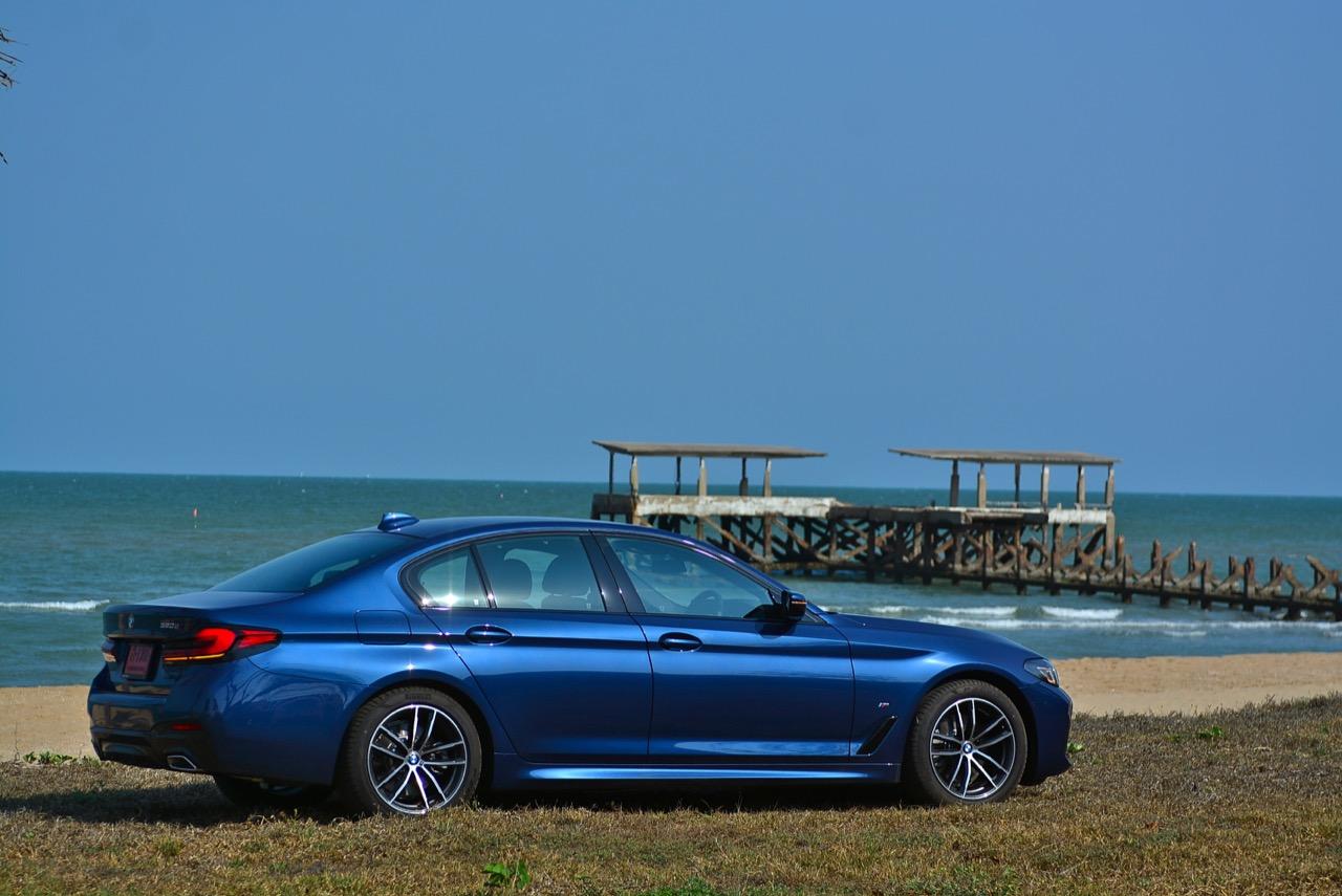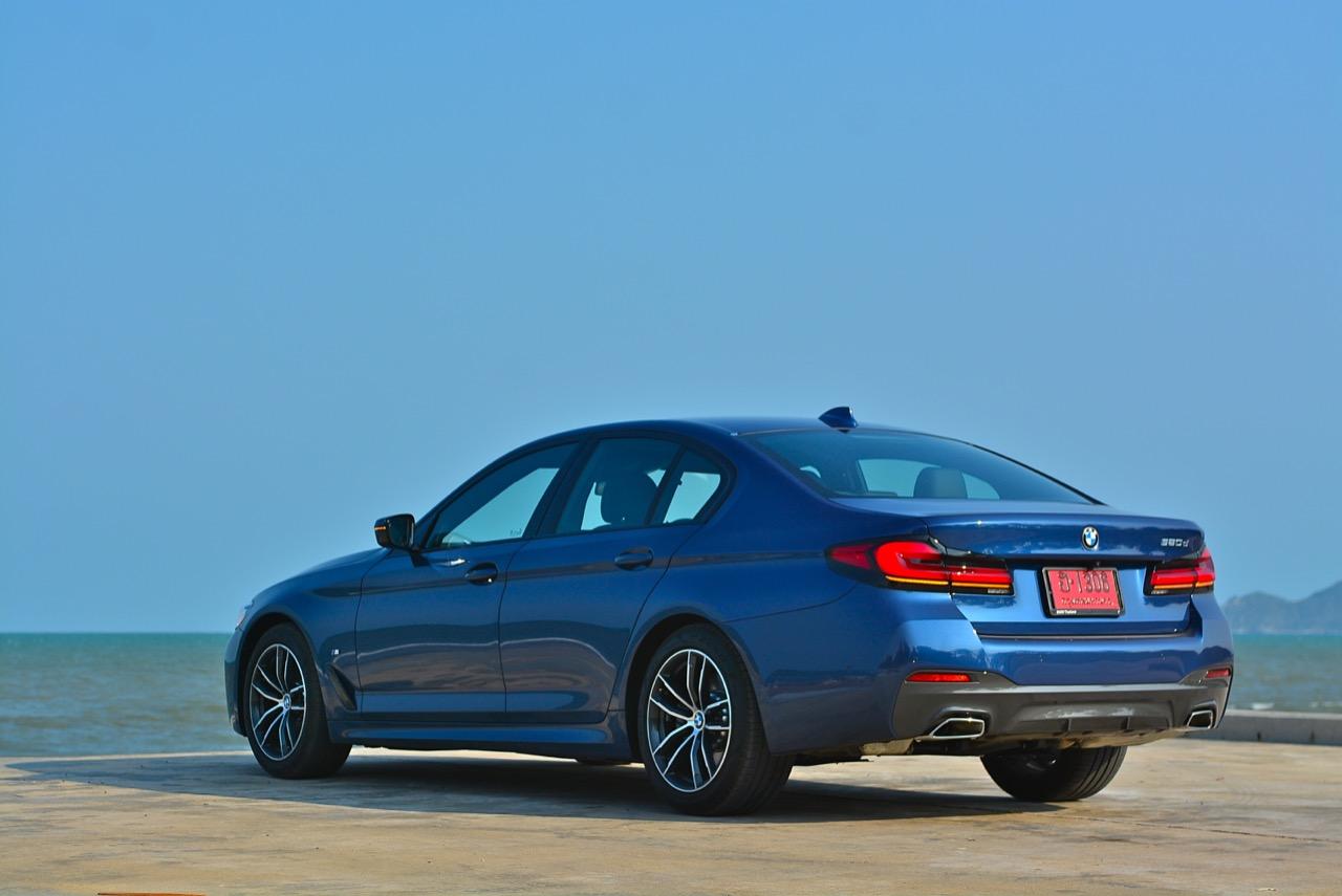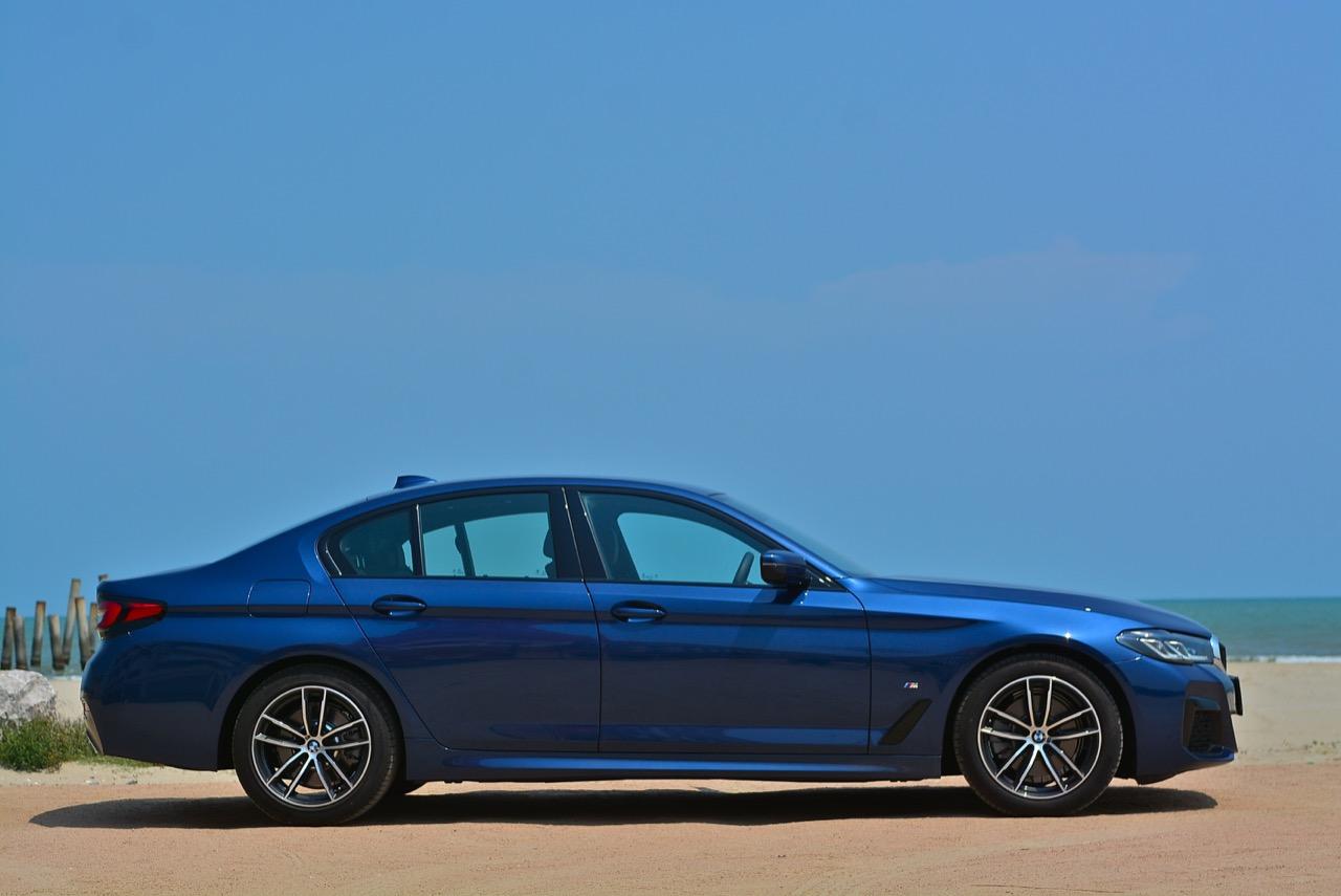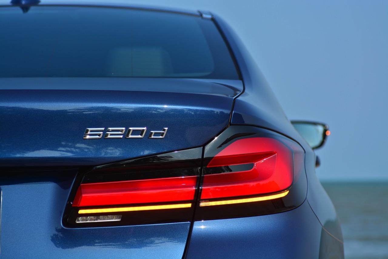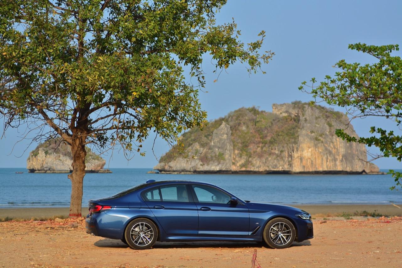รุ่นเก่าผ่านไป ถึงเวลาของรถรุ่นปรับโฉมใหม่ หรือ LCI อย่าง Series-5 G30 เวอร์ชันไมเนอร์เชนจ์ ประจำปี 2021 รถทดสอบในอาทิตย์นี้คือซาลูนหรู 4 ประตู รุ่น New Series-5 520d M Sport ประกอบในประเทศ ราคาเปิดออกมาที่ 3,539,000 บาท สูสีกับคู่แข่งอย่าง Mercedes-Benz E220d AMG Dynamic เมื่อลองส่องดูทั่วทั้งคันก็จะพบว่าหน้าตาของ BMW 5-Series รุ่นปรับโฉมมีความสวยงามลงตัว รูปลักษณ์แตกต่างจากรุ่นที่แล้วไม่มากนัก งานออกแบบด้านหน้าใหม่เข้ามาเพิ่มเติมความเข้มข้นของ New Series-5 ให้เฉียบคมและดูดีขึ้นมาอีกนิด การปรับให้น้ำหนักส่วนเกินถูกตัดออกไป เกิดขึ้นจากแนวคิด BMW Efficient Lightweight เน้นการใช้วัสดุน้ำหนักเบาอย่างอลูมิเนียมและเหล็กกล้าที่มีความทนทานสูงแต่น้ำหนักเบามาใช้เป็นเปลือกตัวถังและแชสซี New Series-5 รุ่น 520d จึงมีน้ำหนักเบากว่ารุ่นก่อน (520d F10) 115 กิโลกรัม ตัวถังถูกออกแบบให้มีจุดศูนย์ถ่วงที่ต่ำ กระจายน้ำหนักอย่างสมดุล 50/50 และมีแรงเสียดทานอากาศต่ำที่สุดในรถระดับเดียวกัน การลงมือจูนช่วงล่างเพิ่มเติมในโฉม LCI ส่งผลให้การขับขี่มีความคล่องตัว เข้ากับความหนึบนุ่มของระบบรองรับที่เซตมาให้ในรูปแบบที่มีกลิ่นของสปอร์ตซาลูนมากกว่ารุ่น Luxury ตัวก่อนปรับโฉม ทีมวิศวกรของ BMW ทำงานอย่างหนักเพื่อลดค่าสัมประสิทธิ์แรงต้านอากาศลง 10% เมื่อเทียบกับรุ่นก่อนหน้า โดยมีค่าสัมประสิทธิ์แรงต้านอากาศอยู่ที่ 0.26 เป็นมาตรฐานสำหรับรถยนต์ซาลูนขนาดกลาง ไล่เรียงจากไฟหน้าแบบใหม่ Adaptive LED พร้อมไฟหรี่กลางวัน LED Daytime Running Light และที่เพิ่มเข้ามาก็คือกระจังหน้าใหม่ พร้อมระบบเปิด-ปิดกระจังหน้าอัตโนมัติ เมื่ออุณหภูมิเครื่องยนต์ยังคงเย็นอยู่ แผ่นครีบด้านในของชุดกระจังจะปิด เพื่อทำให้กระแสลมไหลผ่านได้ดีขึ้น และเมื่ออุณหภูมิของเครื่องยนต์สูงขึ้น กระจังจะเปิดออกโดยอัตโนมัติเพื่อนำลมมาช่วยระบายความร้อนให้กับเครื่องยนต์ร่วมกับพัดลมไฟฟ้า กันชนหน้า M Sport มีช่องรับอากาศทั้งส่วนหน้าและที่นำไประบายความร้อนให้กับชุดเบรกหน้า