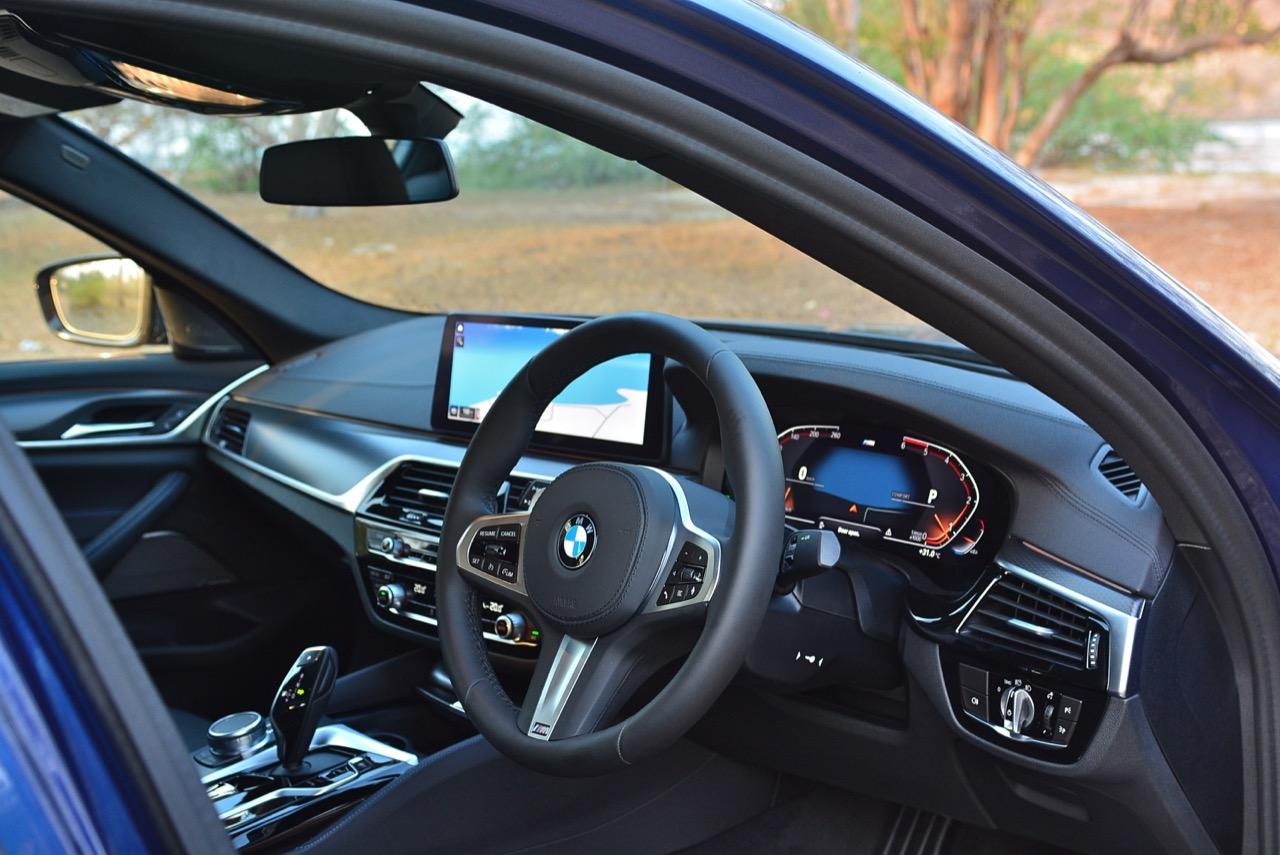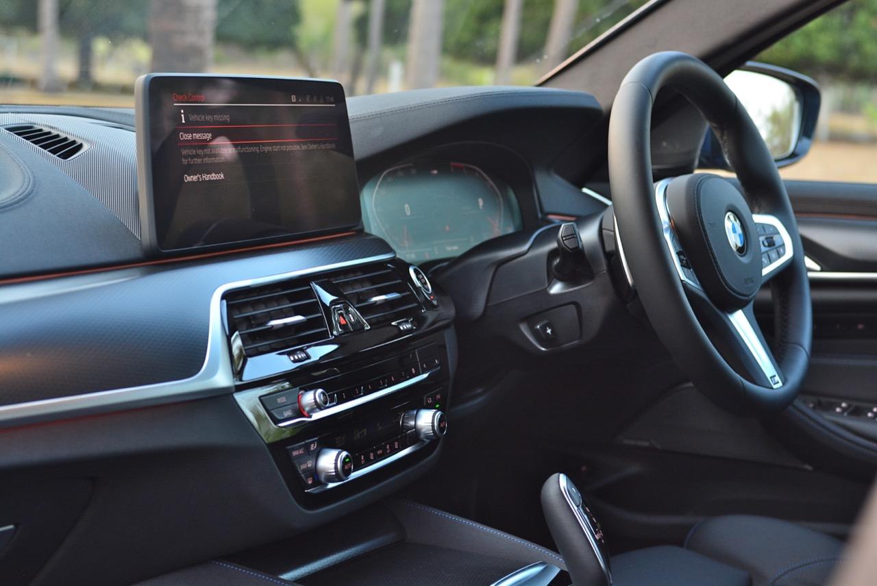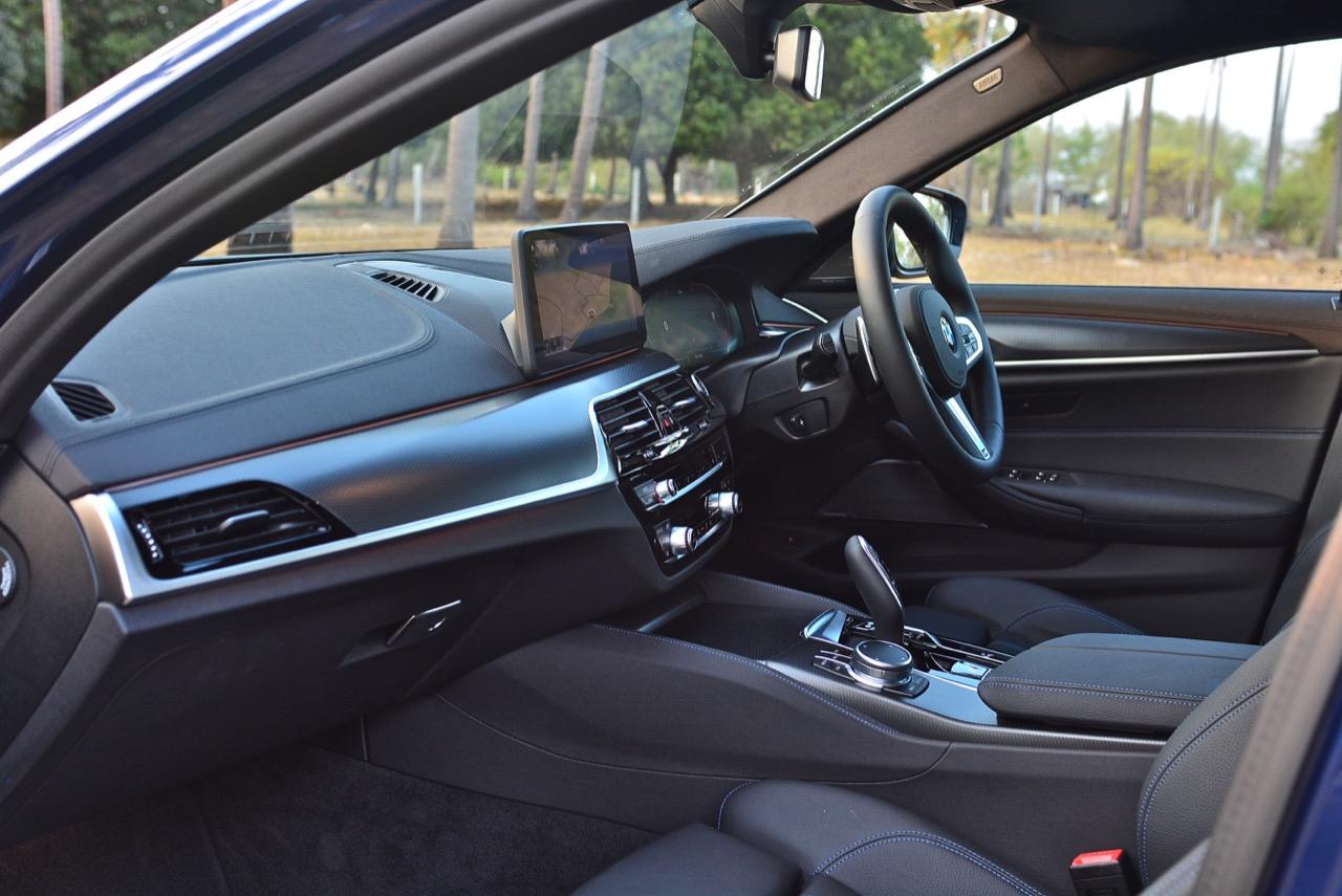 BMW G30 (Series-5) รุ่น 520d M Sport ออกแบบห้องโดยสารมาเพื่อการขับขี่อย่างเต็มประสิทธิภาพ การจัดวางตำแหน่งของปุ่มและสวิตช์ต่างๆ เอื้ออำนวยต่อการใช้งานของคนขับเป็นหลัก มันถูกตกแต่งภายในด้วยโลหะพวกอลูมิเนียม หนังแท้ ผ้าและพลาสติกเกรดสูง รวมถึงวัสดุในดีไซน์ที่แสดงออกถึงความหรูหรา เป็นเอกลักษณ์ของยานยนต์ซาลูนไซส์กลางจากแบรนด์ตราใบพัด หน้าปัดมาตรวัดแบบจอภาพ TFT 12.3 นิ้ว จอแสดงผลนแผงคอนโซลกลางขนาดใหญ่ มาพร้อมกับหน้าจอแสดงผลขนาด 10.25 นิ้ว ที่ทำงานควบคู่กับระบบ iDrive Controller ส่วนฟังก์ชัน REMOTE SOFTWARE UPGRADE ระบบนี้รถจะได้รับการอัปเดตซอฟต์แวร์อัตโนมัติให้เป็นเวอร์ชันล่าสุดอยู่เสมอ โดยใช้สมาร์ทโฟนในการอัปเดตทำได้อย่างง่าย และยังสามารถเปิดการใช้งานฟังก์ชันอื่นๆ ได้อีกด้วย