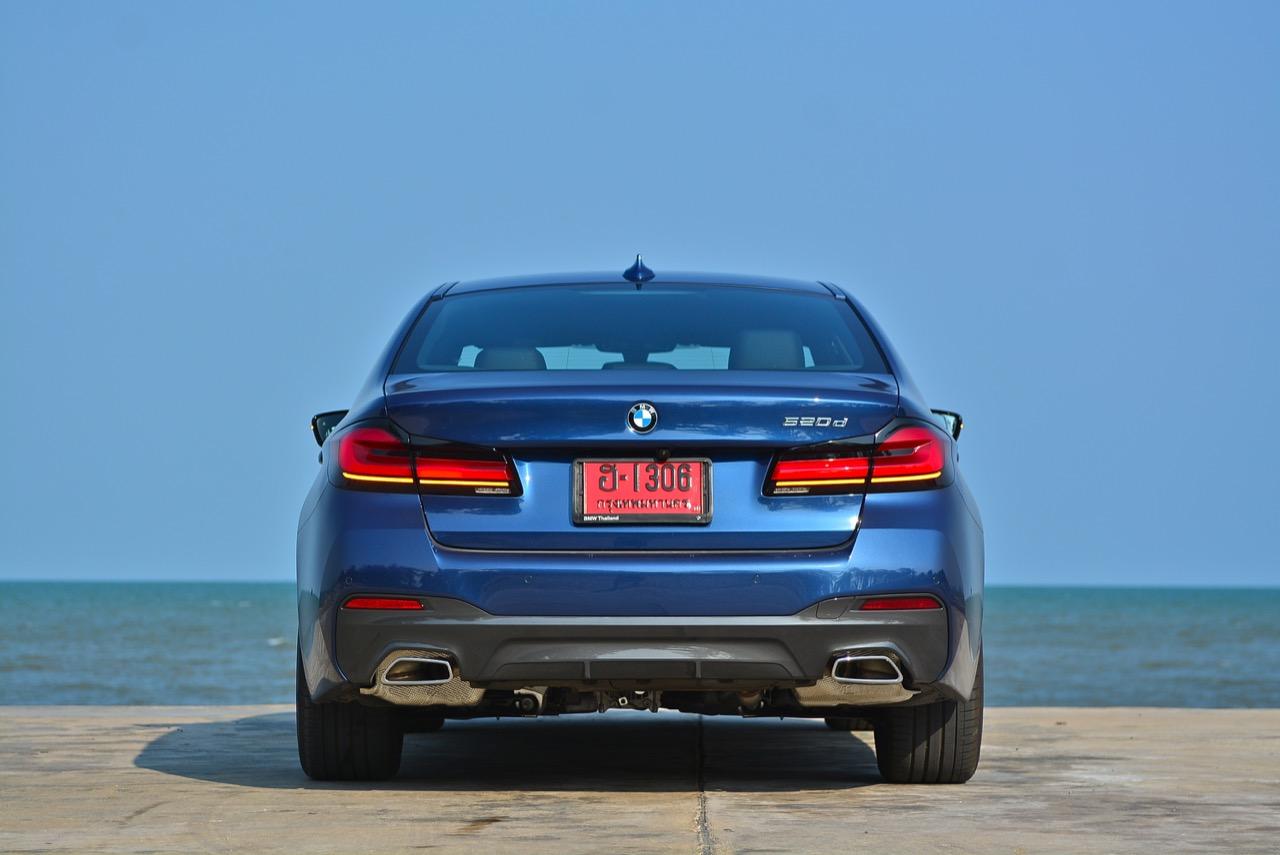 BMW 520d Sportline CKD รุ่นประกอบในประเทศ มีเวลาอยู่กับผมแค่หนึ่งอาทิตย์ หลังจากขับทดสอบ Series-5 G30 ครบทุกรุ่น ก็มาถึงช่วงเวลาพิเศษที่จะได้ลองรถรุ่นปรับโฉม LCI ใน 520d M Sport รุ่นประกอบในประเทศซึ่งใช้เครื่องยนต์ดีเซลรุ่นเล็กแบบ 4 กระบอกสูบ โดยมีเสียงของเครื่องยนต์เบาลงเมื่อเปรียบเทียบกับคู่แข่ง ชุดเกียร์ออโตเมตริก Step-Tronic 8 สปีดของ ZF ให้อัตราทดเกียร์ที่ต่อเนื่องในทุกย่านความเร็ว เป็นเกียร์ที่ BMW ใช้ในรถเกือบจะทุกโมเดลไล่จาก Series-1 ไปจนถึง Series-7 ยกเว้น M บางรุ่นที่เป็นเกียร์คลัตช์คู่ DCT และรถเล็กขับหน้าบางรุ่นที่ต้องใช้เกียร์ร่วมกับ MINI เกียร์ ZF8HP ใน Series-5 G30 มีซุ้มเกียร์ที่สวยงาม สวิตช์ปรับตั้งโหมดขับเคลื่อนอยู่ข้างคันเกียร์ทำให้ใช้งานได้ง่ายและเร็ว การออกตัวจากจุดหยุดนิ่งในรถผู้บริหารคันนี้ก็เต็มไปด้วยความง่ายดาย กดคันเร่งเบาๆ ในโหมด Comfort แรงบิด 400 นิวตันเมตรจะโผล่มาในรอบต่ำทันที เมื่อลองกดคันเร่งเบาๆ แค่ 1,350-2,400 รอบต่อนาที แรงบิดเกือบทั้งหมดจะปั่นล้อจนเกือบจะฟรีทิ้ง หากเผลอตัวหรืออยากจะจัดเต็มๆ กับสปอร์ตซาลูนคันนี้ก็แค่กดคันเร่งไฟฟ้าให้ลึกหน่อย คุณก็จะพบกับแรงดึงพุ่งทะยานจากเครื่องยนต์ที่ทำให้รู้สึกสนุก อัตราเร่ง 0-100 กิโลเมตรใน 7 วินาทีนิดๆ หากมีทางที่โล่งมากพอ แรงบิด 400 นิวตันเมตรดึงตัวถังหนัก 1.6 ตันให้พุ่งทะยานไปข้างหน้าอย่างมั่นคง บนเส้นทางจากกรุงเทพฯมุ่งหน้าไปยังจังหวัดประจวบฯ แรงบิดจากเครื่องดีเซลตัวเล็กมากที่จะทำให้คุณรู้สึกได้ถึงความเร็วที่เพิ่มขึ้นอย่างต่อเนื่องและไหลลื่น อย่างที่เคยบอกกันบ่อยๆ ว่า ค่าย BMW นั้นมักจะได้รับรางวัลเครื่องยนต์ยอดเยี่ยมประจำปีอยู่เสมอ และนี่ก็เป็นเครื่องยนต์ดีเซลตัวเล็กอีกรุ่นที่ถูกปรับแต่งมาจากโรงงานจนมีประสิทธิภาพไม่เป็นสองรองใคร ไม่ว่าจะเป็นเยอรมันด้วยกันเองอย่าง OM654 ของ Mercedes Benz ที่ประจำการอยู่ใน E220d W213