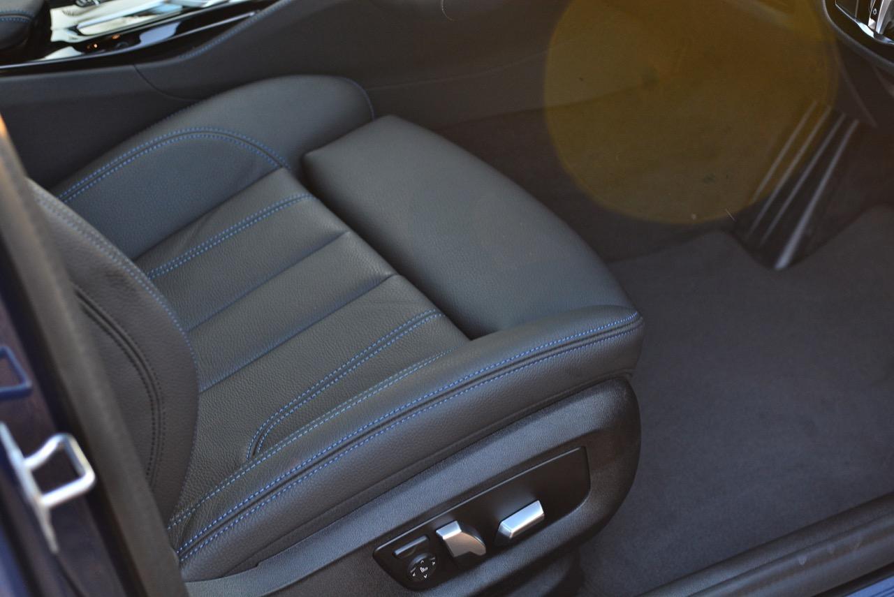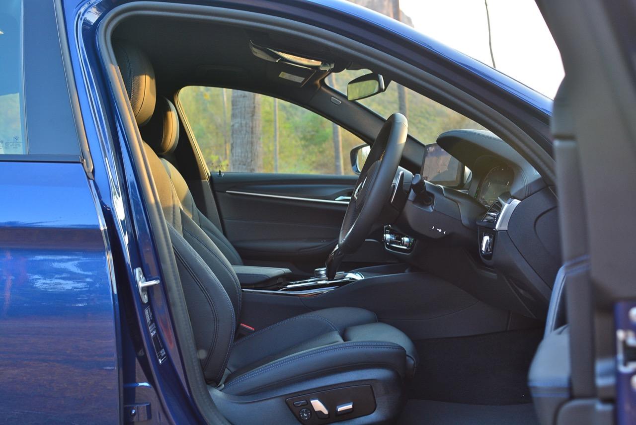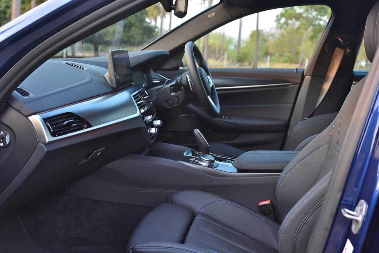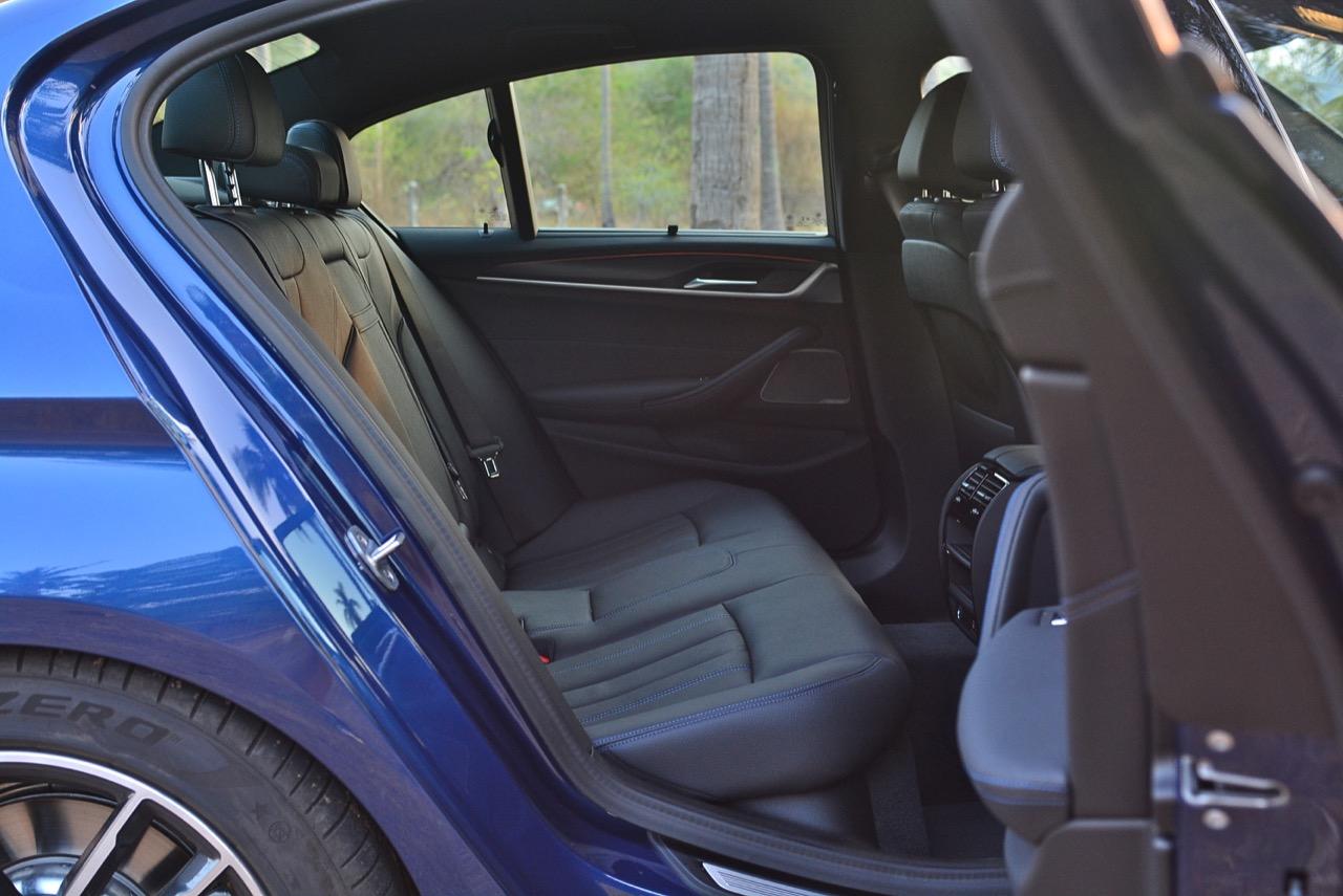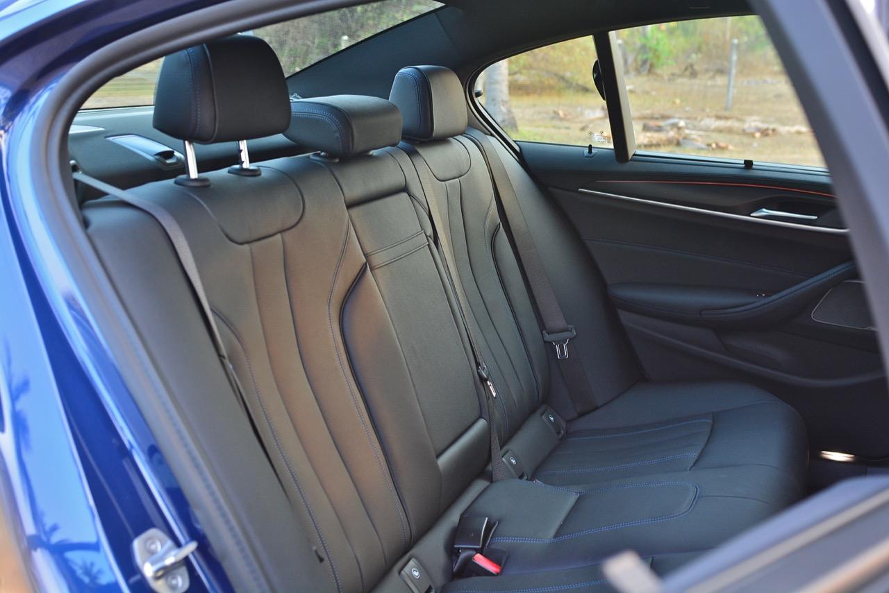 เบาะนั่ง M ดีไซน์สปอร์ต สำหรับคนขับและผู้โดยสารตอนหน้า ออกแบบส่วนด้านข้างของเบาะที่ยกสูง จุดนี้เองที่ทำให้เจ้าของหลายคนออกอาการเมื่อยเมื่อขับทางไกล บางคนถึงกับต้องทำเบาะรองเสริมเพื่อแก้ความเมื่อยดังกล่าว แต่ก็ไม่ได้เป็นทุกคน เพราะสรีระของลูกค้าซึ่งเป็นเจ้าของนั้นมีความแตกต่างกัน ขอบของเบาะบริเวณสะโพกที่ออกแบบให้ยกตัวสูงขึ้น เมื่อผมขับทางไกลทั้งวันจากกรุงเทพฯไปยังกุยบุรีแล้วขับกลับ รวมระยะทางเฉียด 600 กิโลเมตร ก็พบว่าเมื่อยอยู่เหมือนกัน เบาะหลังมีพื้นที่กว้างขวางพอเพียง พร้อมช่องแอร์เพื่อความเย็นฉ่ำที่กระจายได้อย่างทั่วถึง Series-5 520d M Sport ยังมีม่านไฟฟ้าด้านหลังและม่านด้านข้างของบานประตูหลังทั้งสอง ช่วยเพิ่มความเป็นส่วนตัวและช่วยบังแสงแดดได้ดี เพดานห้องโดยสารใช้วัสดุเก็บเสียงในตัว ช่วยลดเสียงรบกวนในห้องโดยสารได้ดี โดยเฉพาะในบริเวณที่ใกล้กับศีรษะเพื่อความผ่อนคลาย ชิ้นส่วนและอุปกรณ์ต่างๆ ที่ติดตั้งอยู่บนแชสซีได้รับการปรับให้มีน้ำหนักเบาลงมาก เช่น การรวมระบบเบรกมือไฟฟ้าเข้ากับคาร์ลิปเปอร์เบรกล้อหลังซึ่งลดน้ำหนักได้ 3 กิโลกรัม โดยรวมแล้วการลดน้ำหนักของตัวเบรก ล้อและยางที่มีขนาดพอดี ไม่ใหญ่จนเกินไป ทำให้ Series-5 LCI มีน้ำหนักรวมของช่วงล่างเบาลง มีผลต่อการตอบสนองและความนุ่มนวลในการขับขี่อย่างเห็นได้ชัด