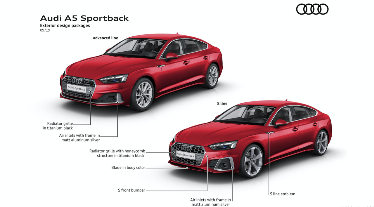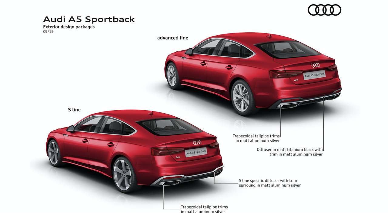 A5 Sportback 4 ประตู สานต่อความสามารถของรุ่น 2 ประตูด้วยพื้นที่วางเท้าบริเวณเบาะหลังที่มากกว่า และถ้าไม่ใช่คนที่ขับเร็วตลอดเวลา กำลัง 190 แรงม้ากับแรงบิด 320 นิวตันเมตร ถือว่า พอเพียงต่อการใช้งาน รูปลักษณ์ของ A5 รุ่น 4 ประตู เวอร์ชั่น 40TFSI ยังคงคล้ายกับรุ่น 2 ประตู แต่มีรายละเอียดของงานตกแต่งภายนอกบางจุดที่แตกต่างกันออกไปตามระดับของราคาค่าตัว A5ใหม่ มาพร้อมกระจังหน้าเจาะรูพรุนแนวรังผึ้งทรง 6 เหลี่ยม ชุดกระจังล้อมกรอบด้วยงานพลาสติกโครเมี่ยมสีเงิน ตราสัญลักษณ์สี่ห่วงสีเงิน กันชนหน้าทรงเหลี่ยมมีเส้นที่ตัดกันอย่างเฉียบคมของชิ้นงานช่องรับอากาศ ไฟหน้าแบบใหม่ Matrix LED และไฟหรี่กลางวัน LED daytime Running Light สำหรับการขับขี่ในเวลากลางวัน ระบบไฟอัตโนมัติ Matrix LED ส่องสว่างไกลและมีการทำงานด้วยระบบอัตโนมัติ เซนเซอร์จะตรวจจับแสงไฟและสภาพแวดล้อมด้านหน้าขณะขับขี่ โดยจะทำการยกไฟสูงแบบอัตโนมัติ กำลังในการส่องสว่างไกล 500 เมตร ลำแสงสีขาวที่สาดออกไปยังจุดที่มืดเพื่อเพิ่มเติมทัศนวิสัยให้ชัดเจนเมื่อขับท่ามกลางความมืดบนถนนที่ปราศจากแสงไฟ ระบบอัตโนมัติ Matrix LED จะลด หรือเบี่ยงเบนลำแสง เพื่อไม่ทำให้แสงไฟไปแยงตารถที่แล่นสวนมาหรือรถที่วิ่งอยู่ข้างหน้า มุมทั้งสองข้างของกันชนหน้ามีชิ้นงานที่คล้ายกับอะลูมีเนียมสีเงิน ตกแต่งอยู่บริเวณช่องรับอากาศด้านข้างของชุดกันชนหน้า ฝากระโปรงมีการดึงเส้นนำสายตาเพื่อทำให้เกิดมิติบนฝากระโปรงหน้า ที่เชื่อมโยงกับแนวของกระจังและไฟหน้าได้อย่างลงตัว
