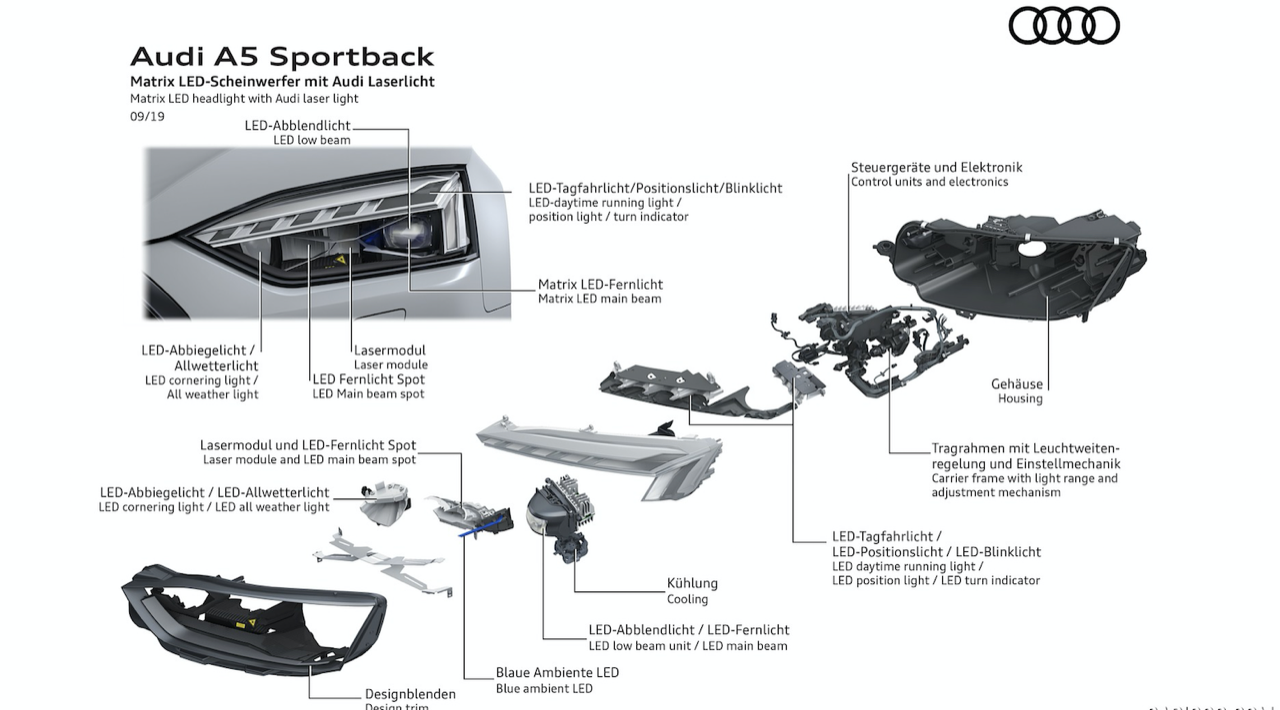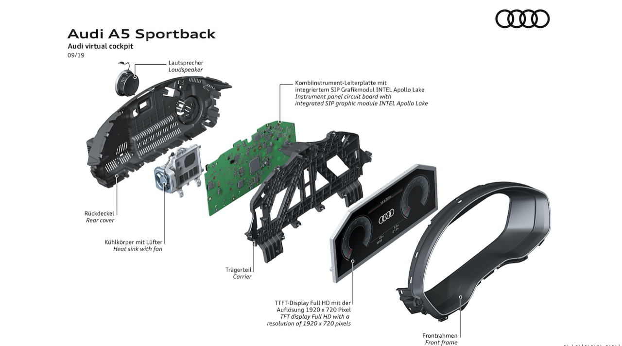 จอภาพมอนิเตอร์กลางขนาด 12.3 นิ้ว ในหน้าปัดมาตรวัดแบบใหม่ของ New A5 ยังมีลูกเล่นอื่นๆ อีกเพียบ การใช้งานท่ามกลางเทคโนโลยีที่แปรเปลี่ยน ทำให้ค่ายผู้ผลิตรถยนต์ต้องคิดค้นหาวิธีผูกมัดใจคนซื้อให้อยู่หมัดด้วยของเล่นแปลกๆ ที่ทันสมัย มาตรวัดแบบ TFT LCD หรือ thin film transistor ยังมีอยู่ในรถระดับสูง เช่น Lamborghini / Ferrari / Mercedes Benz / BMW / Volvo / Lexus ฯ ซึ่งต่างฝ่ายต่างก็พยายามสร้างสรรค์งานศิลปะบนความเป็นไดนามิกที่น่าใช้งานในรถรุ่นใหม่ ราวกับนักมายากล Virtual Cockpit ของ new A5 Sportback ยังสามารถแสดงค่าต่างๆ ของตัวรถ รวมถึงการโชว์ระบบ Infotainment ด้วยความคมชัดสูงสุด หน้าปัดและแดชบอร์ดต่างๆ ถูกออกแบบมาเพื่อสร้างความรู้สึกถึงการควบคุมจักรกลพลังสูงท่ีมีความทันสมัย
