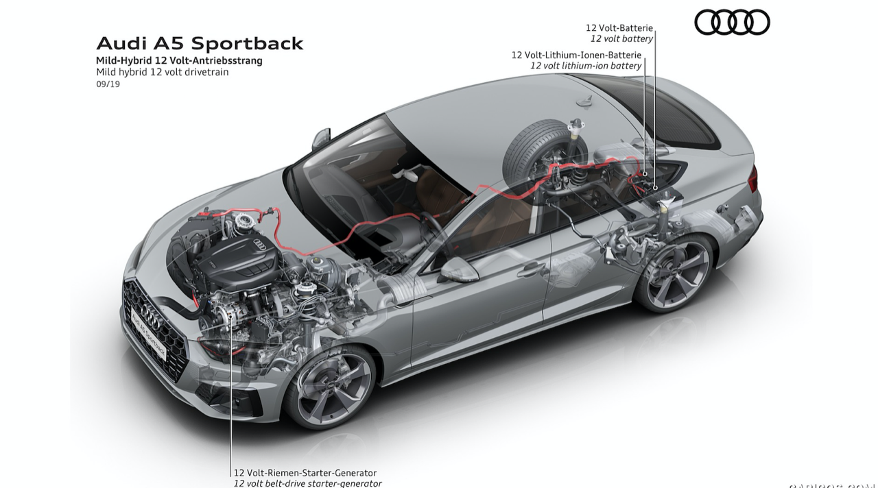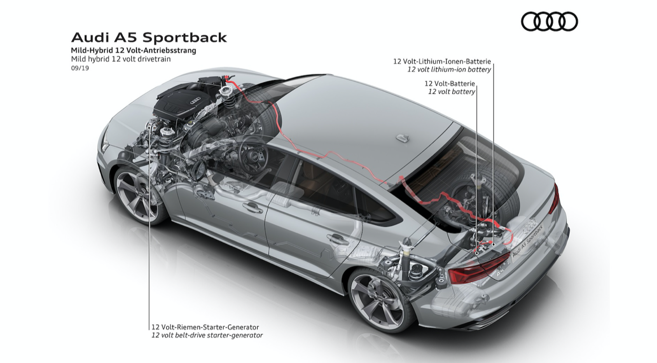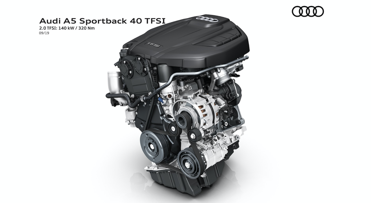 Audi New A5 รุ่น 40TFSI S Line วางเครื่องยนต์ขนาดกะทัดรัด เป็นเครื่องเบนซินแถวเรียง 4 กระบอกสูบ พ่วงกลไกระบบไฟฟ้าเสริม mild hybrid (MHEV) ขนาด 12 โวลต์ เครื่องยนต์เบนซินขนาดเล็ก ความจุ 2 ลิตร 1,984 ซีซี 4 วาล์วต่อสูบ พร้อมกลไกวาล์วแปรผัน Audi Valvelift system อัดอากาศด้วยเทอร์โบลูกเดี่ยวโดดๆ พร้อมอินเตอร์คูลเลอร์ ให้กำลัง 140 กิโลวัตต์ หรือ 190 แรงม้า ที่ 4,200 - 6,000 รอบต่อนาที แรงบิด ลงไปที่ล้อหน้า ด้วยตัวเลขแรงบิดระดับ 320 นิวตันเมตร ส่งกำลังด้วยเกียร์ออโต้ S-Tronic 7 Speed สำหรับตัวเลขสมรรถนะนั้น A5 Sportback 40TFSI สามารถเร่งจาก 0-100 กิโลเมตรต่อชั่วโมงได้ในเวลา7.5 วินาที โดยมีความเร็วสูงสุด 239 กิโลเมตรต่อชั่วโมง