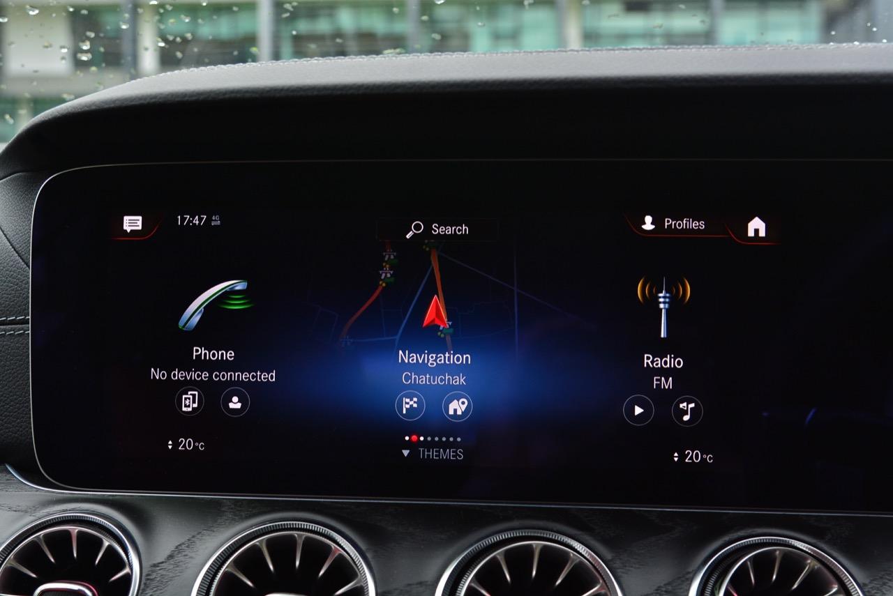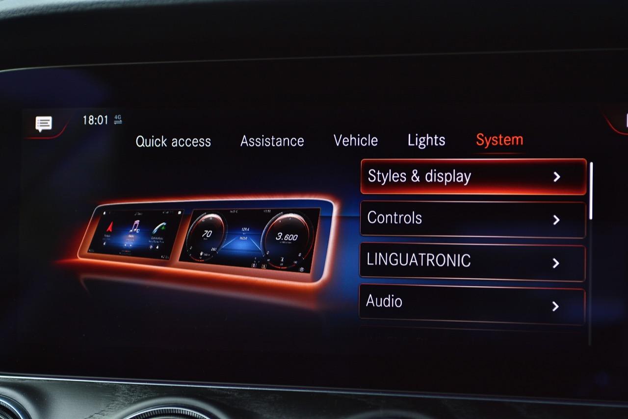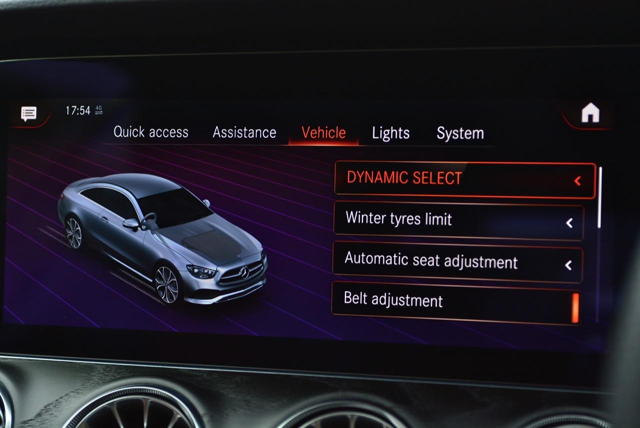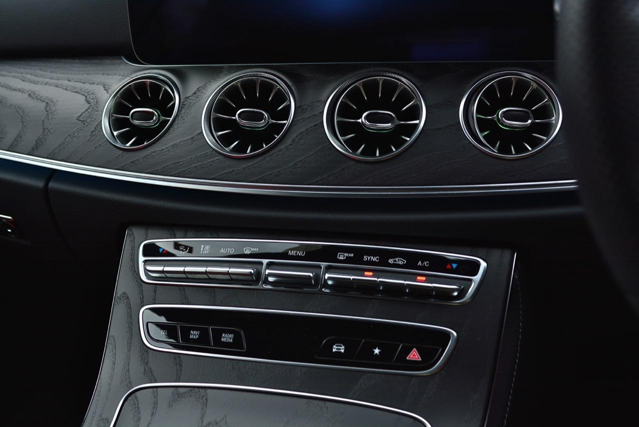 E200 Coupe AMG Dynamic ติดตั้งช่องแอร์ของระบบปรับอากาศด้วยการปรับดีไซน์ใหม่หมด โดยใช้วัสดุที่ดูคล้ายอะลูมิเนียม มาปรับแต่งชิ้นงานจนกลายเป็นช่องแอร์รูปทรงร่วมสมัย หลอดไฟ LED ในระบบไฟตกแต่ง Mercedes Benz LED Ambient Lighting เรืองแสงอยู่ภายในชุดช่องแอร์ ผู้ขับสามารถเลือกเฉดสีของไฟที่ประดับประดาอยู่ใต้ชิ้นส่วนต่างๆ มากถึง 64 เฉดสี มาตรวัดและจอแสดงผลกลางเชื่อมต่อติดกันจนมีขนาดใหญ่ จออเนกประสงค์ 12.3 นิ้ว เชื่อมต่อกันสองจอ ทั้งจอภาพมาตรวัดและจอแสดงผลส่วนกลาง จอภาพตรงหน้าคนขับ เป็นทั้งมาตรวัดที่ปรับเปลี่ยนรูปแบบได้อย่างหลากหลาย ไม่ว่าจะเป็นการวัดแบบเก่าที่มีลักษณะคล้ายเข็มวัดรอบและความเร็วที่อ่านค่าได้ง่าย กับมาตรวัดแบบยานรบต่างดาวที่โดนใจพวกสาวกหนังสตาร์วอร์ จอภาพยังควบรวมถึงจอแสดงผล MID ที่คอยแจ้งข้อมูลสำคัญ ส่วนจอมอนิเตอร์กลางของระบบต่างๆ เช่น ระบบนำทางด้วยดาวเทียม ระบบอินโฟเทนเมนท์ ระบบปรับอุณหภูมิภายใน การเชื่อมต่อกับมัลติมีเดีย การเชื่อมต่อโทรศัพท์ไร้สาย กล้องมองภาพด้านหน้าและหลัง การปรับตั้งค่าต่างๆ ของตัวรถ รวมถึงระบบให้ความบันเทิงเริงรมย์ทั้งเสียงและภาพที่มีความคมชัดสูงสุด เจ้าของบางคนอยากได้กล้องมองรอบคัน แต่ E200 Coupe ที่ขายในไทย มีแค่กล้องหน้าหลังและกล้องด้านข้างฝั่งคนขับ กับซอฟต์แวร์ที่จำลองภาพรอบรถ ทำให้สามารถกะระยะขณะถอยในที่คับแคบได้อย่างปลอดภัย