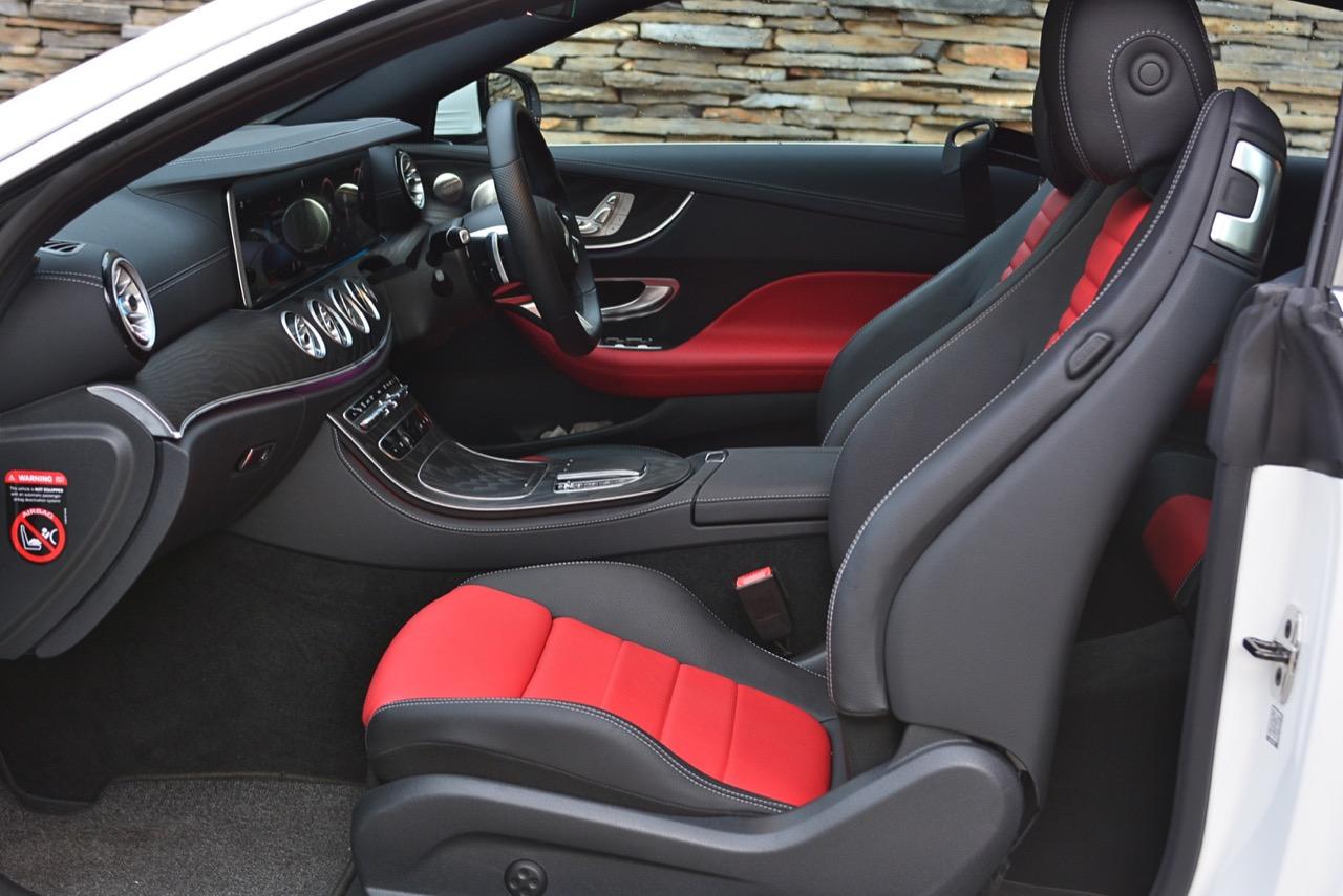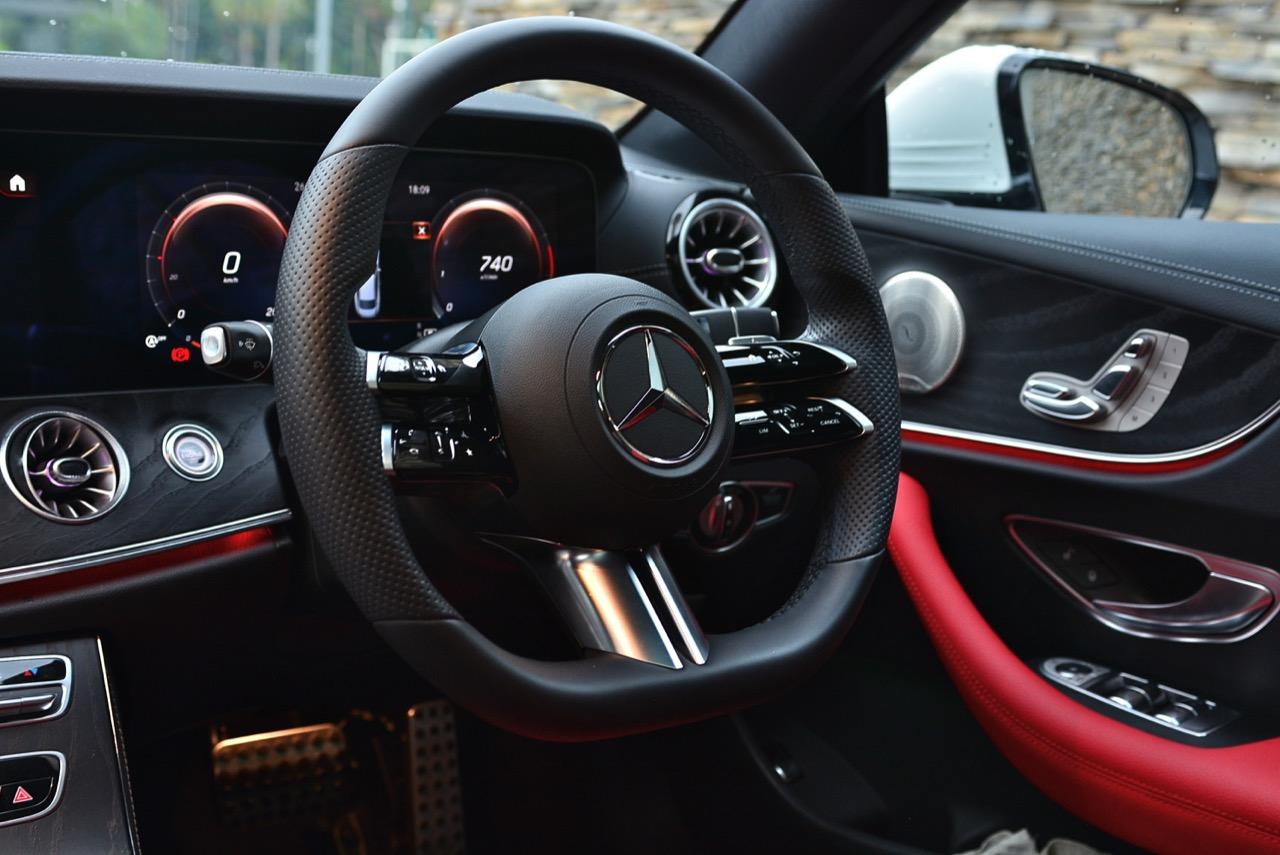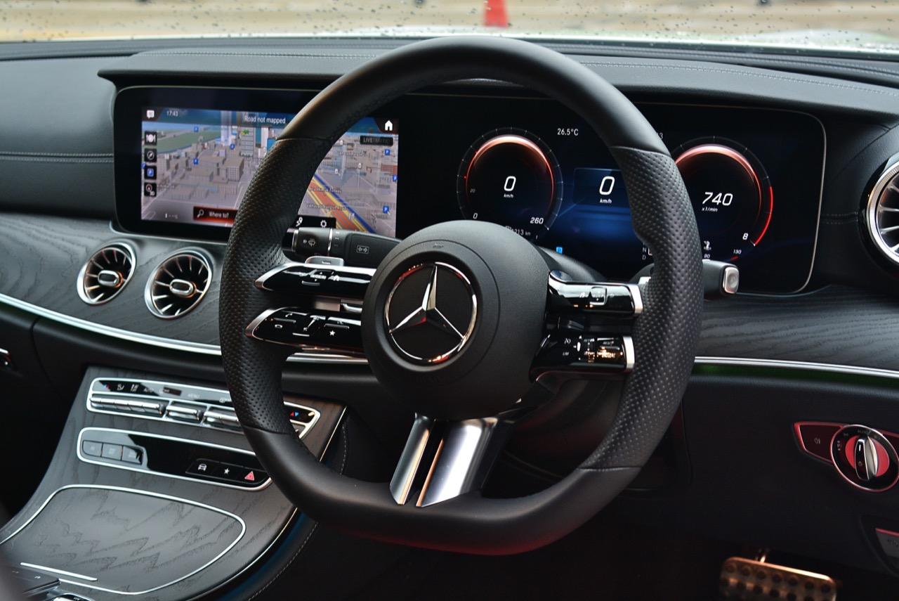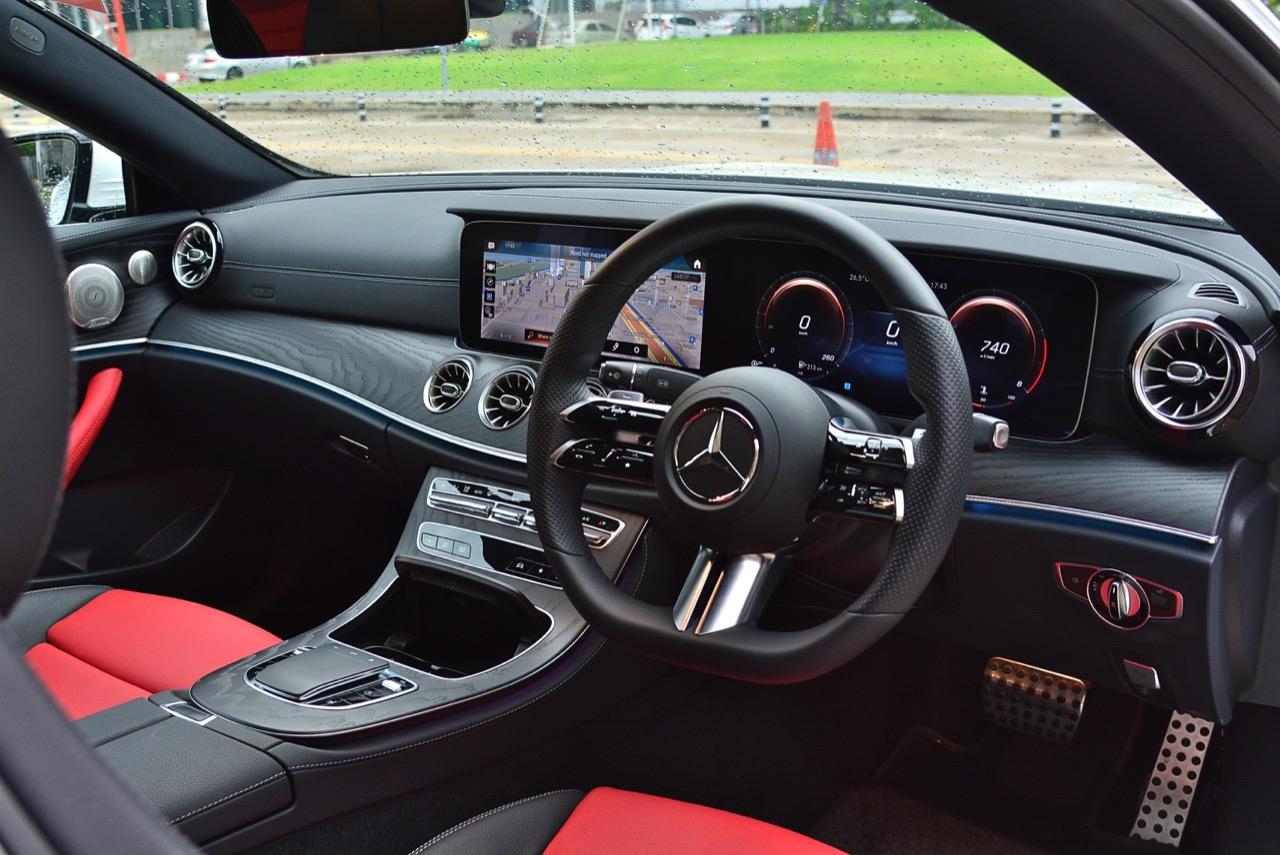 ห้องโดยสารของ E200 Facelift แทบจะไม่มีการเปลี่ยนแปลง นอกจาก MBUX แบบใหม่ กับแผงควบคุมบริเวณคอนโซลกลาง เปลี่ยนมาเป็นแบบ Touchpad พื้นที่ภายใน โดยเฉพาะพื้นที่เบาะคู่หน้า ถูกขยับขยายให้มีขนาดใหญ่อย่างมีนัยสำคัญเมื่อเทียบกับ E-Coupe รุ่นก่อนหน้านี้ มาพร้อมกับความหรูหราทันสมัย E-Coupe รุ่นใหม่ มี Cockpit กว้างขึ้น ในแง่ของพื้นที่วางเท้าด้านหลัง เช่นเดียวกับพื้นที่ใช้สอยสำหรับการเก็บสัมภาระด้านหลัง ห้องโดยสารตอนหน้า พร้อมหลังคา Panoramic Sunroof เปิด-ปิดด้วยระบบไฟฟ้า ภายในมีพื้นที่เท่ากับ New E-Class 4 ประตู ไม่ว่าจะเป็นพื้นที่วางเท้าหรือพื้นที่เหนือศีรษะ เฉดสีที่มีทั้งความนุ่มนวลและฉูดฉาด ผสมปนเปออกมาจนกลายเป็นโทนสีของห้องโดยสารที่สวยงามและดูดีมีราคา โทนสีดำสลับแดงของเบาะ สีแดงที่สลับแซมของหนังสีดำที่ใช้ห่อหุ้มเบาะ สีดำของลายไม้ที่ดูดุดัน ประดับประดาอยู่บริเวณแผงคอนโซลกลางและแผงประตู สีเงินยวงนุ่มนวลของกรวยลำโพง มีเส้นโครเมี่ยมคาดตรงแผงแดชบอร์ดที่ทำจากไม้สีดำ เป็นชิ้นงานที่คาดกลางแดชบอร์ด