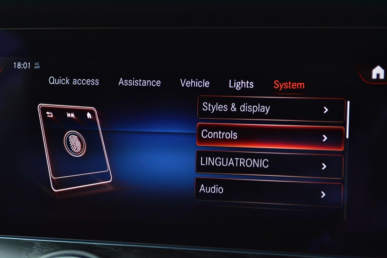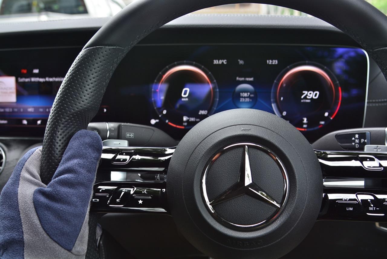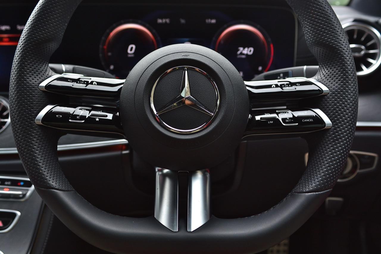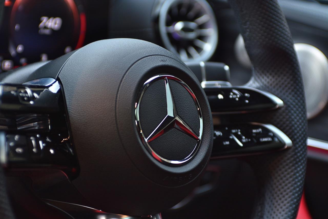 พวงมาลัย AMG แบบใหม่ กลับมาใช้ทรงแบบฐานตัดเพื่อเปิดพื้นที่ในการเข้า-ออก ก้านคู่ฝั่งซ้ายและขวาติดตั้งสวิตช์มัลติฟังก์ชั่นที่ปรับแต่งค่าต่างๆ ได้รวดเร็ว ด้านซ้าย เป็นสวิตช์ควบคุมเสียง ปุ่มรับและวางสายโทรศัพท์บลูทูธ ปุ่มสัมผัสระบบสั่งงานด้วยเสียงแบบใหม่ ก้านด้านบนของฝั่งซ้ายยังมีปุ่มเลือกเมนูต่างๆ ส่วนก้านวงด้านขวา เป็นที่อยู่ของระบบปรับตั้งความเร็วอัตโนมัติ Adaptive Cruise Control ก้านด้านบนสุดเป็นปุ่มที่ใช้ในการปรับตั้งหน้าจอ ผสมผสานการทำงานในจอภาพมาตวัด ทั้งการเลือกแสดงผลระบบนำทางด้วยดาวเทียมขึ้นไปไว้ในจอภาพมาตรวัด การแสดงผลอัตราสิ้นเปลือง เลือกฟังก์ชั่นในระบบอินโฟเทนเมนท์ และอื่นๆ อีกเพียบใช้งานไม่หมดเพราะให้มาเยอะมาก