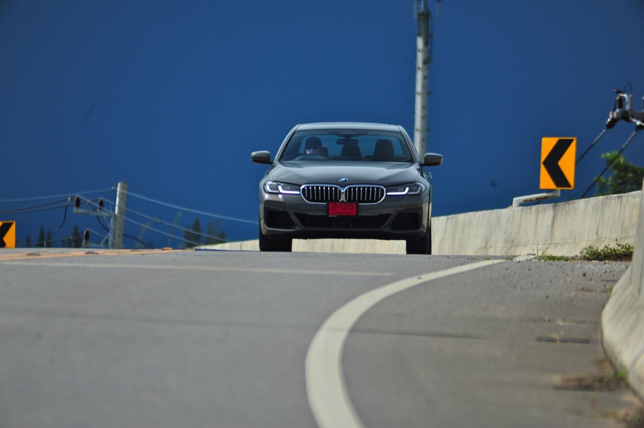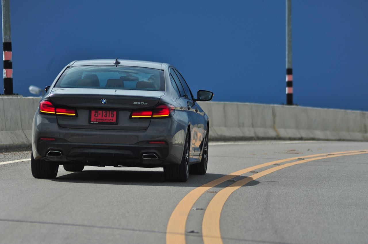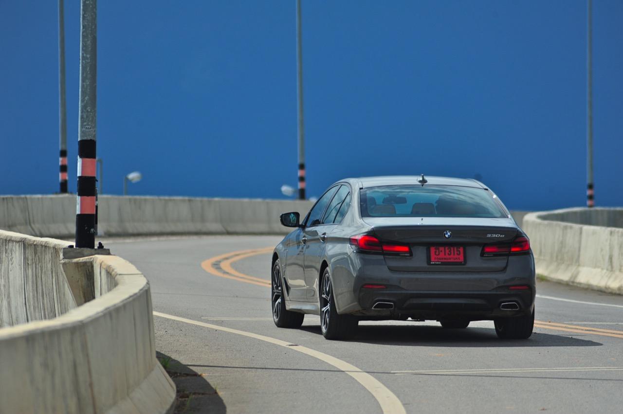บนเส้นทางในแถบปากน้ำปรานไปจนถึงสามร้อยยอด BMW 530e LCI ขับได้อย่างคล่องแคล่ว ราวกับรถรุ่นน้องที่เล็กกว่าอย่าง Series-3 f30 จุดเด่นดังกล่าวเกิดจากน้ำหนักตัวเบาแค่ 1.7 ตัน กับชุดบังคับเลี้ยวไฟฟ้า BMW Servotronic ที่มาดมั่น การบังคับทิศทางของรถ ให้ความรู้สึกถึงขนาดที่เล็กเกินความเป็นจริง จากการเซตค่าแปรผันของพวงมาลัยที่ BMW มีความเชี่ยวชาญ พวงมาลัยไฟฟ้าที่ใช้มอเตอร์และวาล์วควบคุมแรงดันน้ำมันคอยปรับน้ำหนักของพวงมาลัยไปตามความเร็วและสภาพเส้นทาง ขับช้าพวงมาลัยจะเบาสบายมือแต่ยังคงความแม่นยำในระดับสูงสุด ขับเร็วขึ้นในโหมด Sport พวงมาลัยแสนรู้ของ 530e จะปรับน้ำหนักให้สอดคล้องกับความเร็วทำให้ควบคุมได้ง่ายขึ้นมาก การขับทางตรงบนไฮเวย์ด้วยความเร็วสูงไม่ต้องคอยมานั่งประคองพวงมาลัยให้เสียอารมณ์ ความมั่นคงของพวงมาลัยที่เริ่มกระชับรัดกุมขึ้นเรื่อยๆ จนรู้สึกได้เมื่อตัวเลขความเร็วเพิ่มขึ้นช่วยทำให้เกิดความมั่นใจ เจ้าของ Series-5 ทุกคนชอบขับรถเร็วอยู่แล้ว พอมาเจอเข้ากับการทรงตัวในย่านความเร็วสูงที่ดีเยี่ยม รวมถึงพวงมาลัยที่มีน้ำหนักมั่นคงในย่านความเร็วสูง ก็ลืมความประหยัดและจัดกันแบบเต็มสูบ จ่ายเงินเกือบๆ 4 ล้านบาทจะให้มาขับหยอดๆ ย่องๆ คงไม่ใช่เรื่องที่ถูกต้องนัก