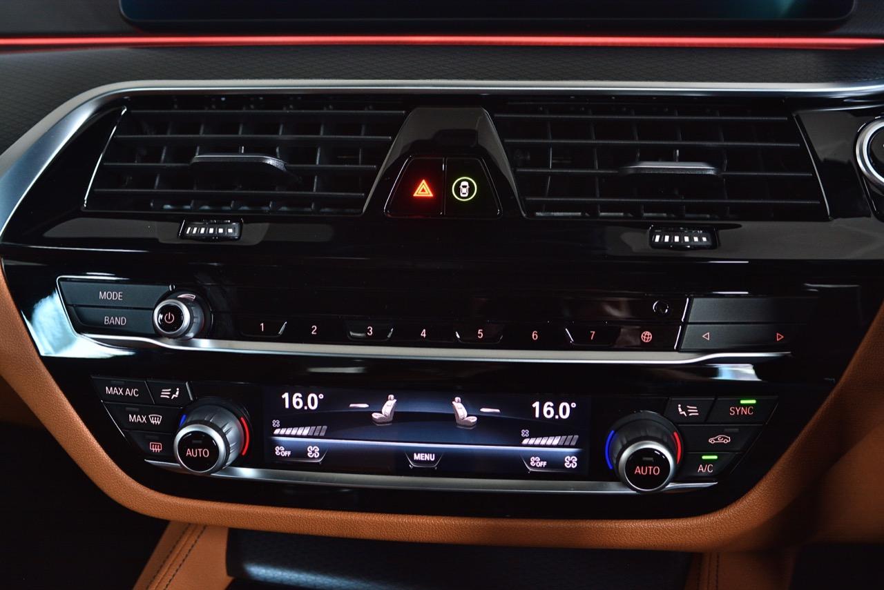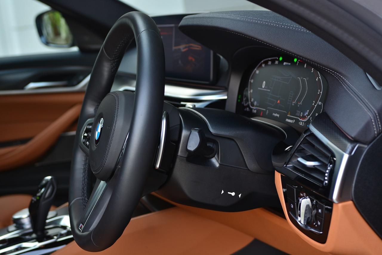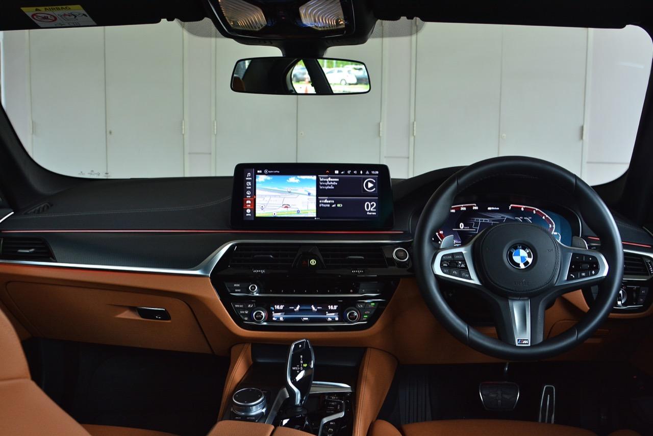 พวงมาลัย M-Sport แบบสามก้าน ทำจากวัสดุเกรดสูง ไม่ว่าจะเป็นหนังแท้ที่ใช้หุ้มรอบวงที่ค่อนข้างอวบอ้วนทำให้จับได้อย่างถนัดมือ ก้านวงติดตั้งสวิตช์สั่งงานต่างๆ ของระบบเครื่องเสียง การเลือกดูข้อมูลในจอภาพ MID รับหรือวางสายโทรศัพท์แบบบลูทูธ ปุ่มควบคุมปรับตั้งความเร็วอัตโนมัติ Cruise Control และที่ขาดไม่ได้สำหรับ Series-5 เวอร์ชั่น M-Sport ก็คือแป้นเปลี่ยนตำแหน่งเกียร์หลังพวงมาลัยหรือ Paddle Shift ใน 530e นั้นขนาดของแป้นเปลี่ยนเกียร์รวมถึงวัสดุที่ใช้ทำตัวแป้นนั้นจัดออกมาได้สวยงามน่าใช้งาน แทบจะคล้ายกับ Paddle ของ BMW M5 กันเลยทีเดียว พวงมาลัยปรับไฟฟ้าได้ 4 ทิศทางครอบคลุมท่านั่งและสรีระของคนขับทั้งหมดไม่ว่าจะอ้วนเตี้ยสูงโย่งหรือมีหุ่นแบบนายแบบนางแบบก็ปรับและขับได้อย่างถนัดรัดกุม ที่ชอบก็คือ พวงมาลัยจะยกตัวเมื่อดับเครื่องยนต์แล้วเปิดประตู เพื่อเปิดพื้นที่ออกจากห้องโดยสาร ฟังก์ชั่นประตูดูด ช่วยเพิ่มความสบายไม่ต้องออกแรงปิดประตูเหมือนรุ่นเก่า